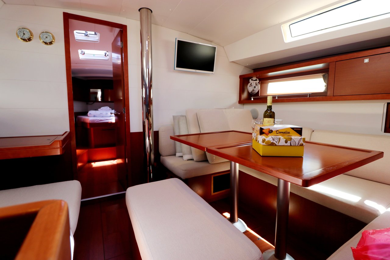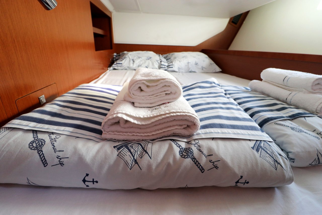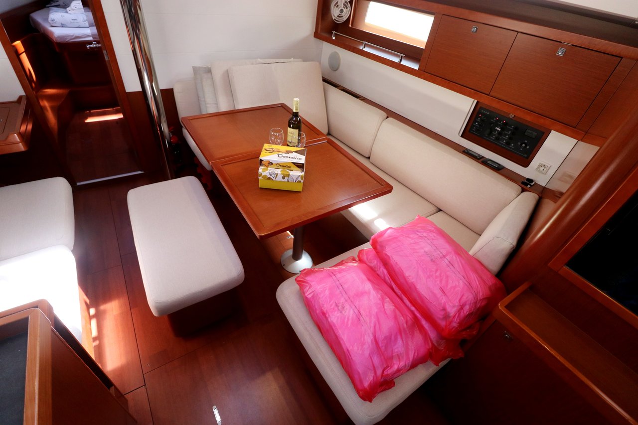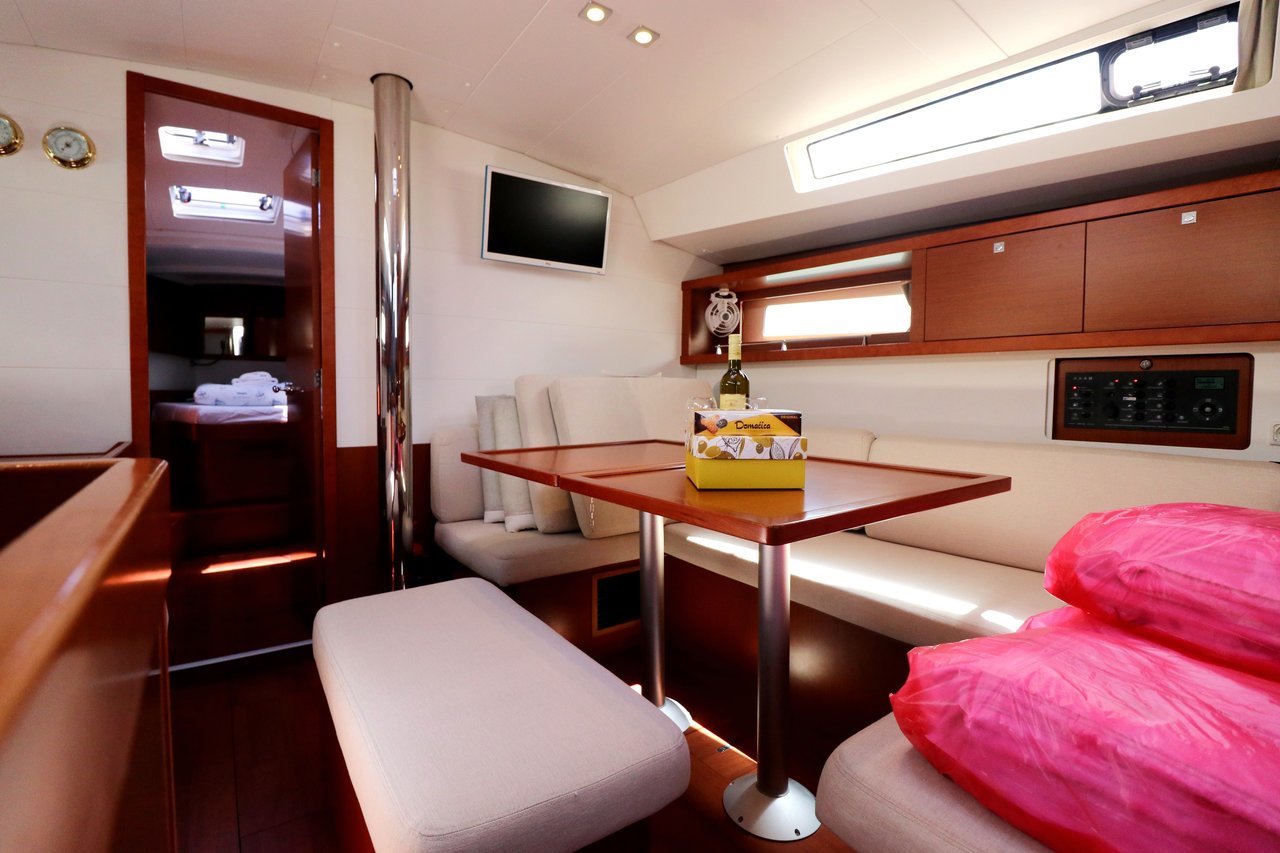 | Outside | 220 V-Landanschluss, Anker mit Kette, Badeplattform, Biminitop, Cockpitdusche, Cockpitkühlschrank, Cockpitlautsprecher, Cockpitpolster, elektr. Ankerwinsch, Fender, Festmacherleinen, Gangway, Sprayhood, Teak im Cockpit, Teakdeck |