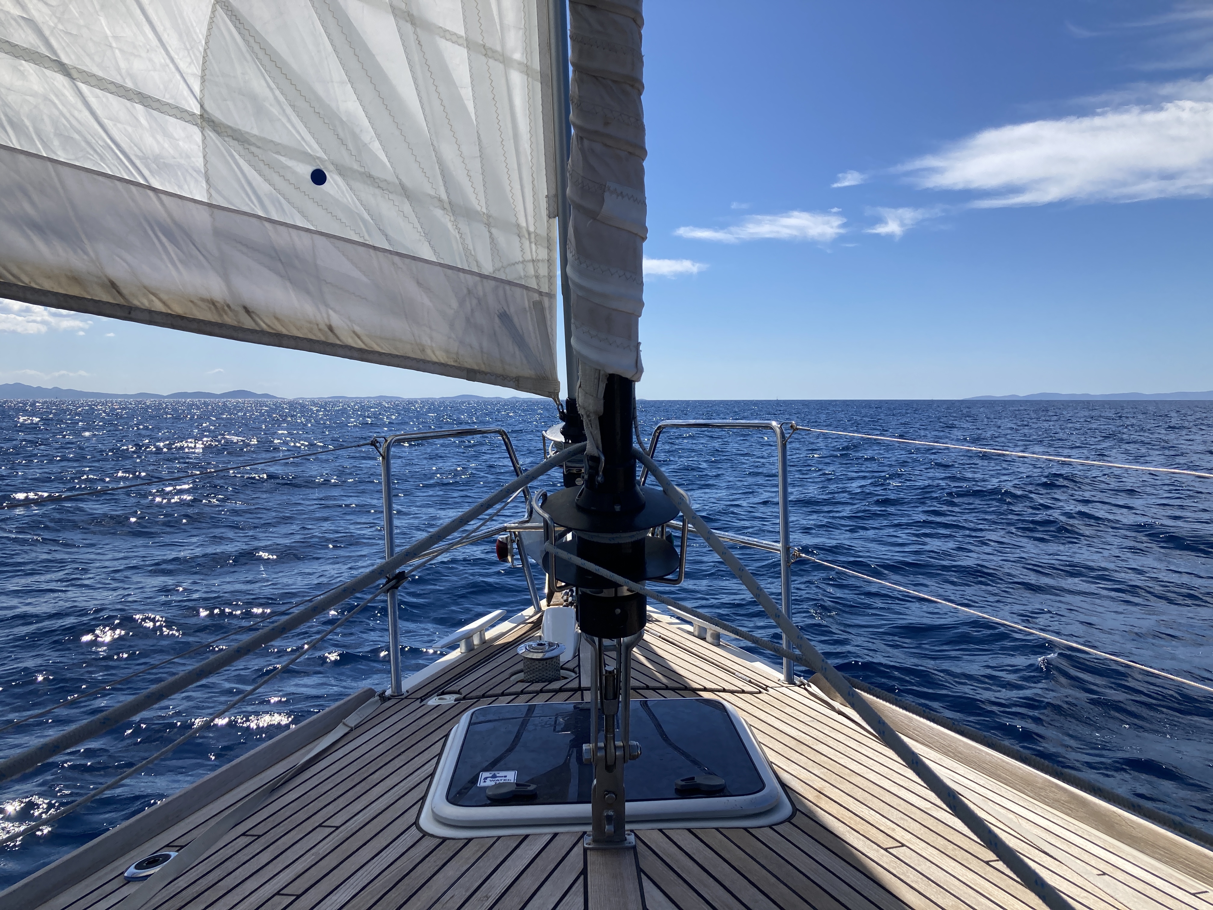 Einziges technisches Problem war, dass das Großsegel nicht von alleine in die Lazyjacks fiel, sondern beim Bergen etwa auf der Hälfte des Mastes stecken blieb und dann manuell geborgen werden musste. Bei schwachem Wind in dieser Woche jedoch kein Problem. Bei starkem Wind jedoch sicherlich schwierig.