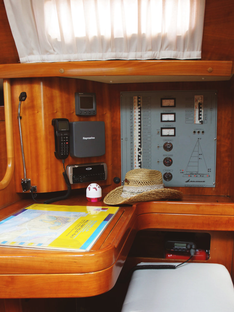 | Navigation | Echolot, Fernglas, GPS mit Kartenplotter, Hafenhandbücher, Handpeilkompass, Kompass, Seekarten, Tridata (Log, Echolot, Windm.), Windmesser |