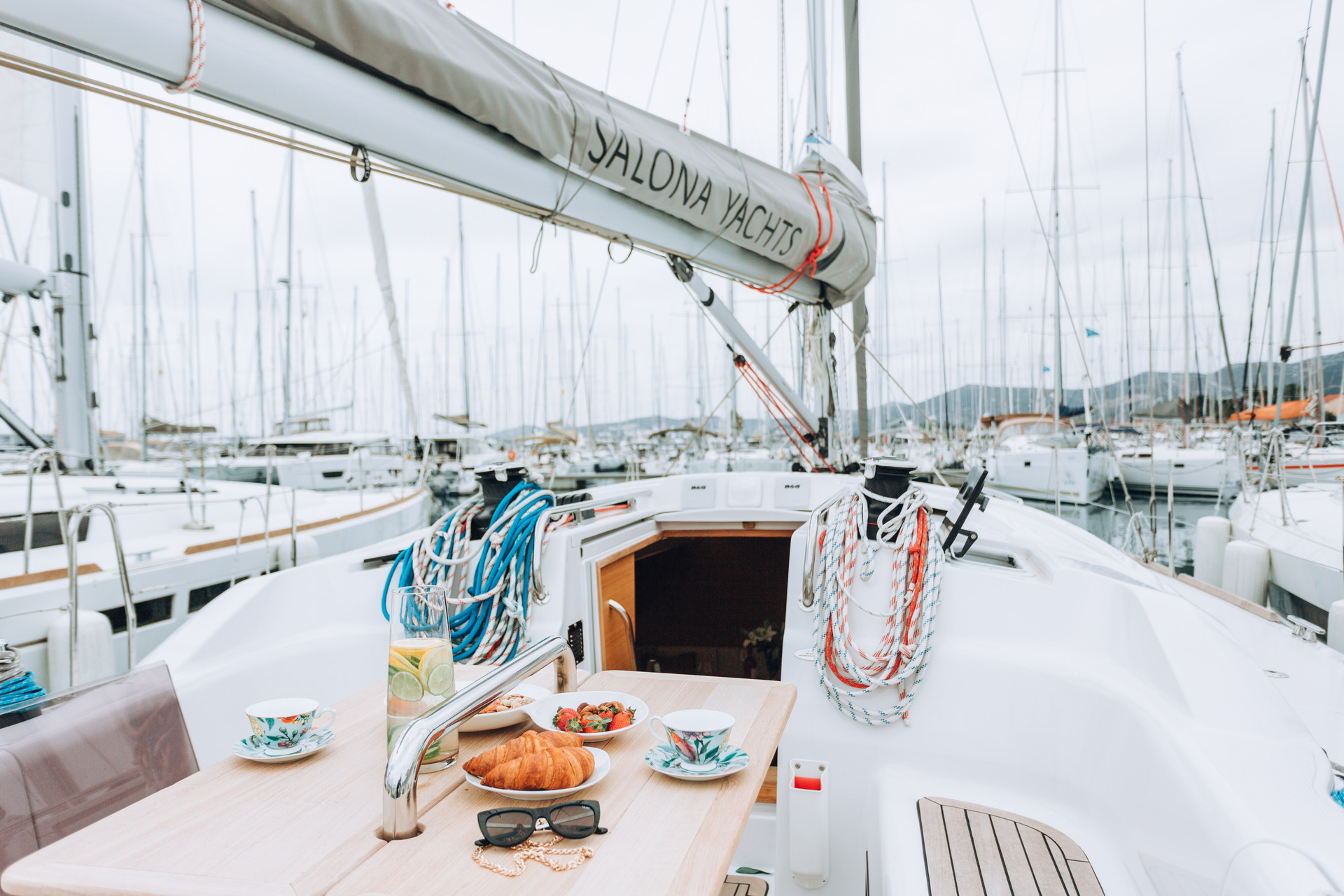| Outside | Biminitop, Cockpitdusche, Cockpitpolster, Cockpittisch, elektr. Ankerwinsch, elektr. Winsch, Sonnensegel, Sprayhood, Teak im Cockpit |