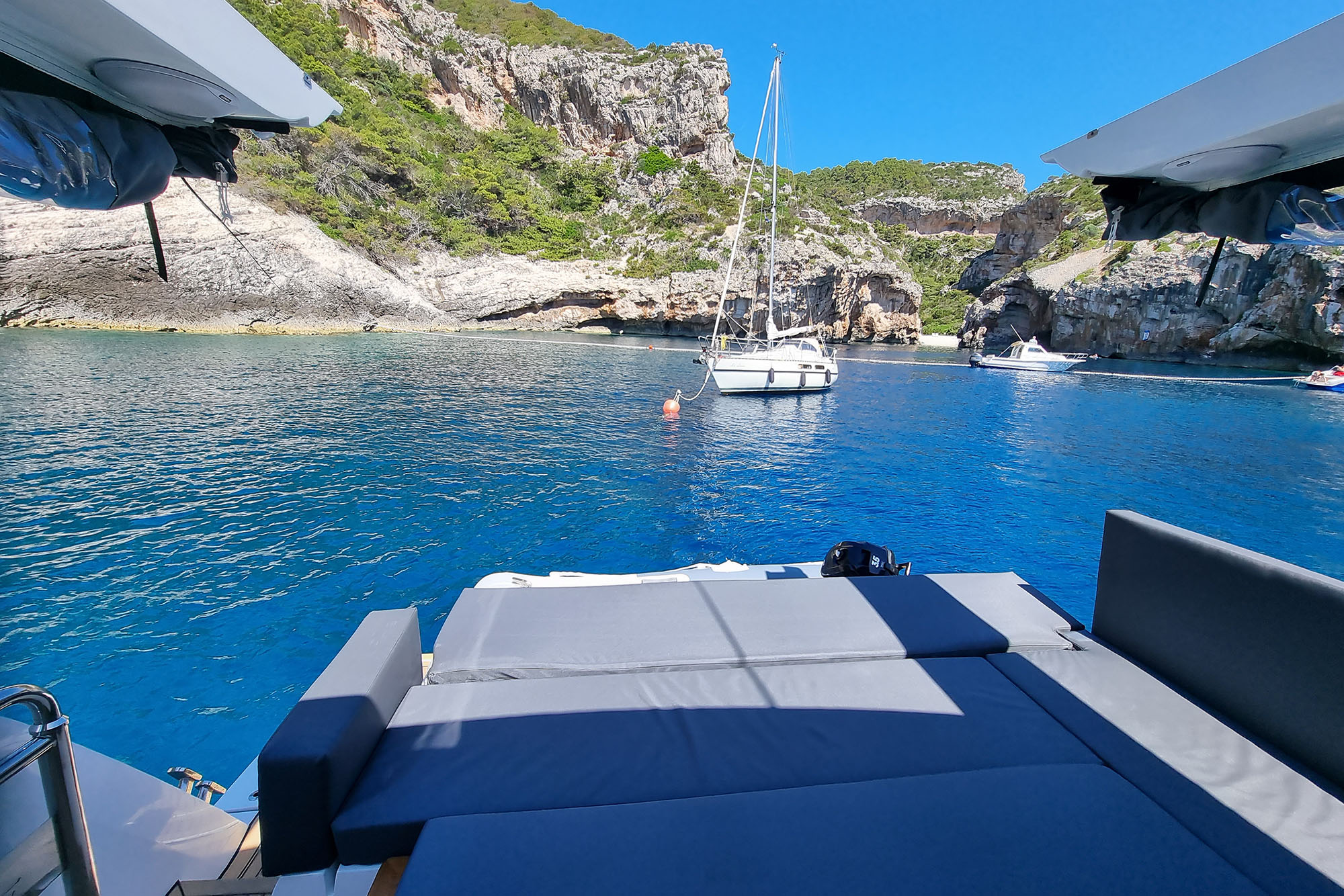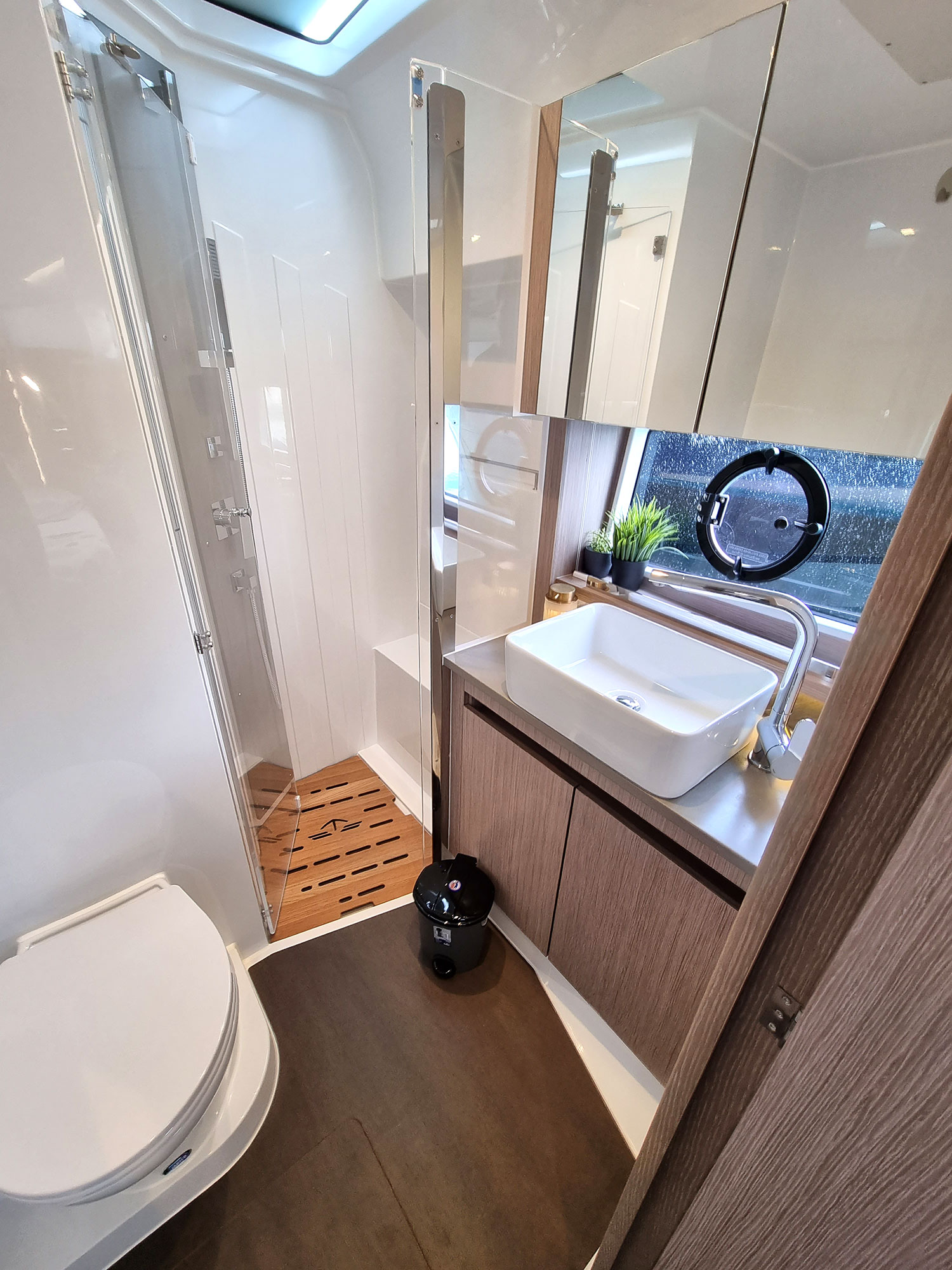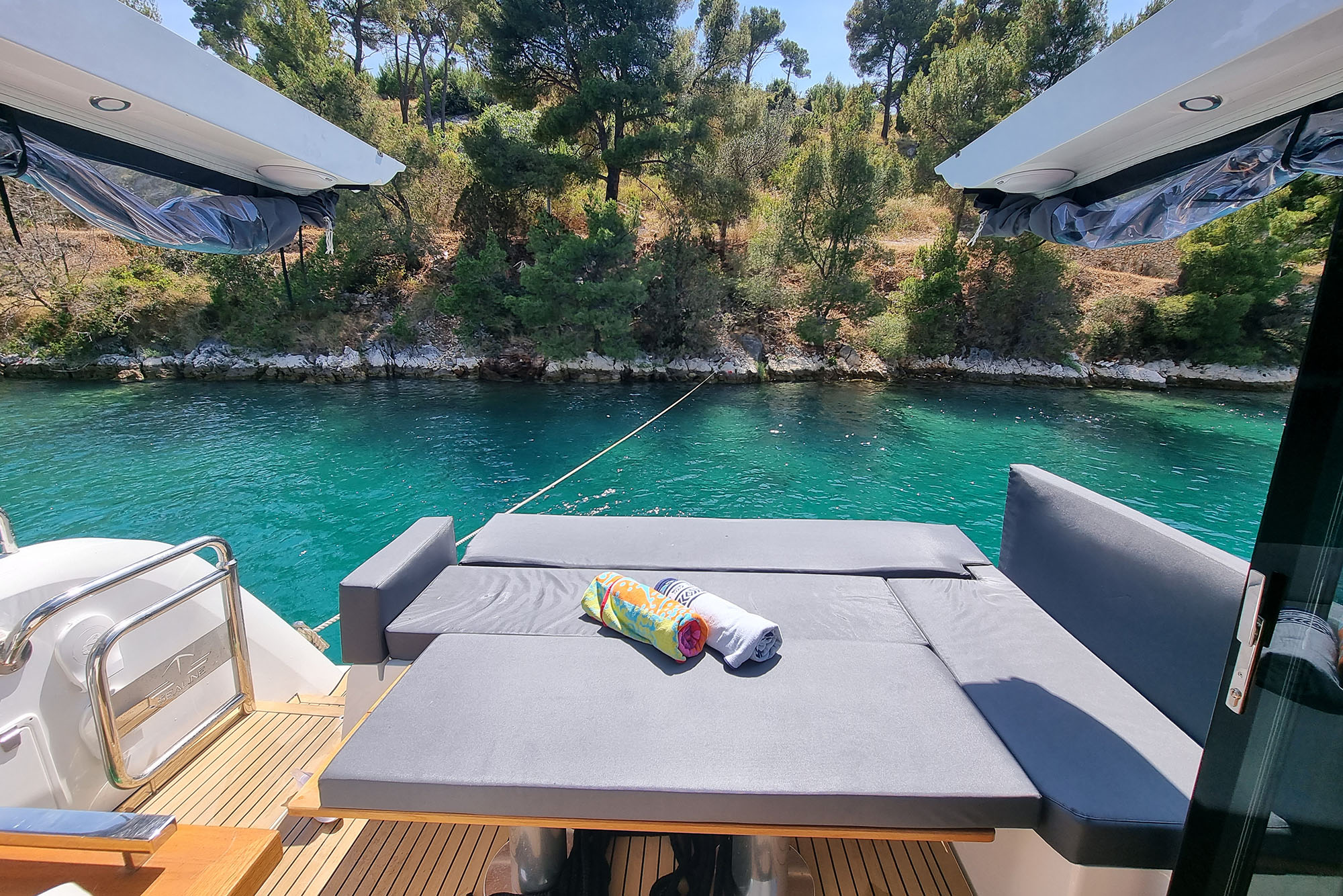 | Outside | Badeplattform, Badeplattform (hydr.), Cockpitdusche, Cockpitlautsprecher, elektr. Ankerwinsch, Sonnensegel, Teak im Cockpit, Unterwasserbeleuchtung |