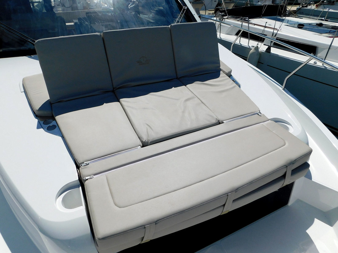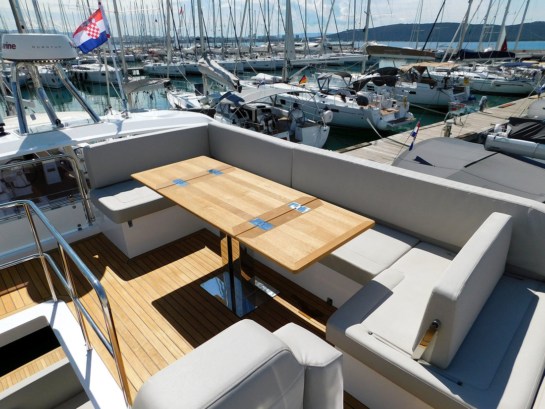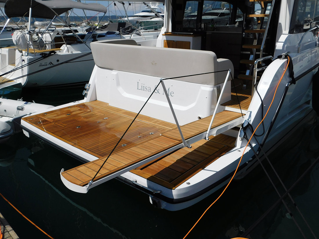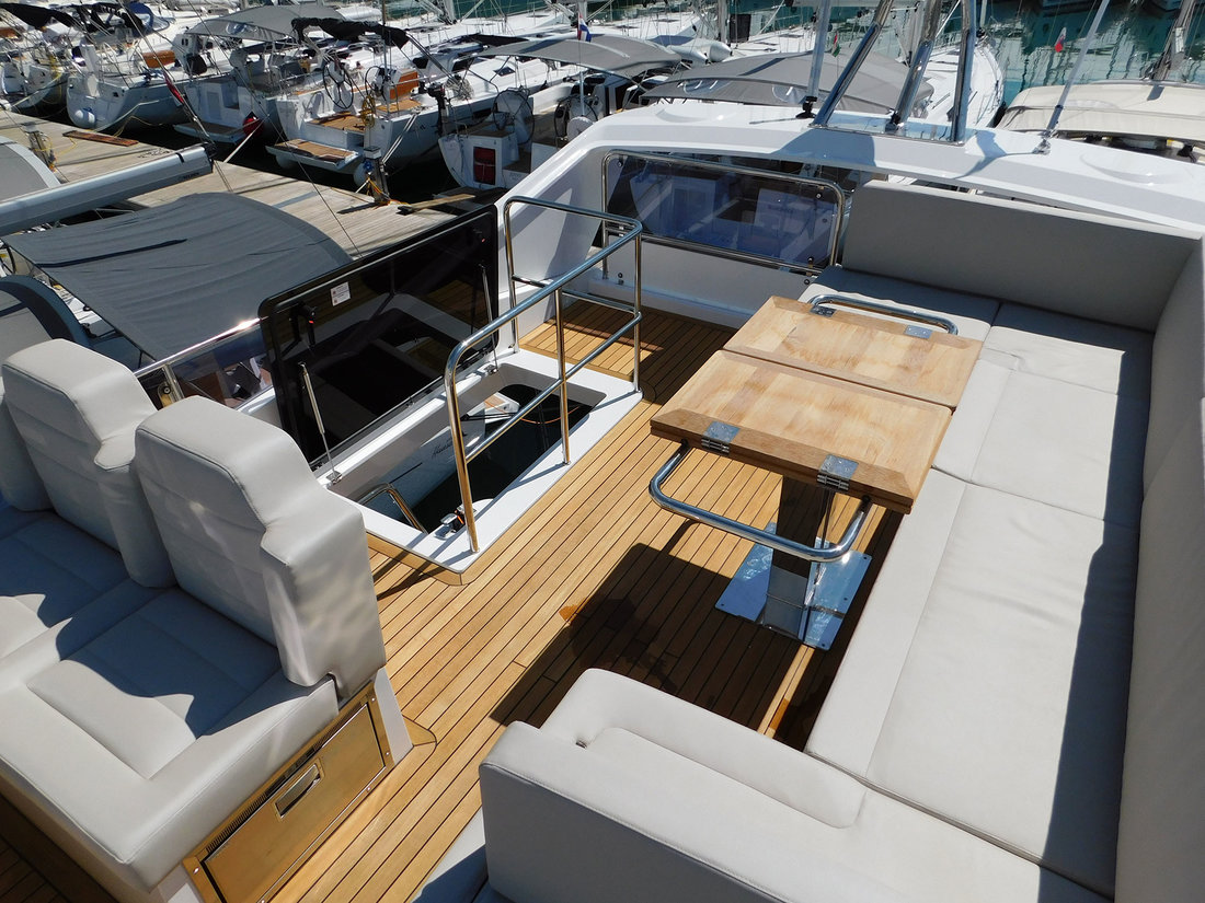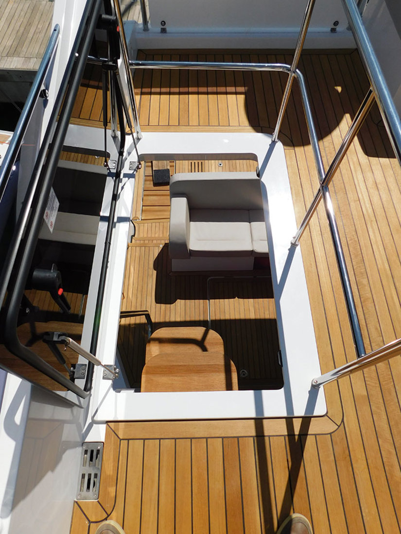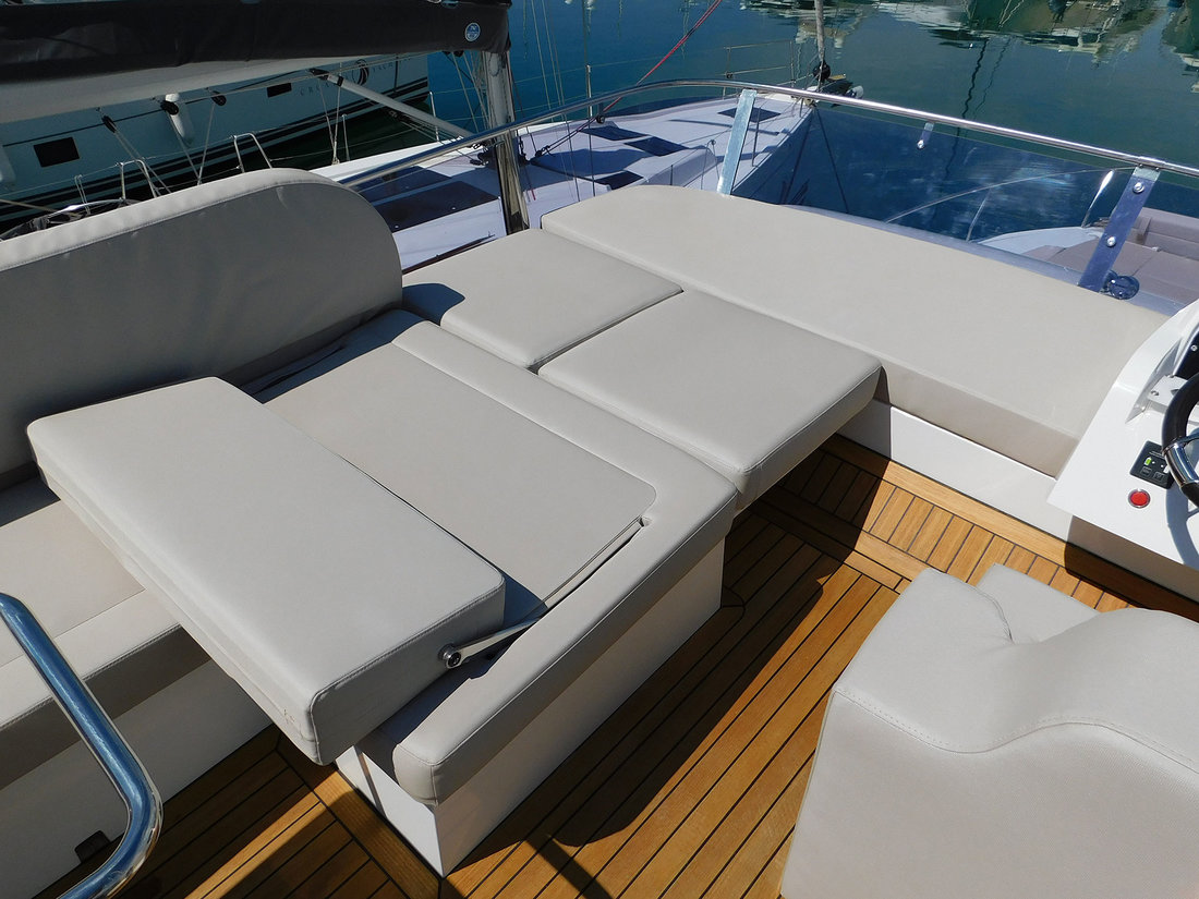 | Outside | Badeleiter, Badeplattform, Biminitop, Cockpitlautsprecher, Deckpolster, elektr. Ankerwinsch, Flybridge, hydraul. Gangway, Kühlschrank auf Flybridge, Sonnendeck, Teak auf Badeplattform, Teak auf Flybridge, Teak im Cockpit |
