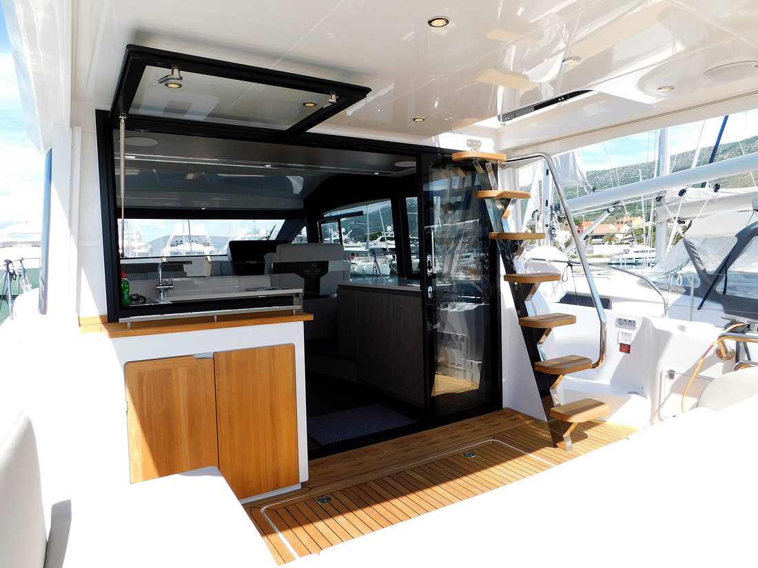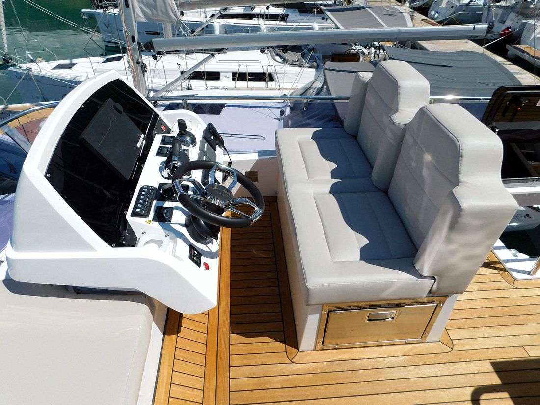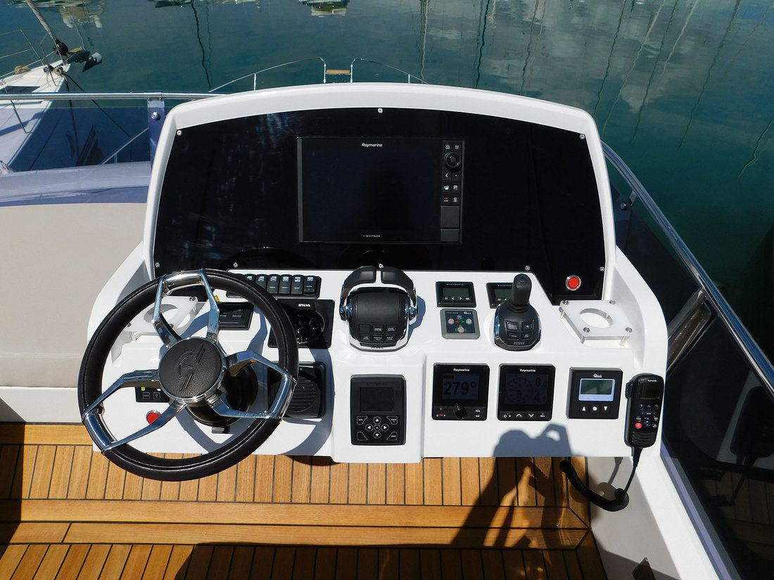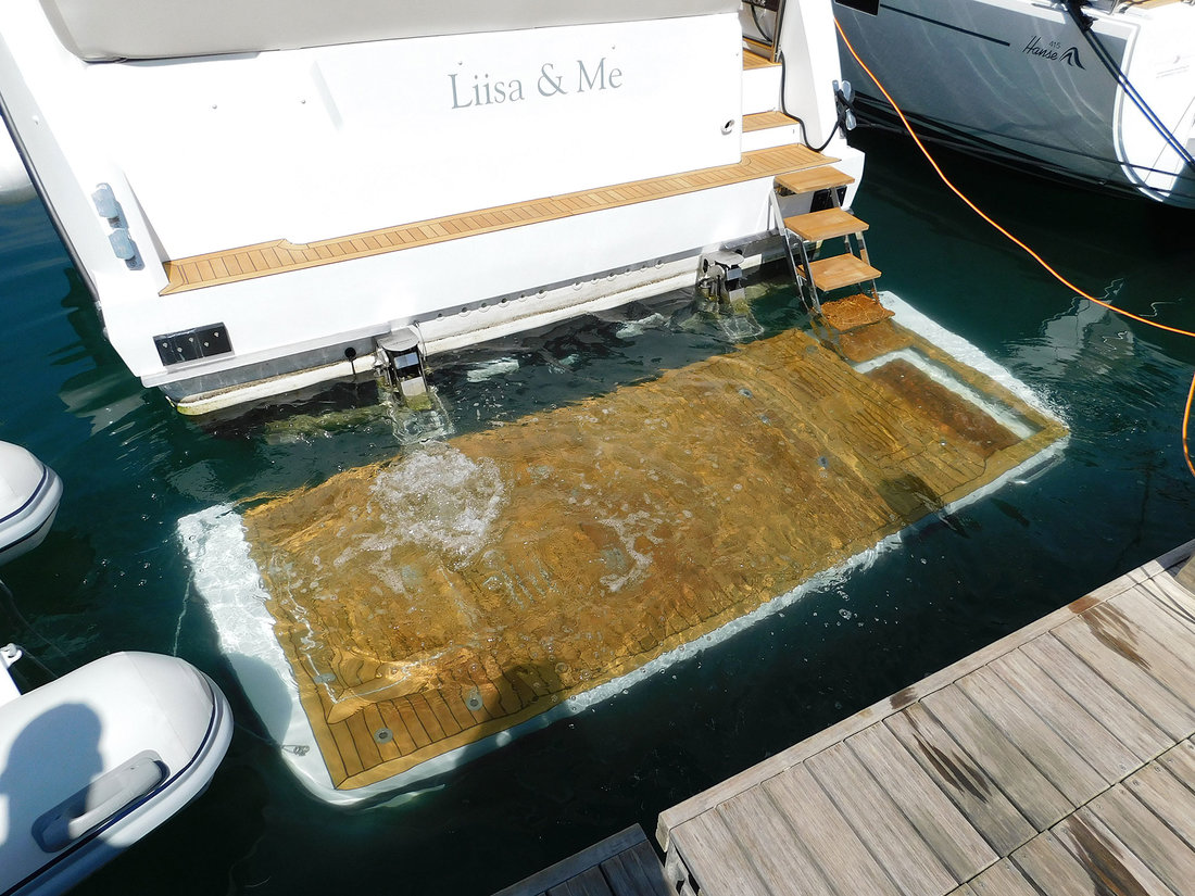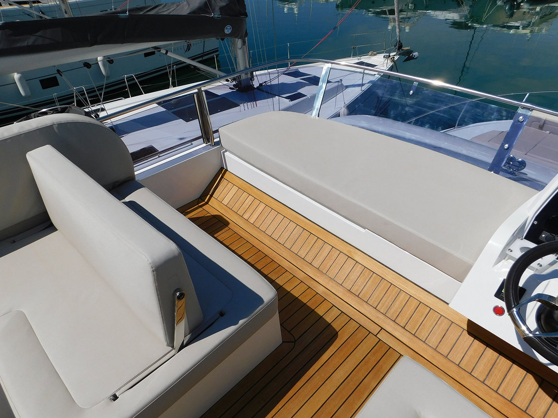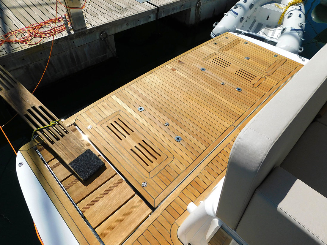 | Outside | Badeleiter, Badeplattform, Biminitop, Cockpitlautsprecher, Deckpolster, elektr. Ankerwinsch, Flybridge, hydraul. Gangway, Kühlschrank auf Flybridge, Sonnendeck, Teak auf Badeplattform, Teak auf Flybridge, Teak im Cockpit |