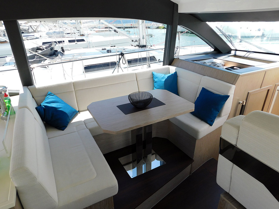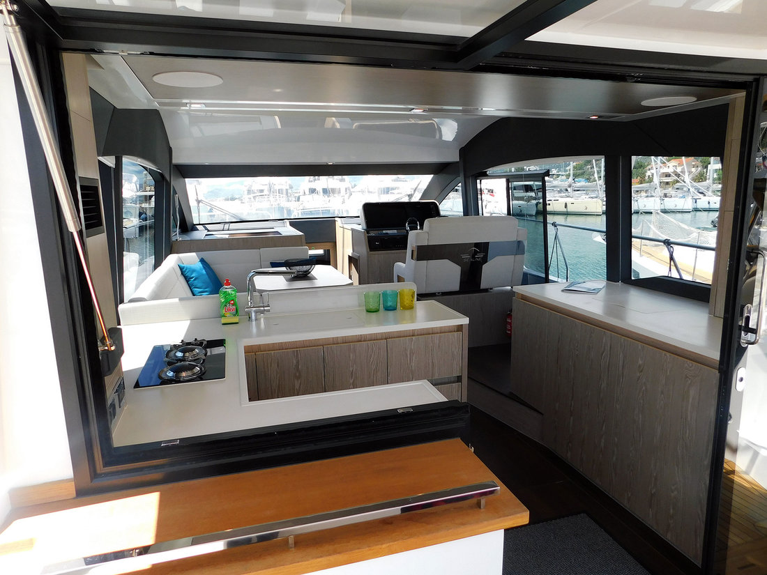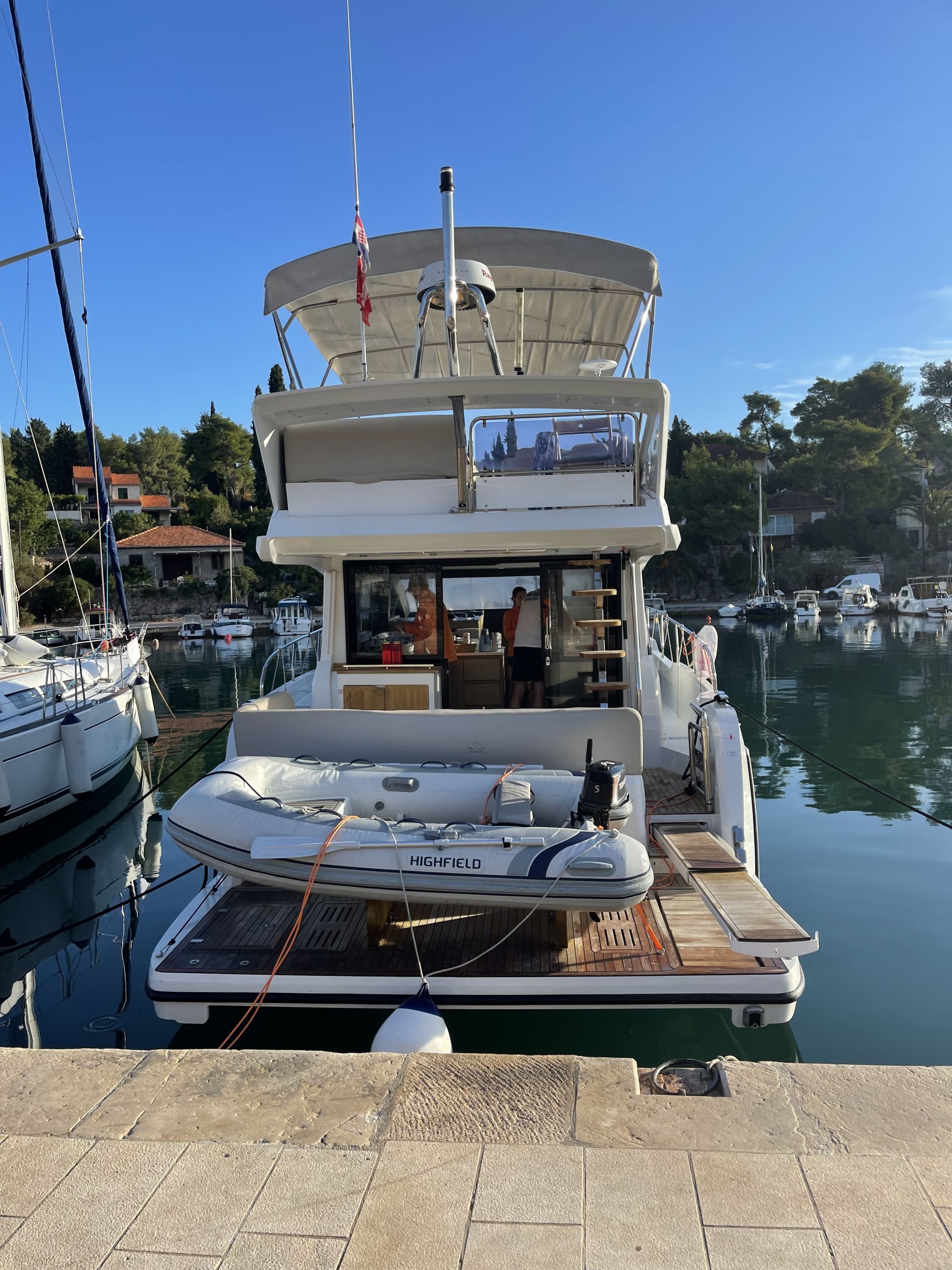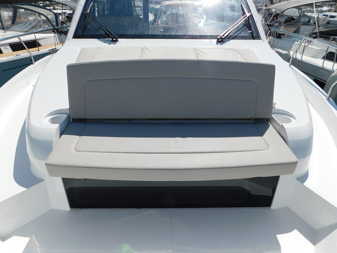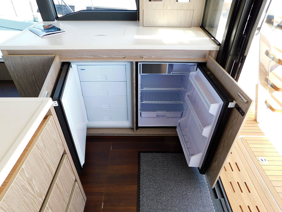 | Outside | Badeleiter, Badeplattform, Biminitop, Cockpitlautsprecher, Deckpolster, elektr. Ankerwinsch, Flybridge, hydraul. Gangway, Kühlschrank auf Flybridge, Sonnendeck, Teak auf Badeplattform, Teak auf Flybridge, Teak im Cockpit |