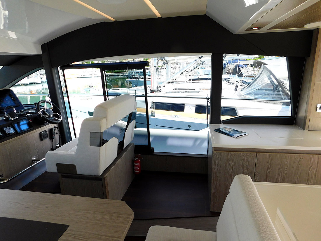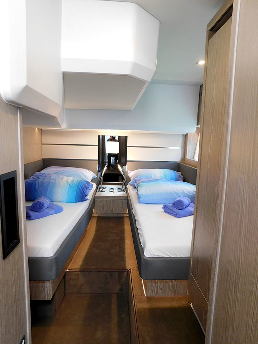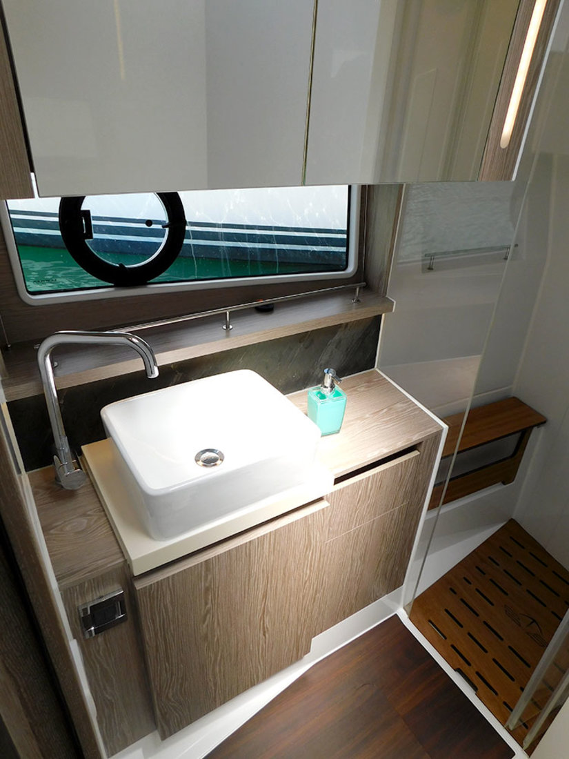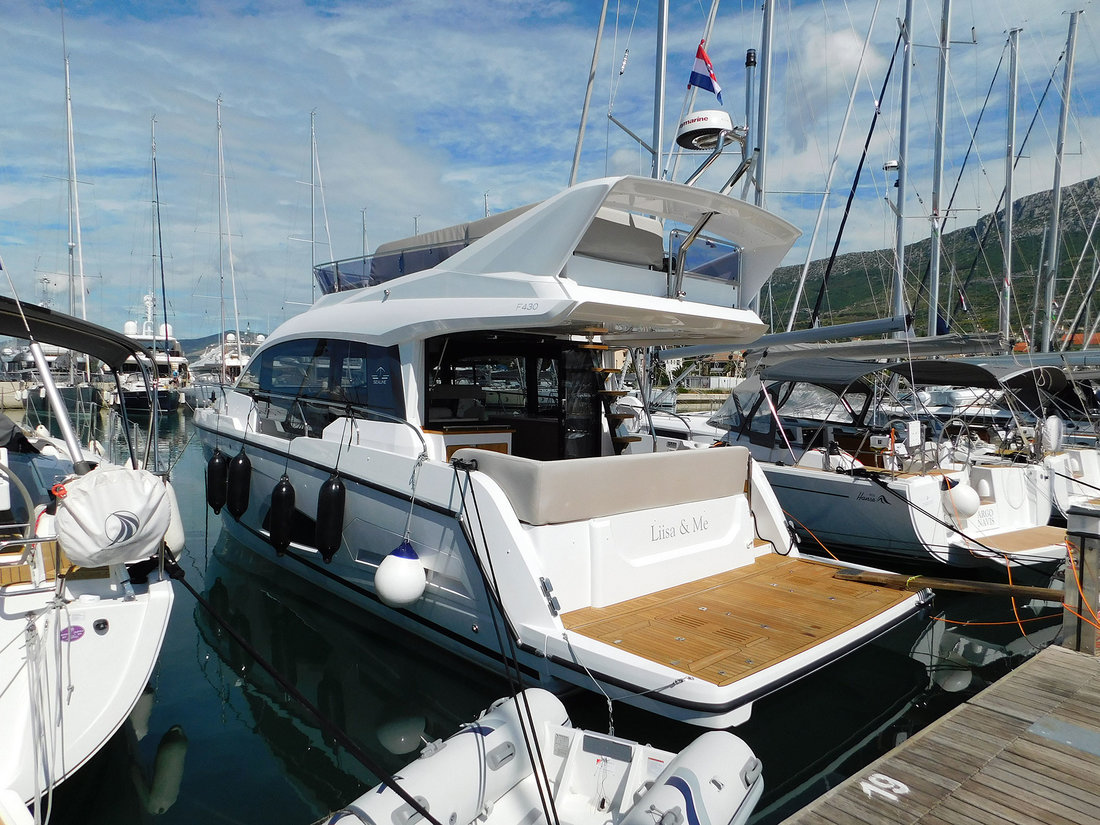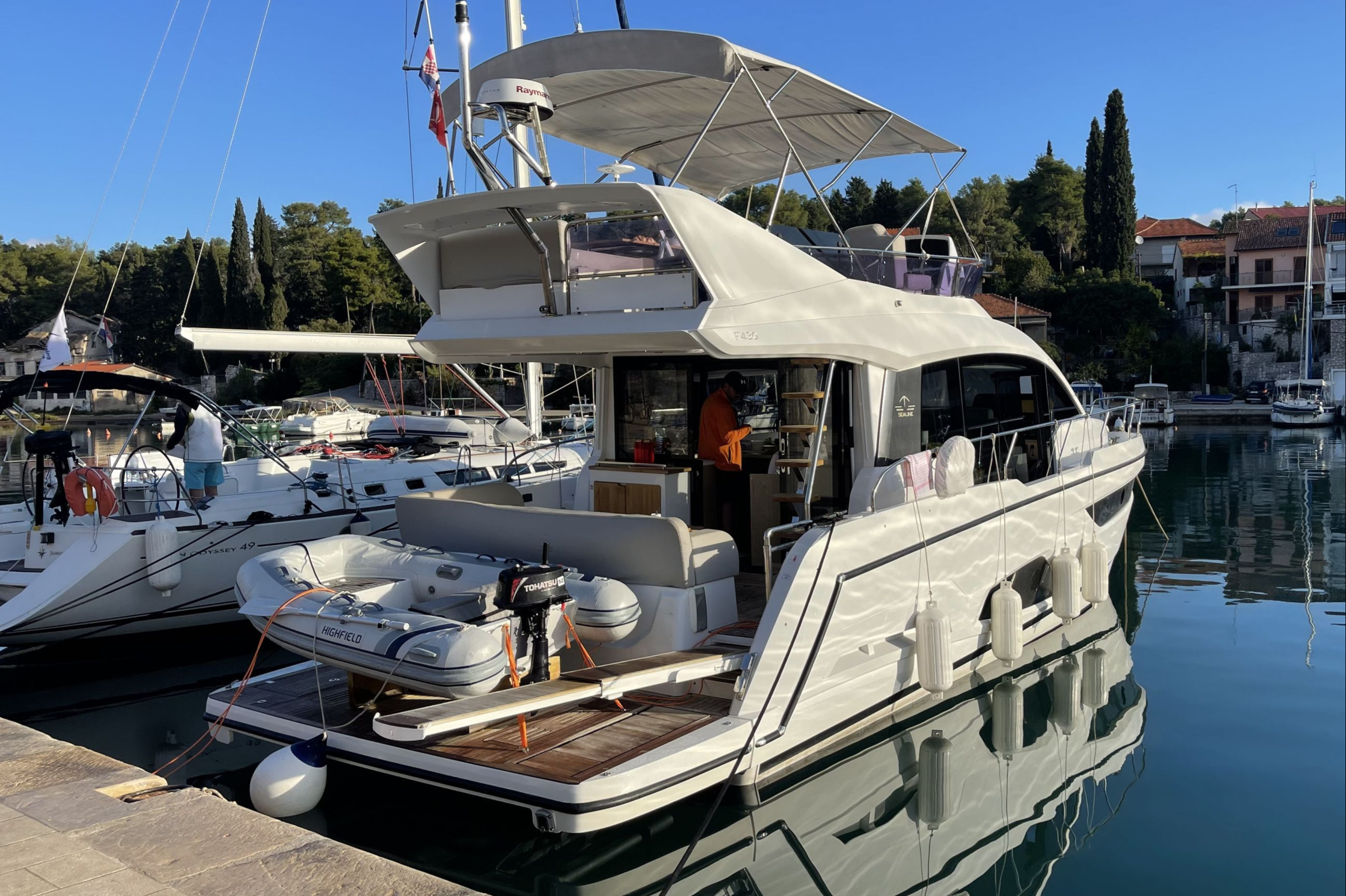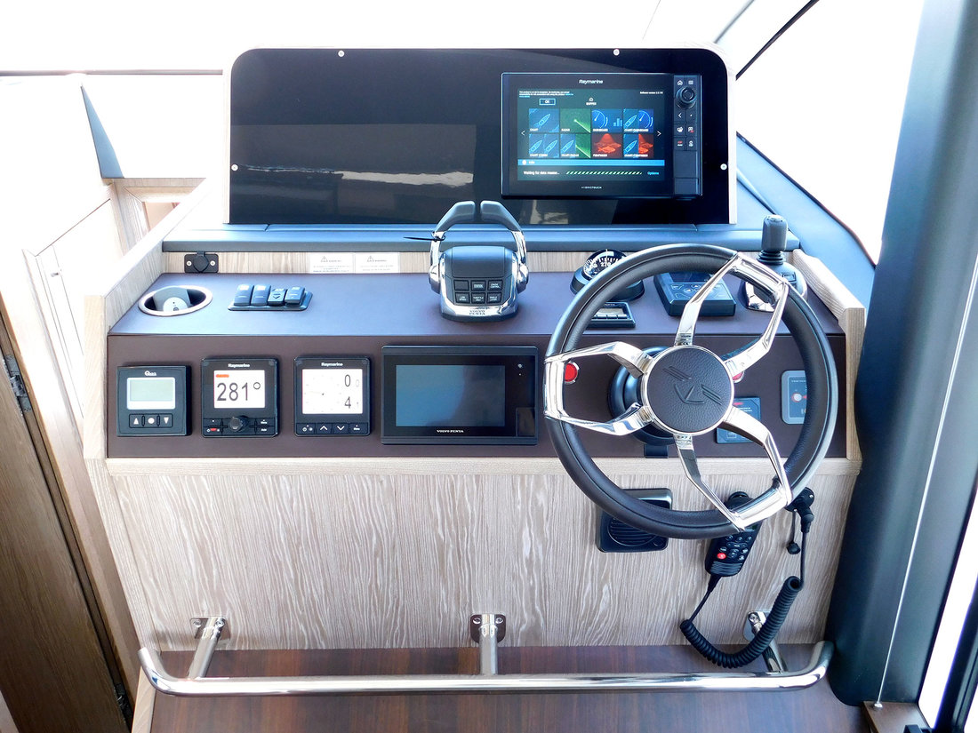 | Outside | Badeleiter, Badeplattform, Biminitop, Cockpitlautsprecher, Deckpolster, elektr. Ankerwinsch, Flybridge, hydraul. Gangway, Kühlschrank auf Flybridge, Sonnendeck, Teak auf Badeplattform, Teak auf Flybridge, Teak im Cockpit |