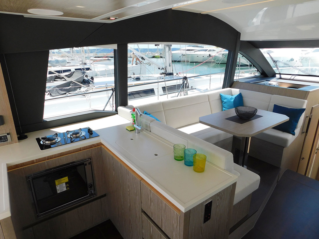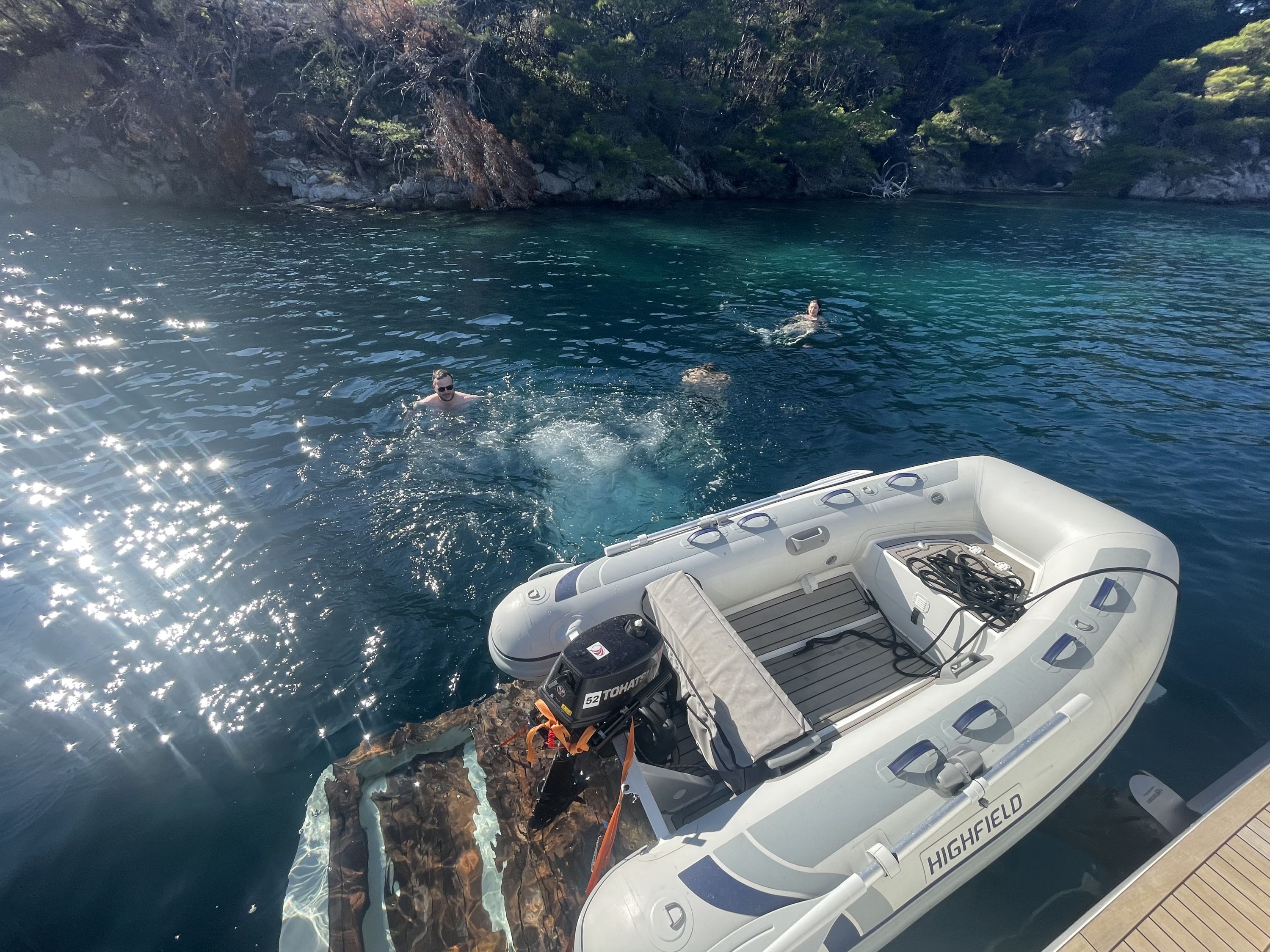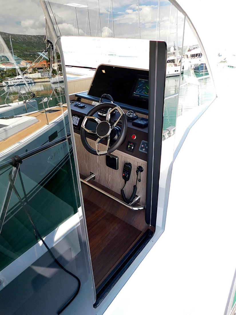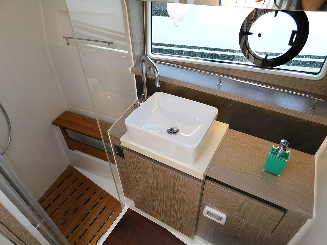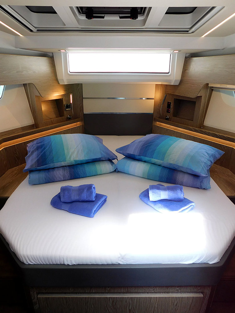| Outside | Badeleiter, Badeplattform, Biminitop, Cockpitlautsprecher, Deckpolster, elektr. Ankerwinsch, Flybridge, hydraul. Gangway, Kühlschrank auf Flybridge, Sonnendeck, Teak auf Badeplattform, Teak auf Flybridge, Teak im Cockpit |