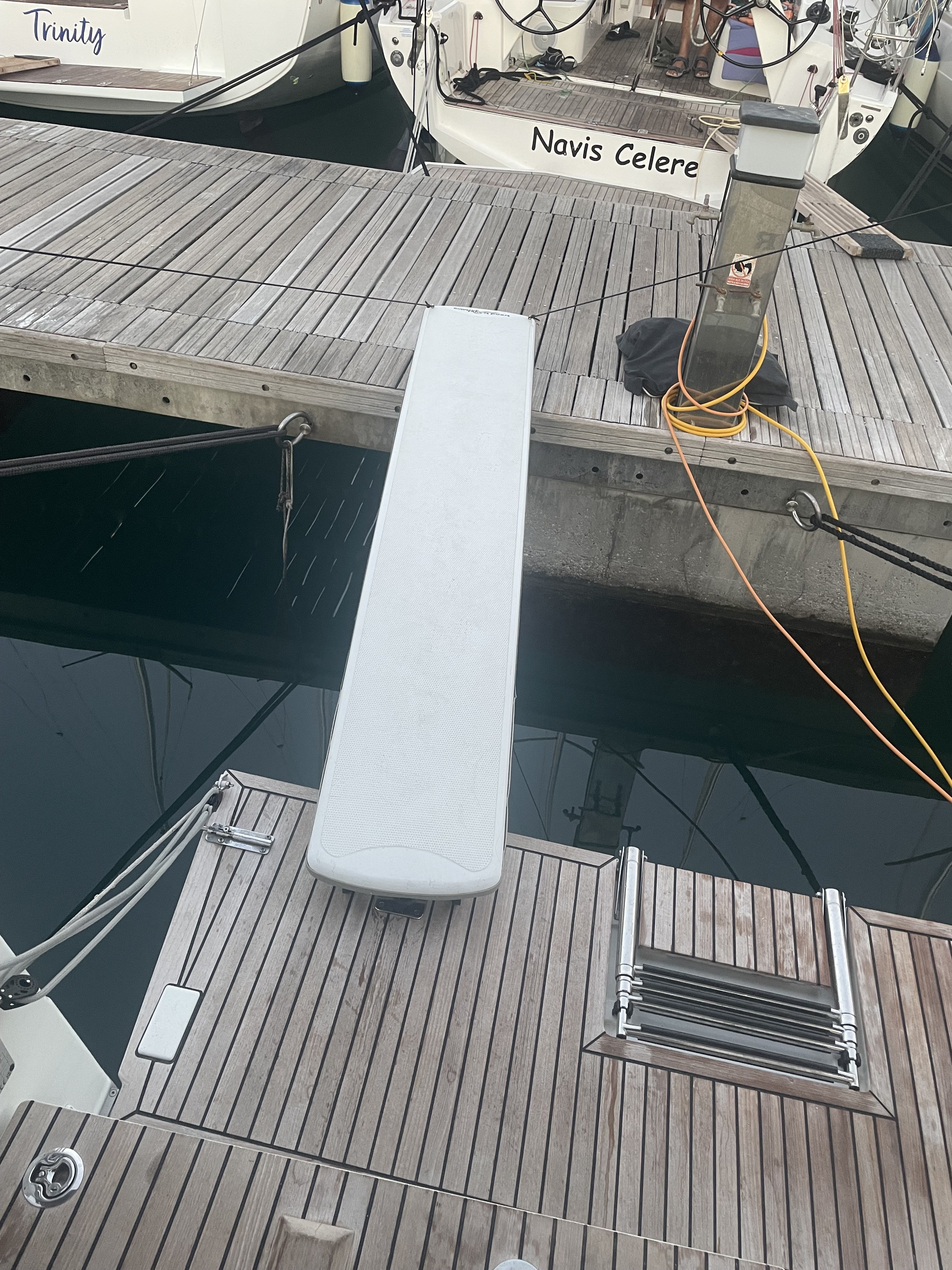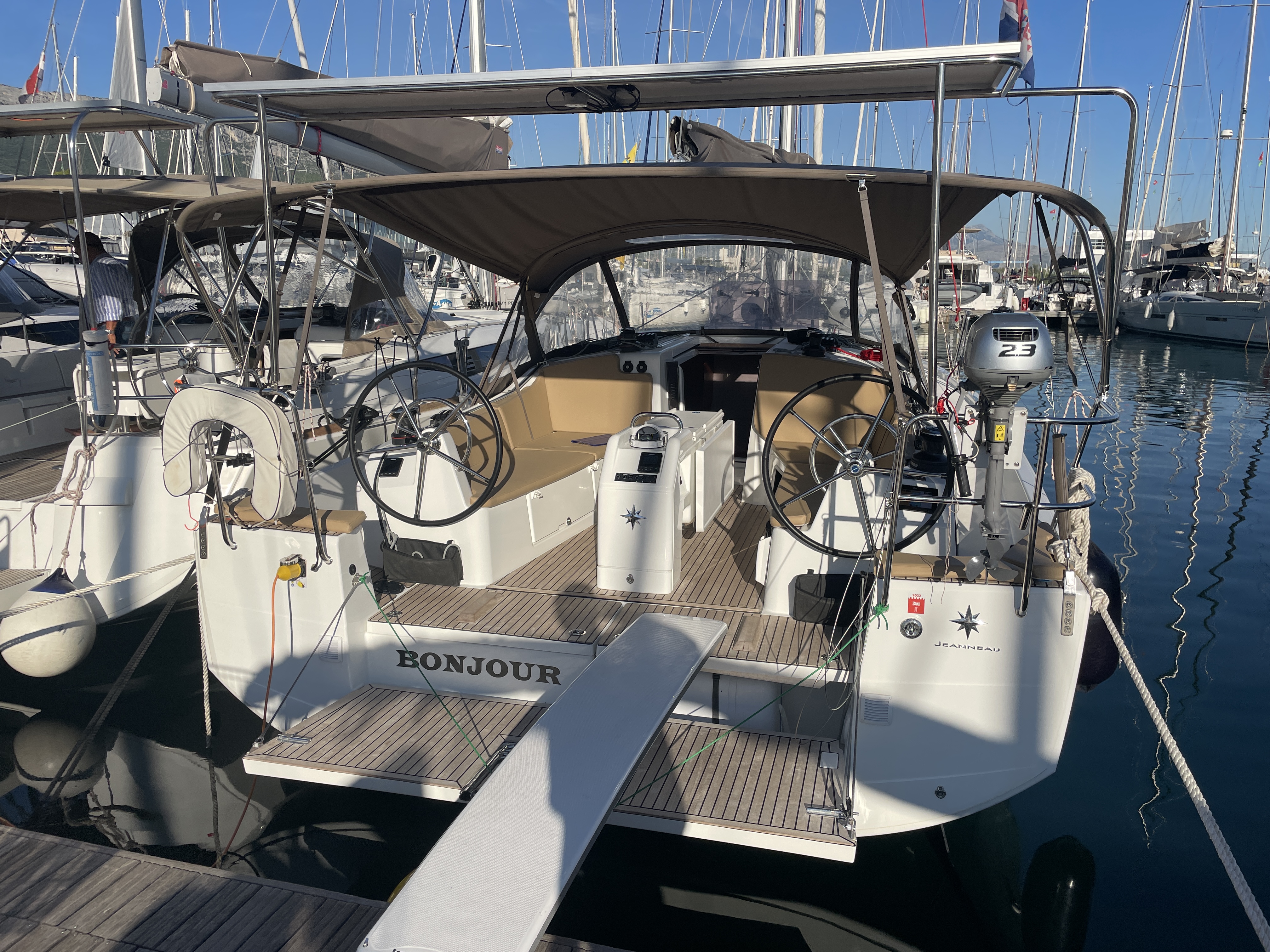 | Outside | 220 V-Landanschluss, Badeplattform, Biminitop, Cockpitdusche, Cockpitlautsprecher, Cockpitpolster, Cockpittisch, elektr. Ankerwinsch, Gangway, Solaranlage, Sprayhood |