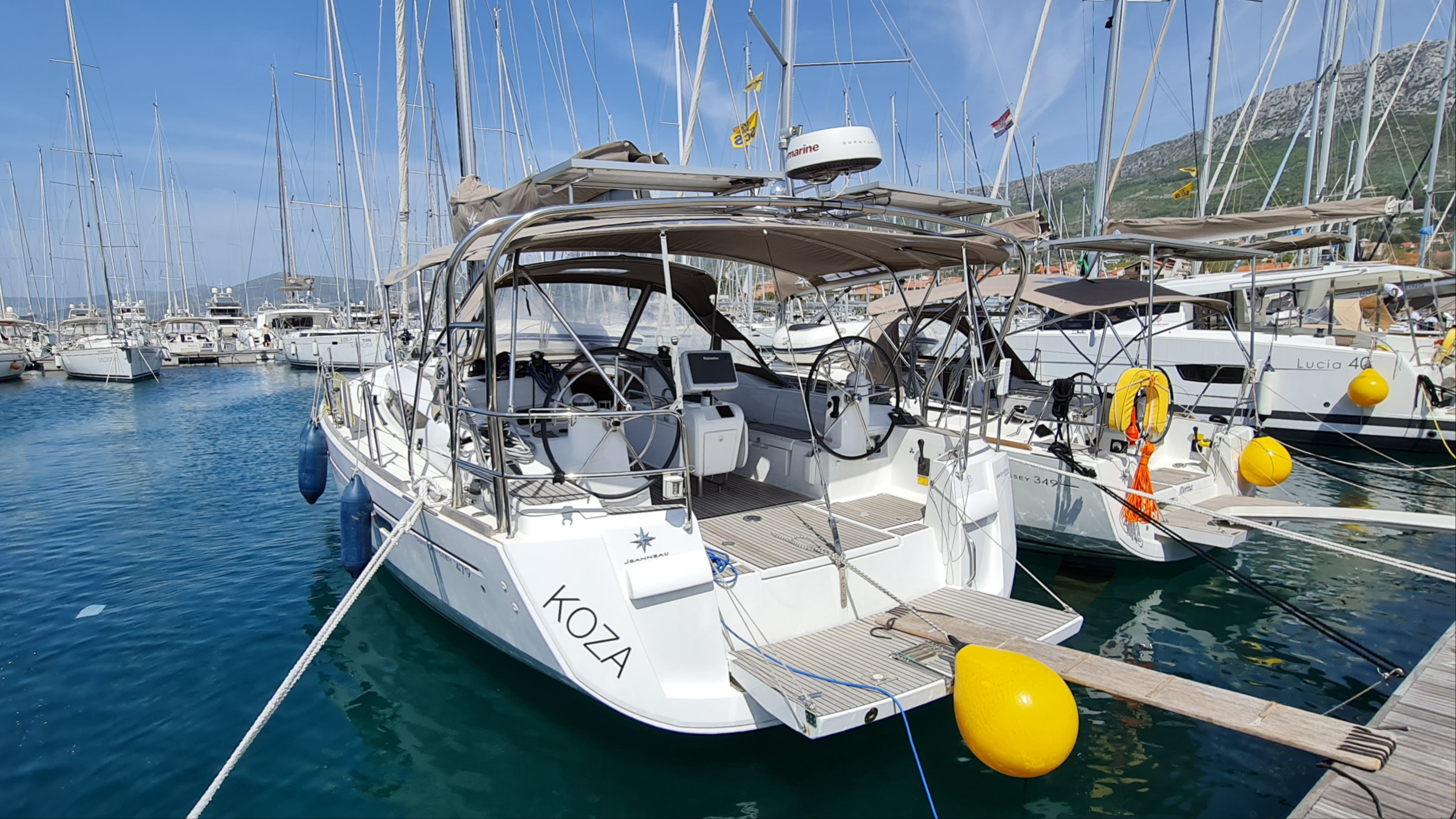 | Outside | 220 V-Landanschluss, Badeplattform, Biminitop, Cockpitdusche, Cockpitlautsprecher, Cockpittisch, Delta-Anker, elektr. Ankerwinsch, Gangway, Solaranlage, Sprayhood |