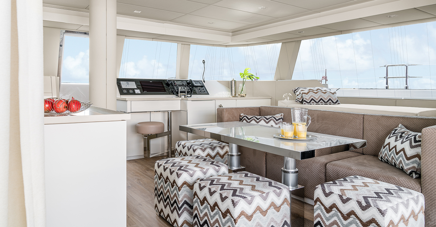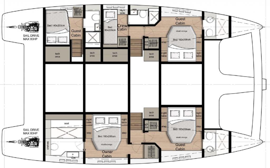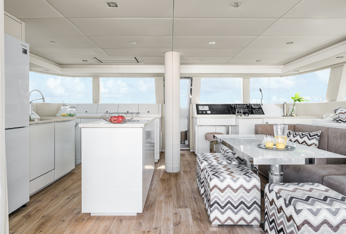| Inside | Eiswürfelmaschine, Fäkalientank, Gasherd mit Backofen, Generator, Geschirrspüler, Heizung, Inverter 12V/220V, Klimaanlage (ohne Landstrombedarf), Kühlschrank, Ladegerät, Lautsprecher im Salon, Mikrowelle, Radio mit CD und MP3, USB Steckdosen in den Kabinen, Warmwasser, Waschmaschine, Watermaker |