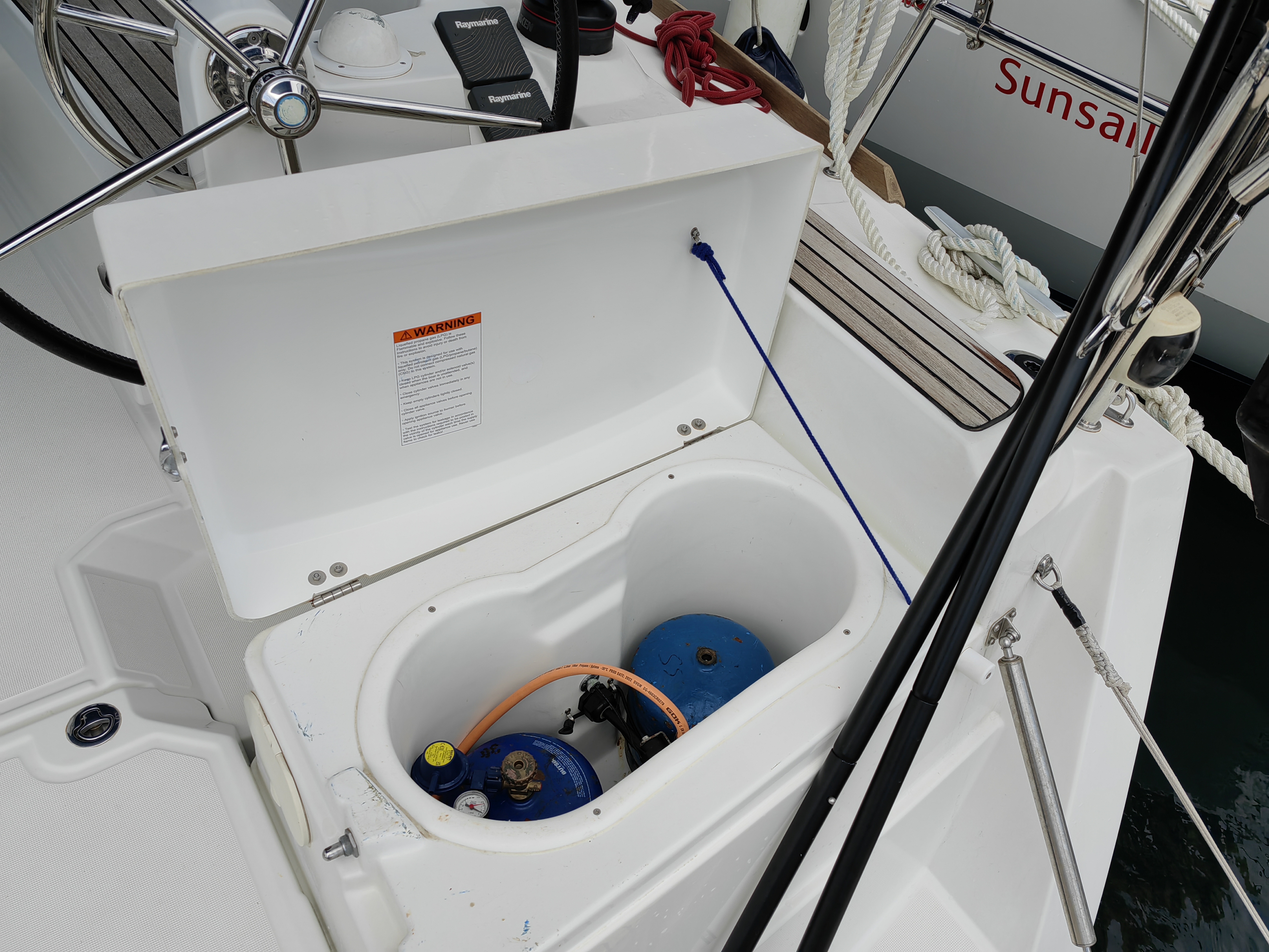 | Inside | Backofen, Frischwasserpumpe, Gasherd, Klimaanlage (Landstrom), Kühlschrank, Ladegerät, Landstromkabel, Lautsprecher im Salon, LED-Innenleuchten, Lukenjalousien, MP3-Player, Pantryausstattung, Radio, Toaster, Ventilatoren in Salon und Kabinen, Wasserkocher, Wechselrichter |