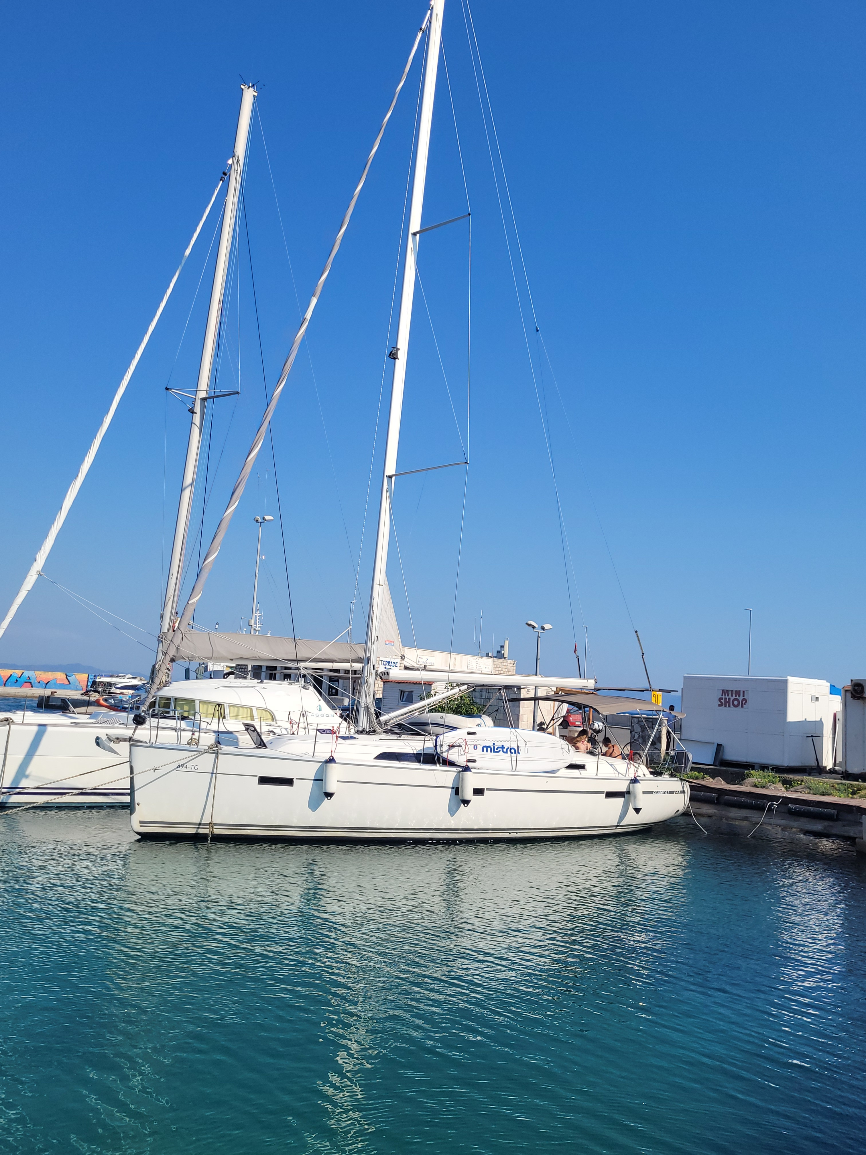 | Outside | Anker mit Kette, Badeplattform, Biminitop, Bootshaken, Cockpitdusche, Cockpitlautsprecher, Cockpittisch, Deckbürste, elektr. Ankerwinsch, Fender, Gangway, Kugelfender, Solaranlage, Sprayhood, Teak im Cockpit, Wasserschlauch, Winschen |