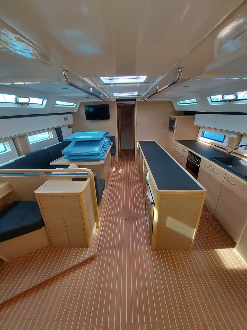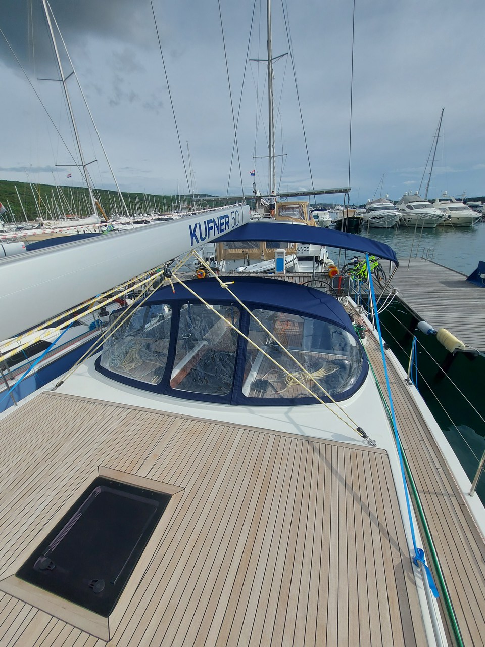 | Outside | Anker mit Kette, Badeplattform, Biminitop, Bootshaken, Cockpitdusche, Cockpitkühlschrank, Cockpitlautsprecher, Cockpitpolster, Cockpittisch, Deckbürste, Deckpolster, elektr. Ankerwinsch, Fender, Festmacherleinen, Gangway, Kugelfender, Sprayhood, Teak im Cockpit, Teakdeck, Wasserschlauch, Winschen |