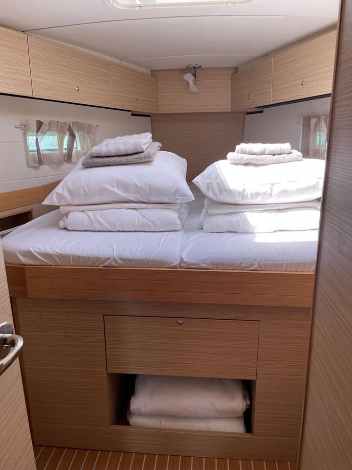 | Outside | Anker mit Kette, Badeplattform, Biminitop, Bootshaken, Cockpitdusche, Cockpitkühlschrank, Cockpitlautsprecher, Cockpitpolster, Cockpittisch, Deckbürste, Deckpolster, elektr. Ankerwinsch, Fender, Festmacherleinen, Gangway, Kugelfender, Sprayhood, Teak im Cockpit, Teakdeck, Wasserschlauch, Winschen |