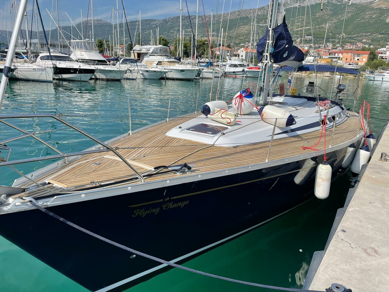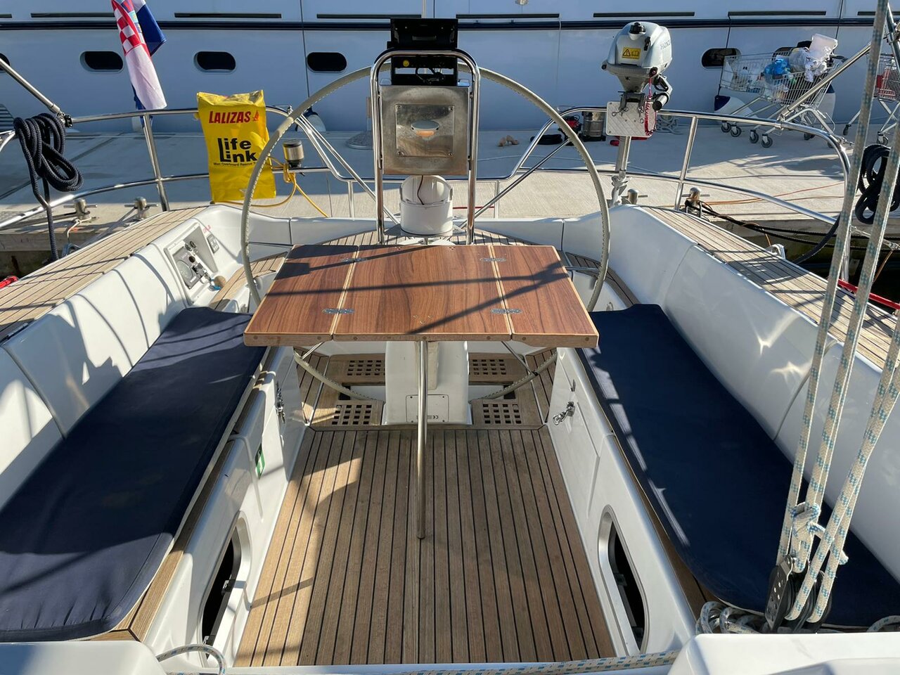 | Outside | Anker mit Kette, Bootshaken, Cockpitdusche, Cockpitlautsprecher, Cockpitpolster, Cockpittisch, Deckbürste, elektr. Ankerwinsch, Fender, Festmacherleinen, Gangway, Sprayhood, Teak im Cockpit, Teakdeck, Wasserschlauch, Winschen |