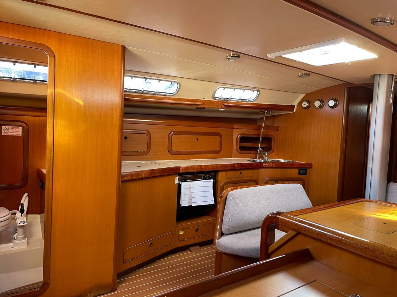 | Navigation | Barometer, Echolot, Fernglas, GPS mit Kartenplotter im Cockpit, Hafenhandbücher, Navigationsbesteck, Seekarten, Sumlog, Thermometer, Windmesser |
