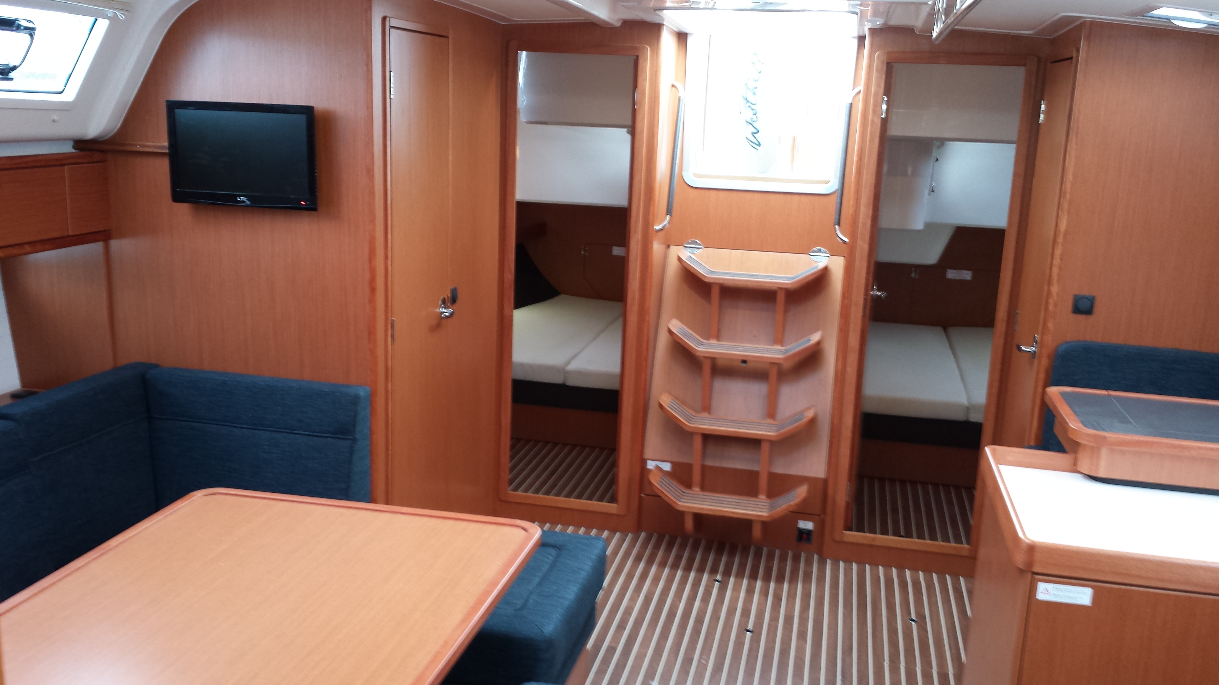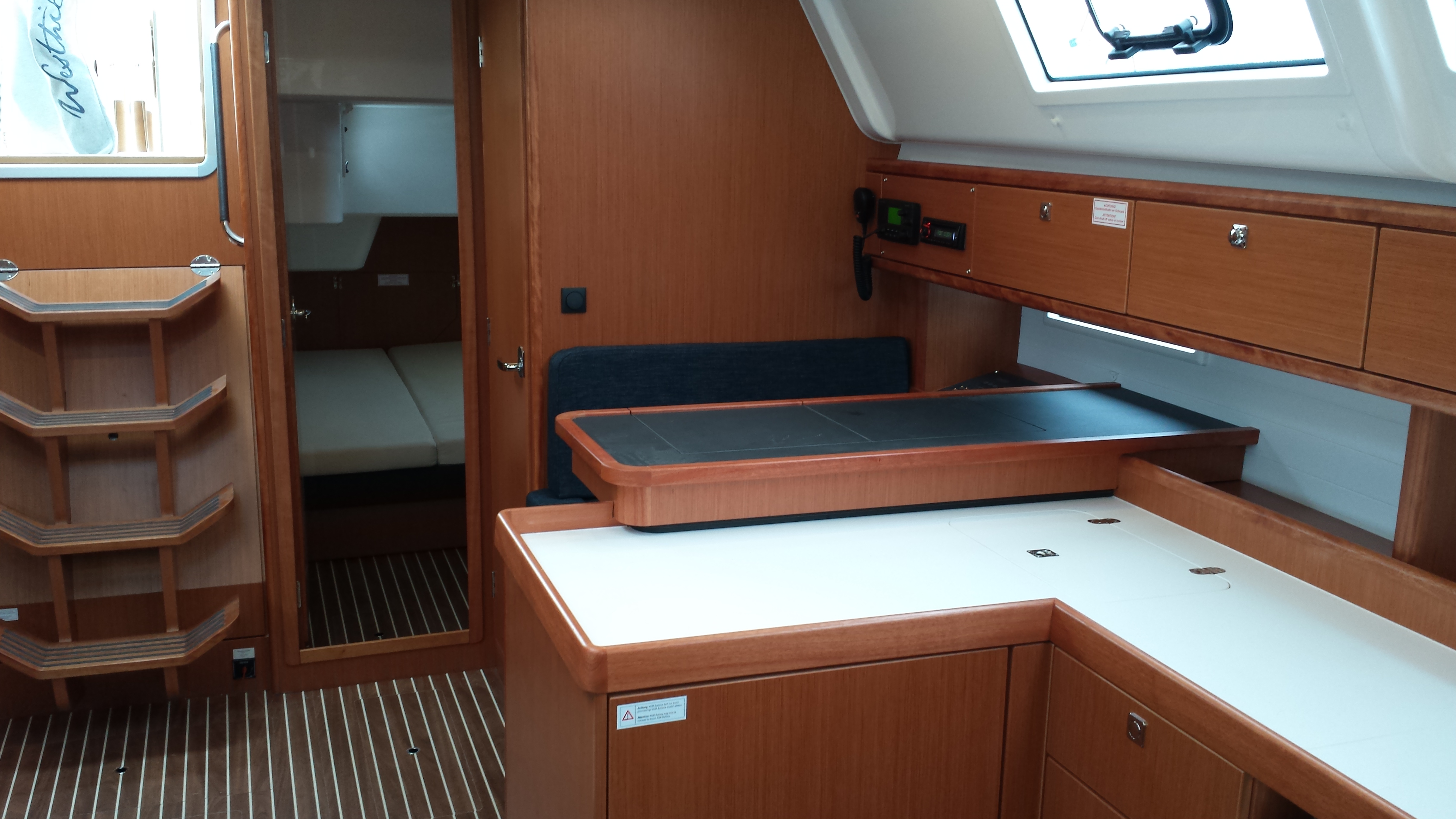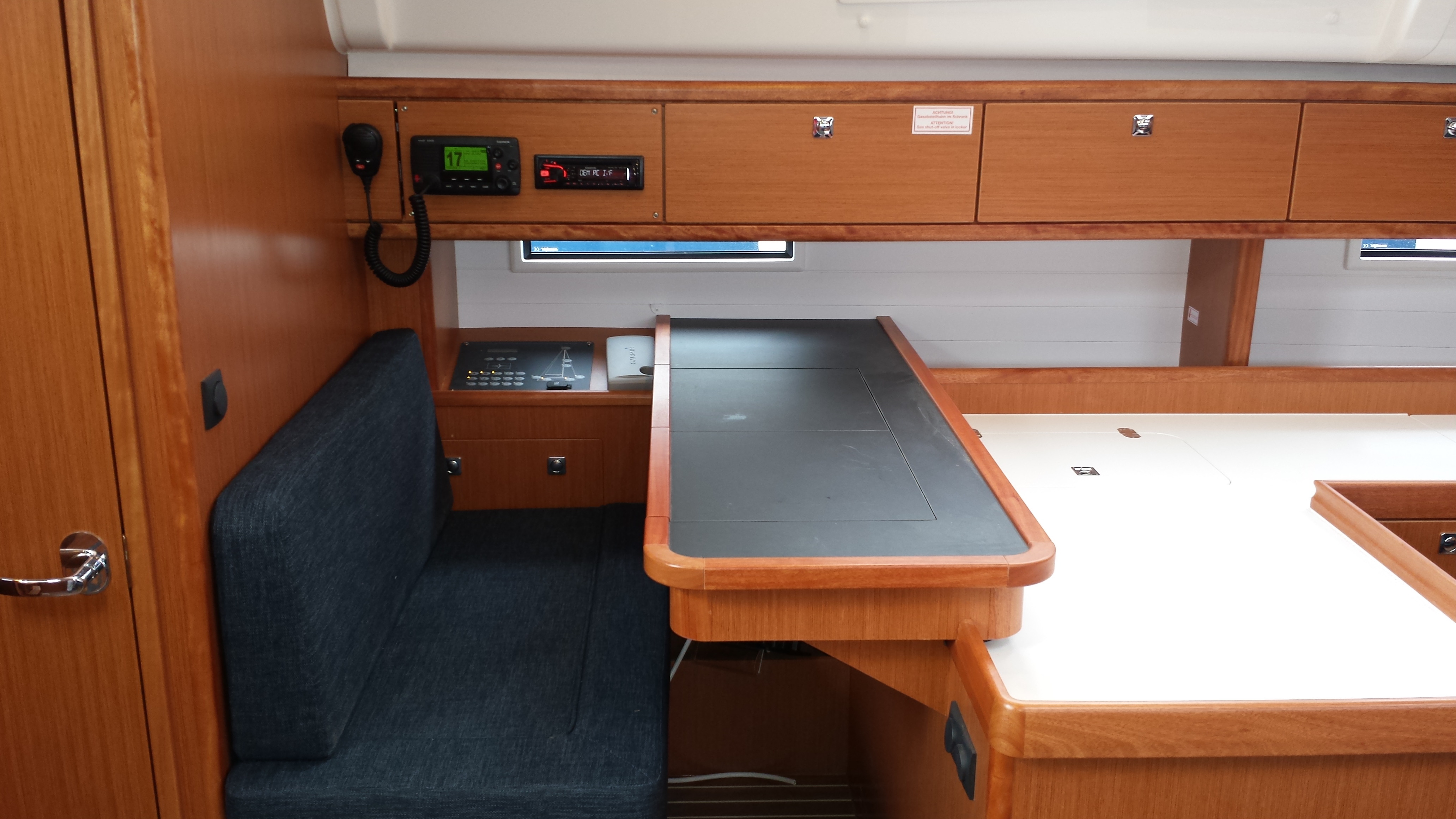 | Navigation | Barometer, Fernglas, GPS mit Kartenplotter im Cockpit, Hafenhandbücher, Handpeilkompass, Navigationsbesteck, Seekarten, Tridata (Log, Echolot, Windm.) |