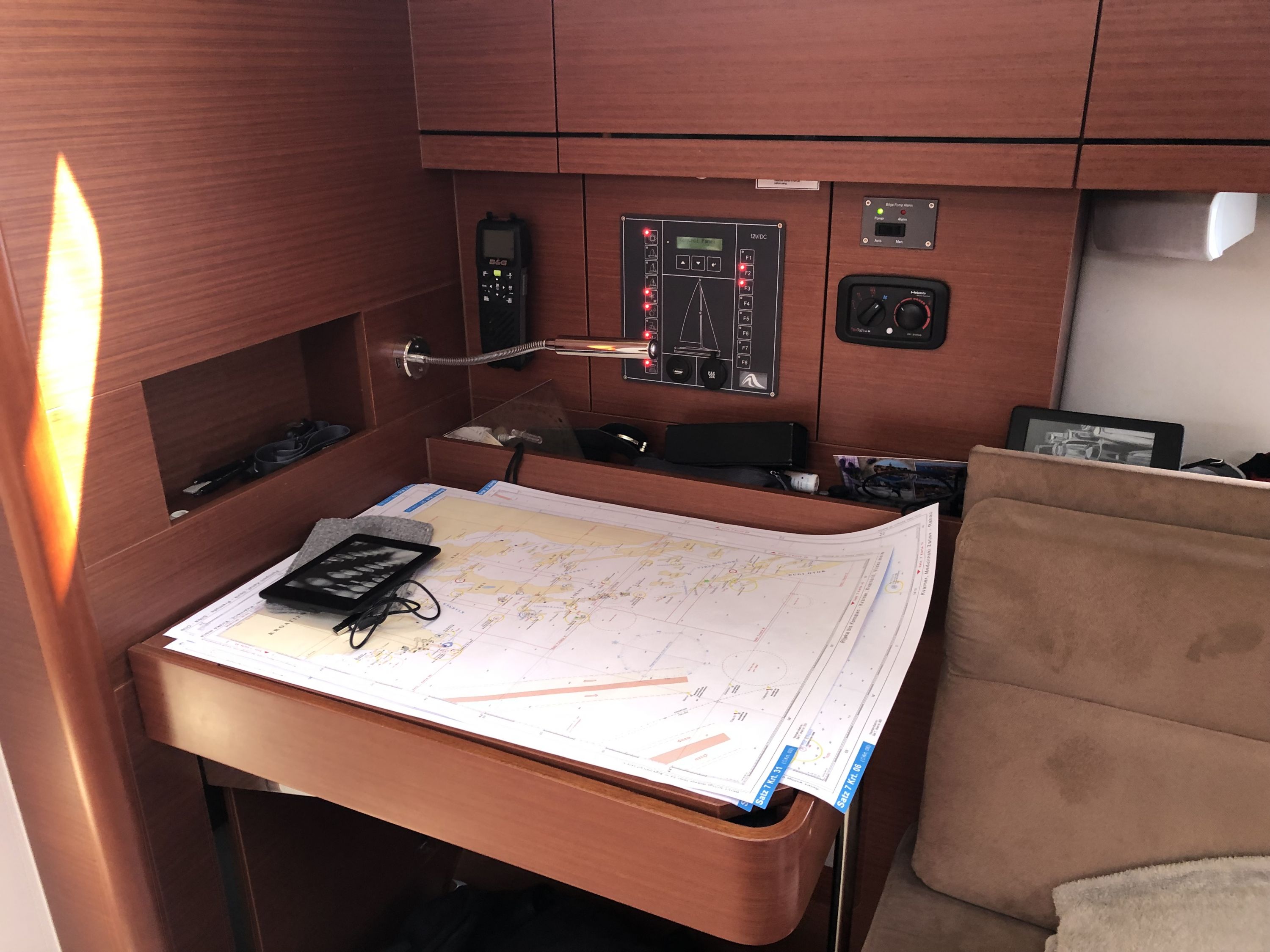 | Navigation | Barometer, Fernglas, GPS mit Kartenplotter im Cockpit, Hafenhandbücher, Handpeilkompass, Navigationsbesteck, Seekarten, Tridata (Log, Echolot, Windm.) |