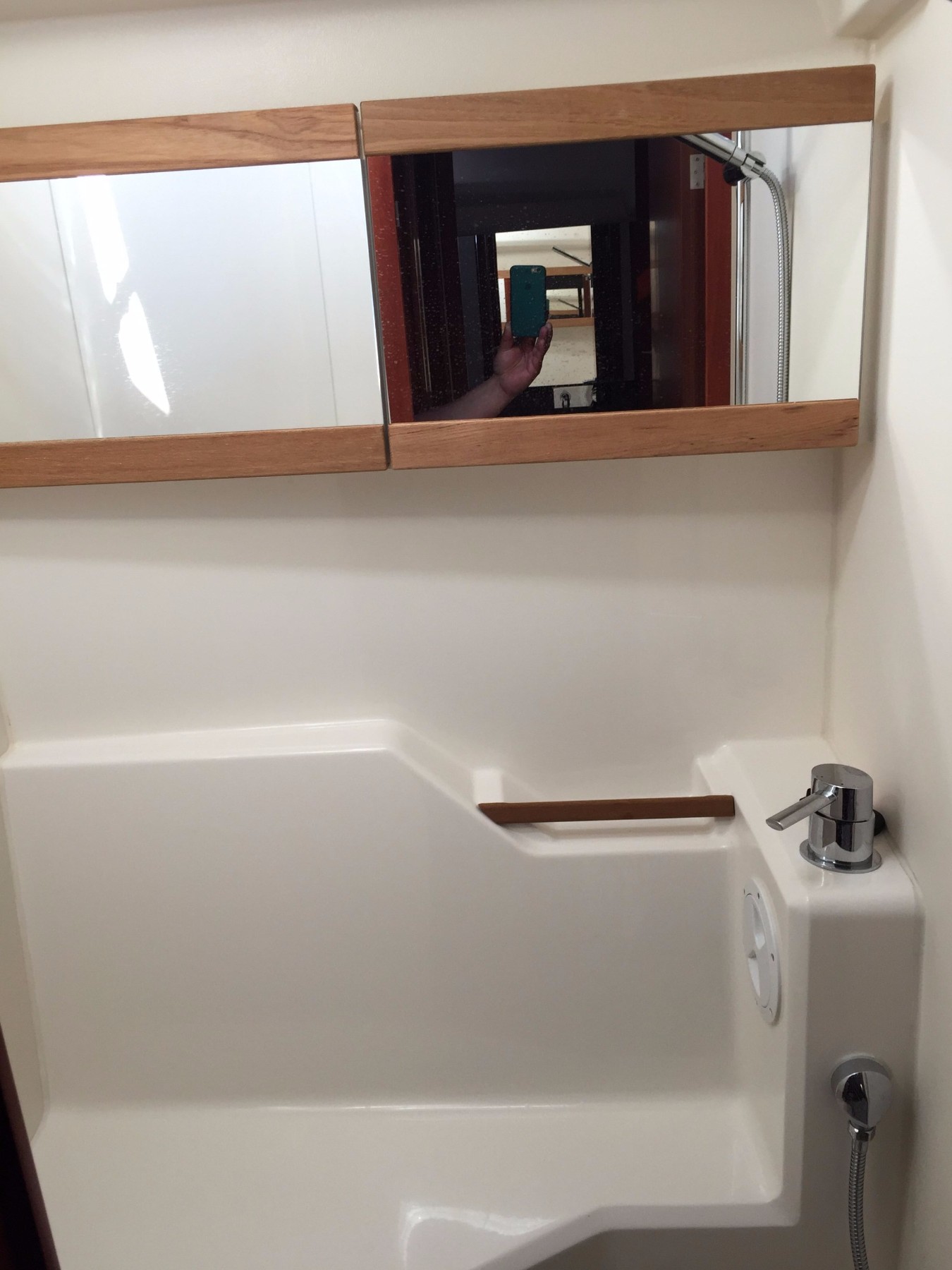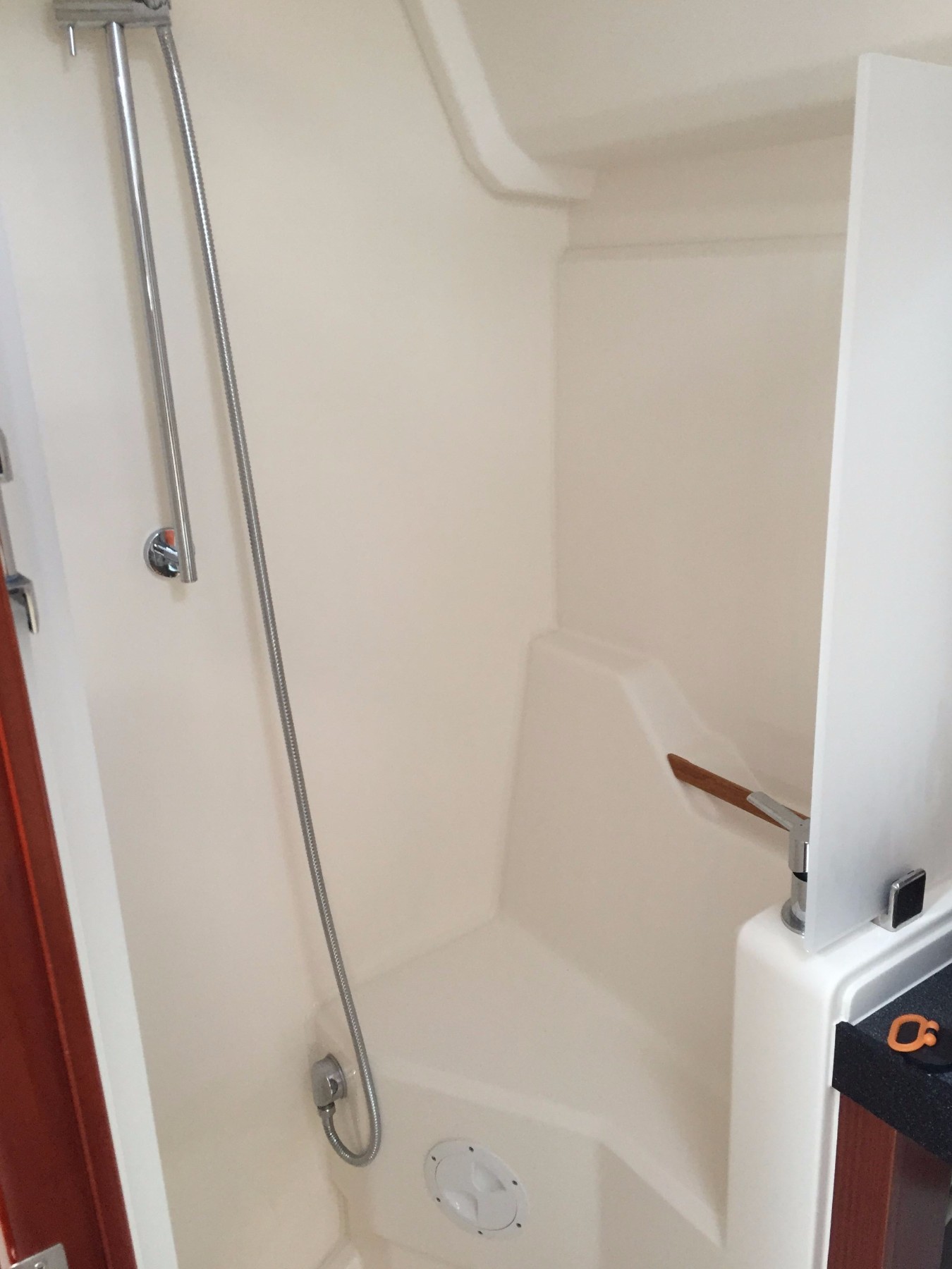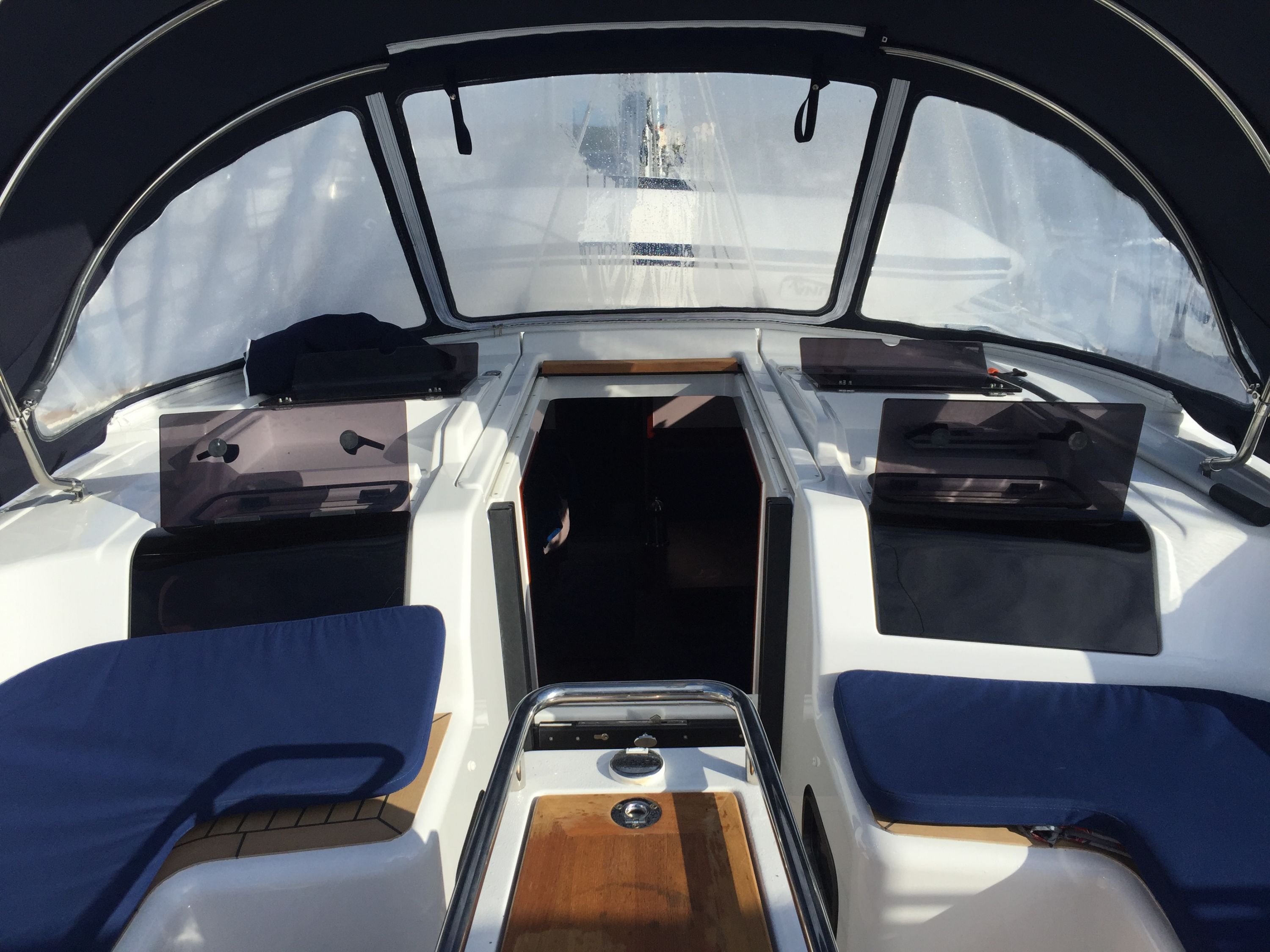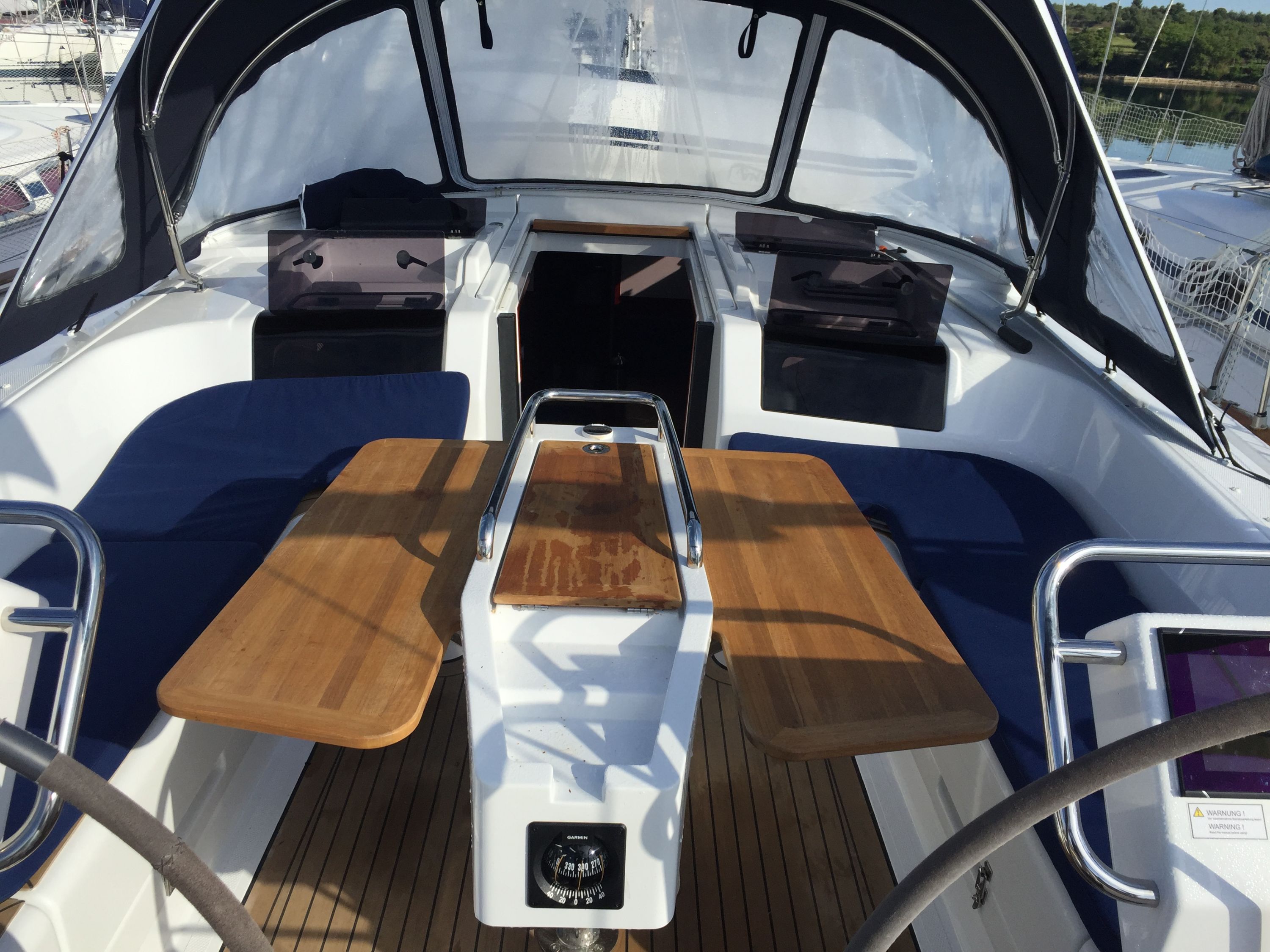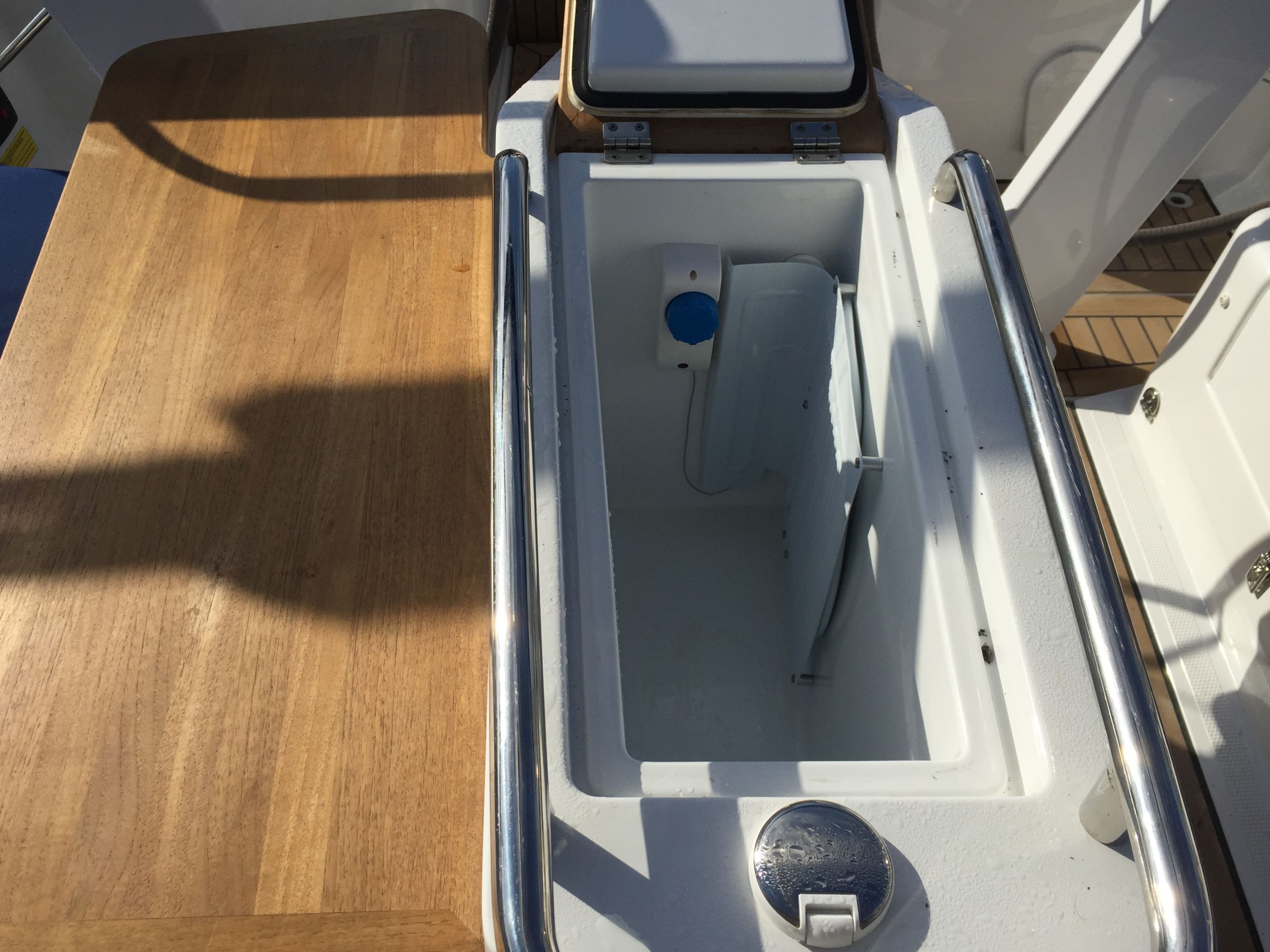 | Outside | Anker mit Kette, Ankerwinsch, Badeplattform, Biminitop, Bootshaken, Cockpitdusche, Cockpitlautsprecher, Deckbürste, Dieselkanister , elektr. Ankerwinsch, Fender, Fernsteuerung für elektr. Ankerwinsch, Gangway, Grill, Kunststoff-Eimer (Pütz), Solaranlage, Sprayhood, Wasserkanister , Wasserschlauch, Windex |