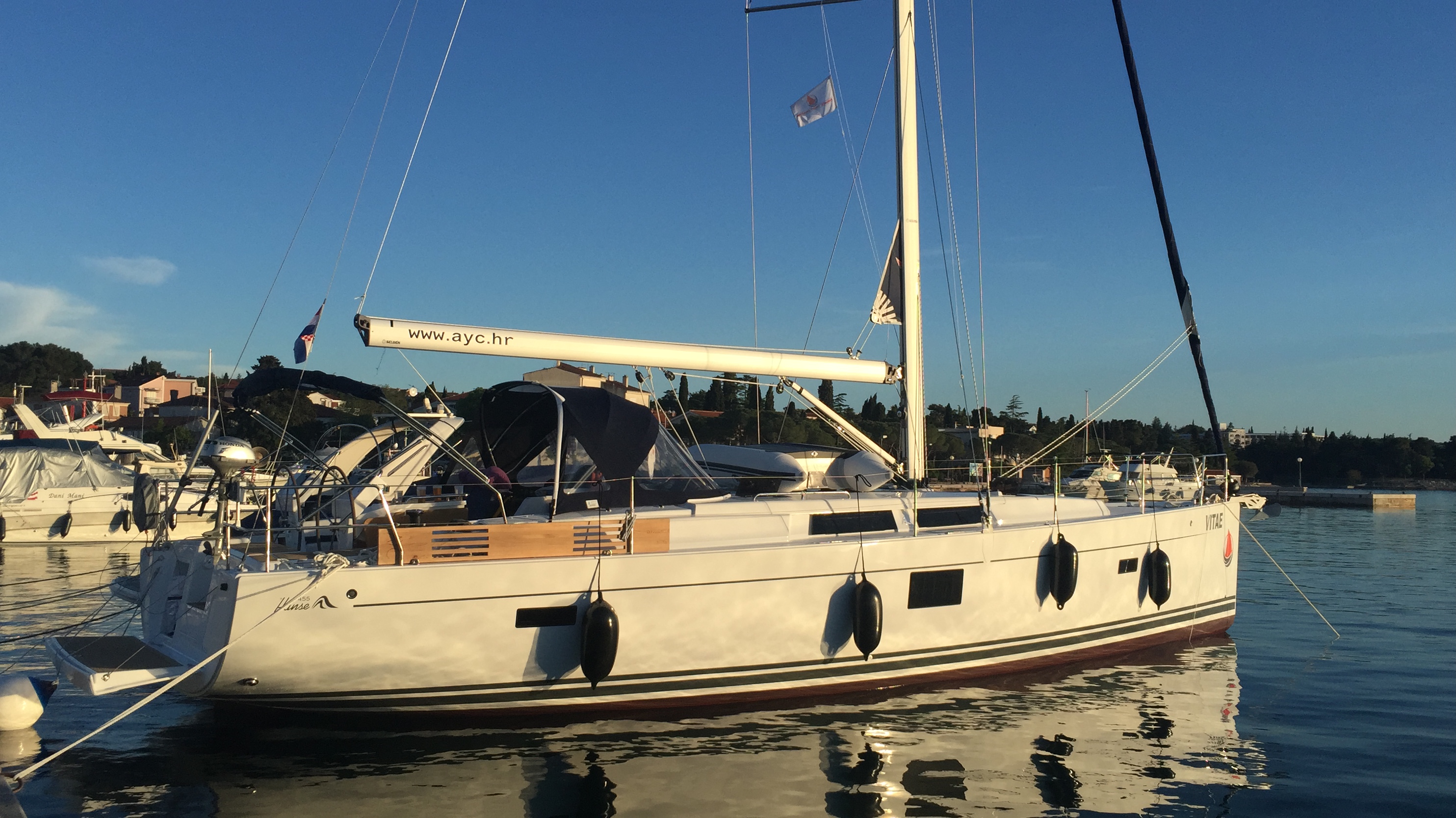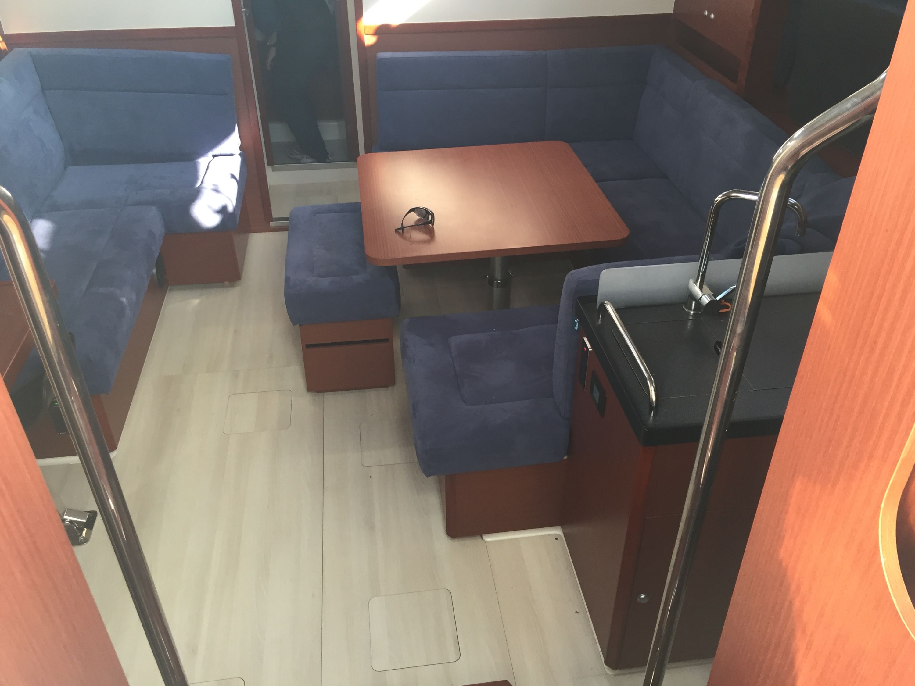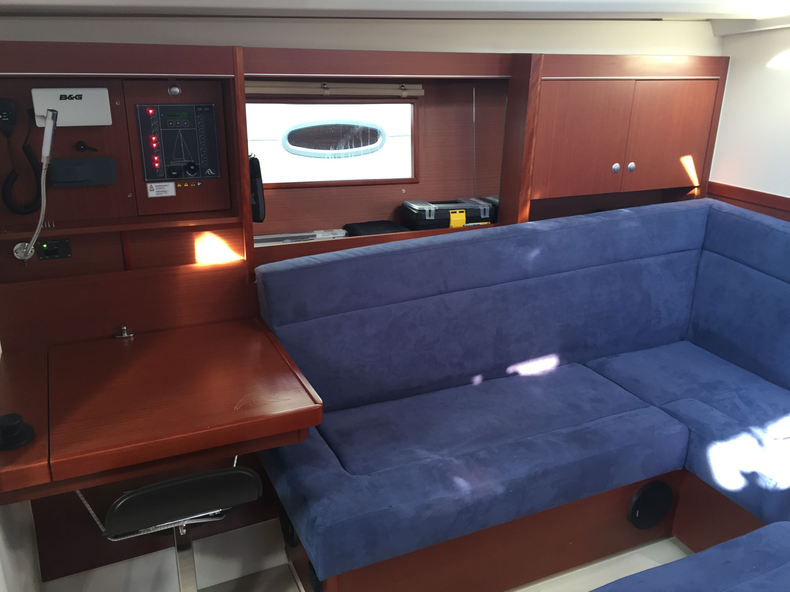 | Navigation | Barometer, Fernglas, GPS mit Kartenplotter im Cockpit, Hafenhandbücher, Handpeilkompass, Navigationsbesteck, Seekarten, Tridata (Log, Echolot, Windm.) |