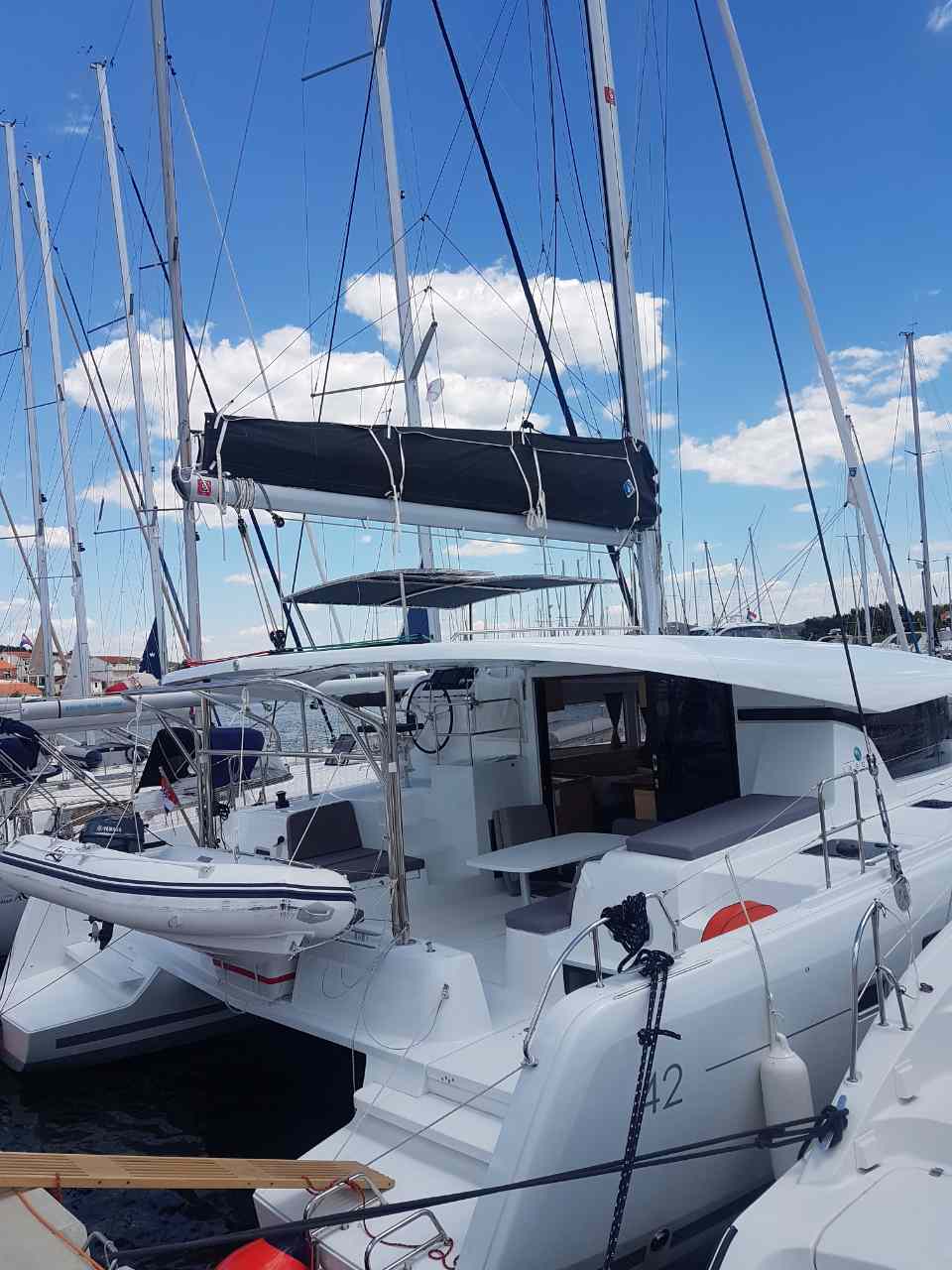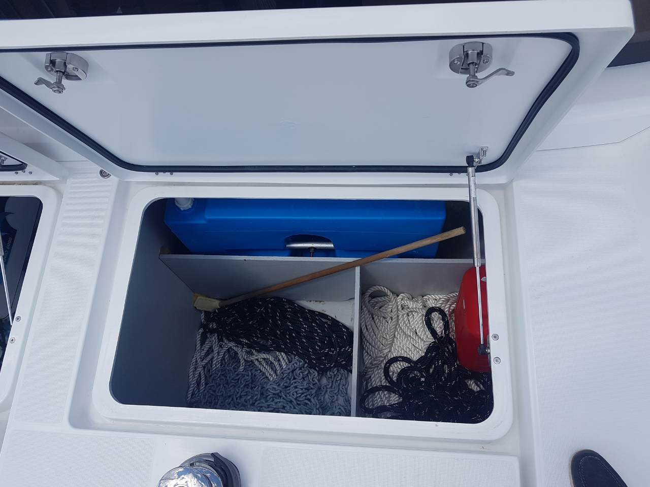 Anker mit Kette, Ankerwinsch, Biminitop, Bootshaken, Cockpitdusche, Cockpitlautsprecher, Deckbürste, Dieselkanister , elektr. Ankerwinsch, elektr. Winsch, Fender, Fernsteuerung für elektr. Ankerwinsch, Flybridge, Gangway, Kunststoff-Eimer (Pütz), Solaranlage, Wasserkanister , Wasserschlauch, Windex |