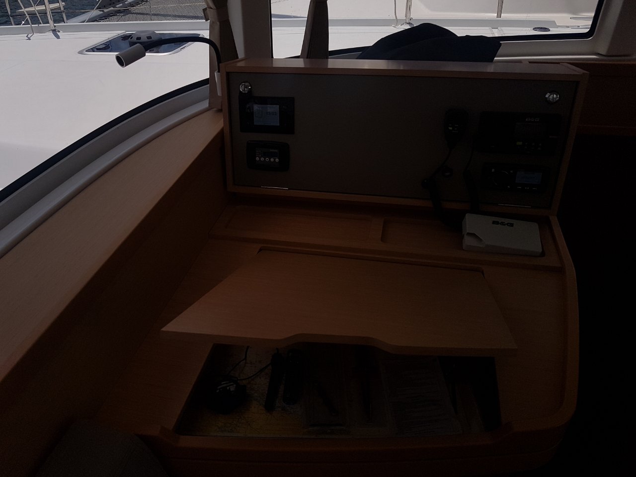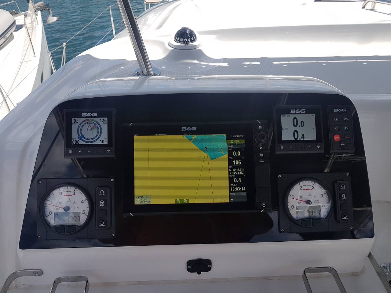Barometer, Fernglas, GPS mit Kartenplotter im Cockpit, Hafenhandbücher, Handpeilkompass, Navigationsbesteck, Radar, Seekarten, Tridata (Log, Echolot, Windm.) |