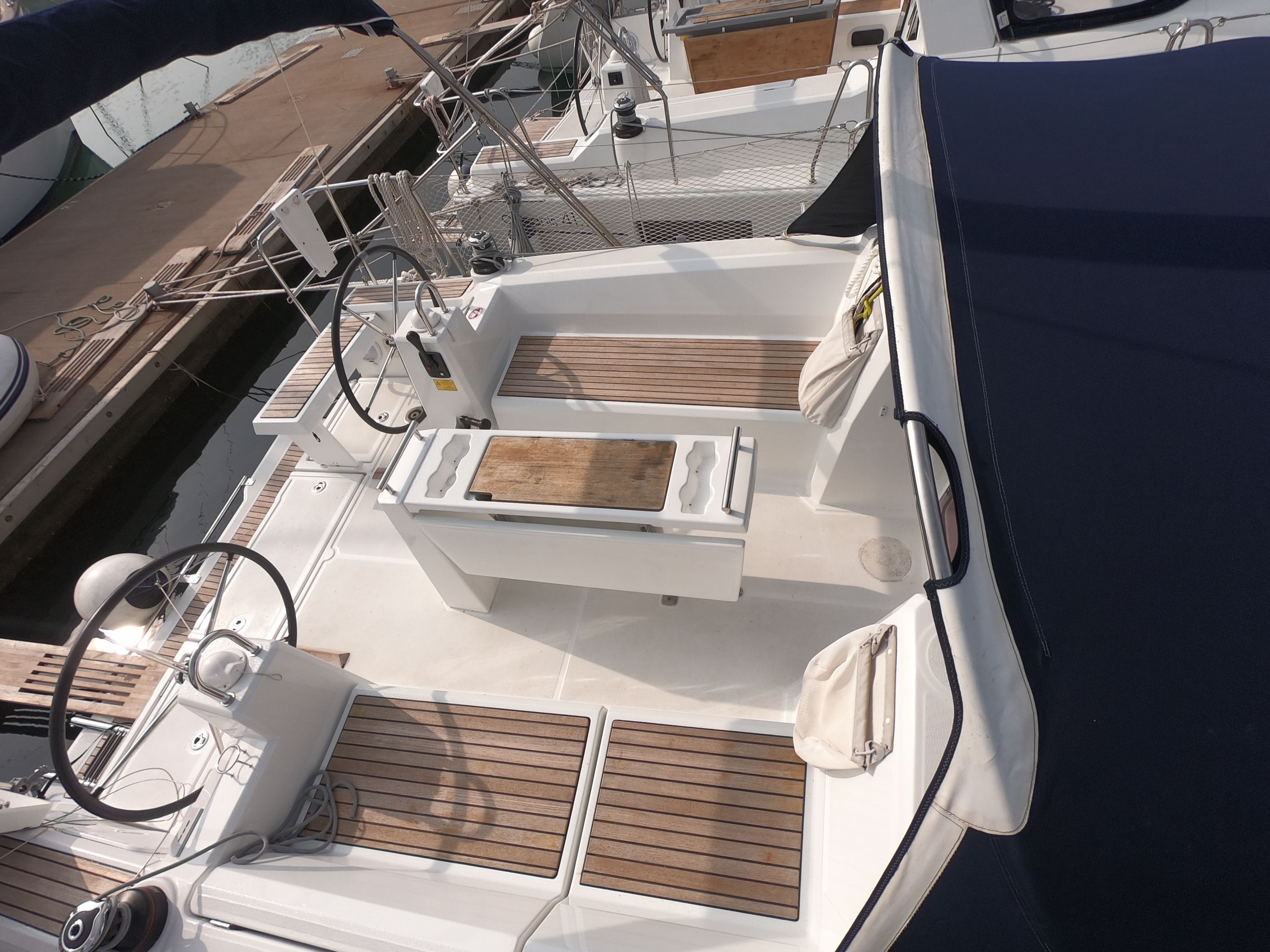| Outside | Anker mit Kette, Ankerwinsch, Badeplattform, Biminitop, Bootshaken, Cockpitdusche, Cockpitlautsprecher, Deckbürste, Dieselkanister , elektr. Ankerwinsch, Fender, Fernsteuerung für elektr. Ankerwinsch, Gangway, Kunststoff-Eimer (Pütz), Sprayhood, Wasserkanister , Wasserschlauch, Windex |
