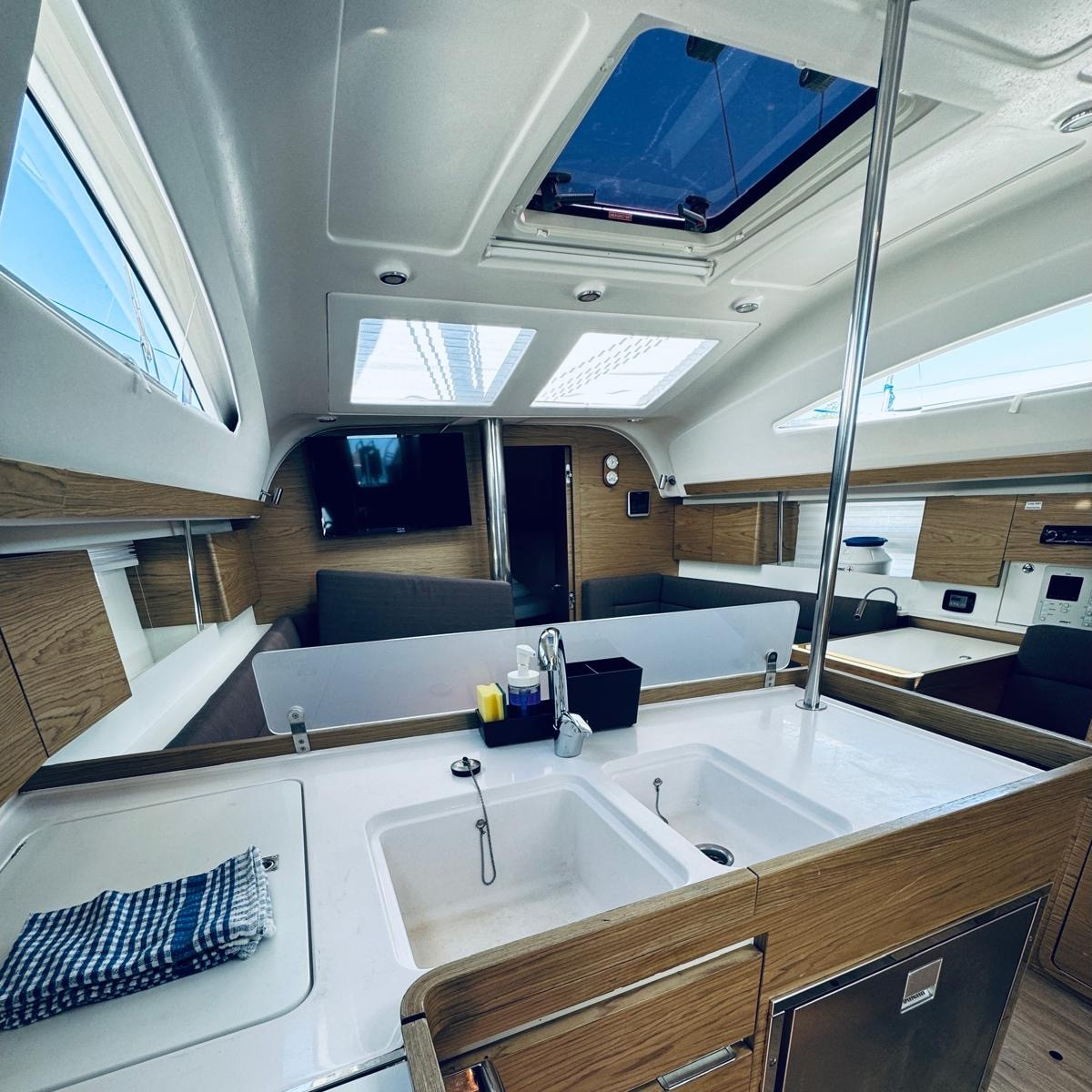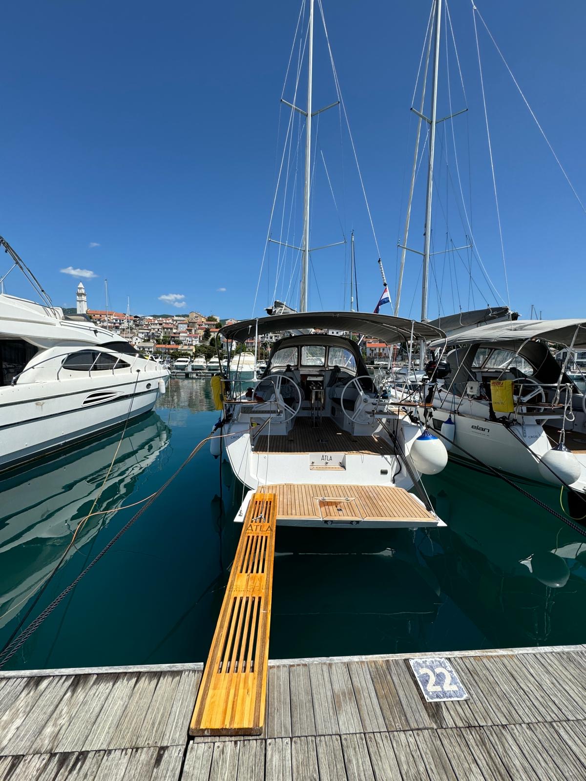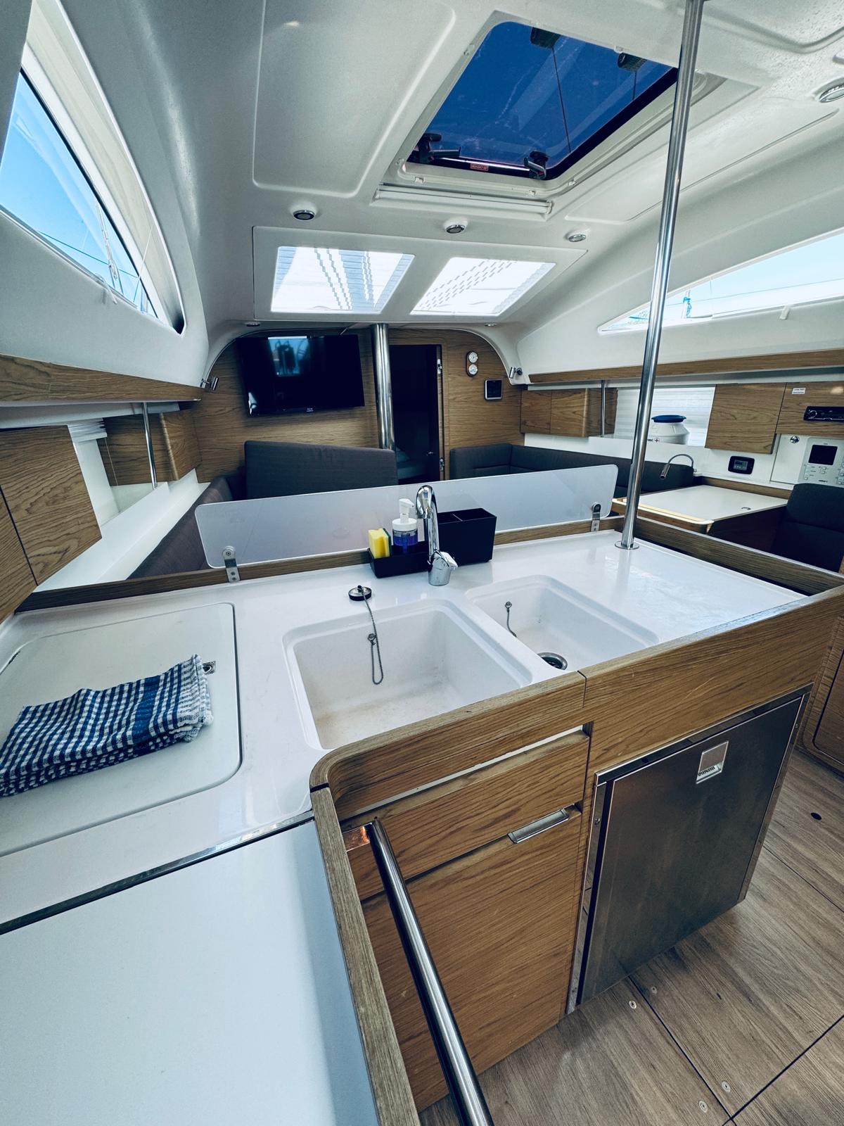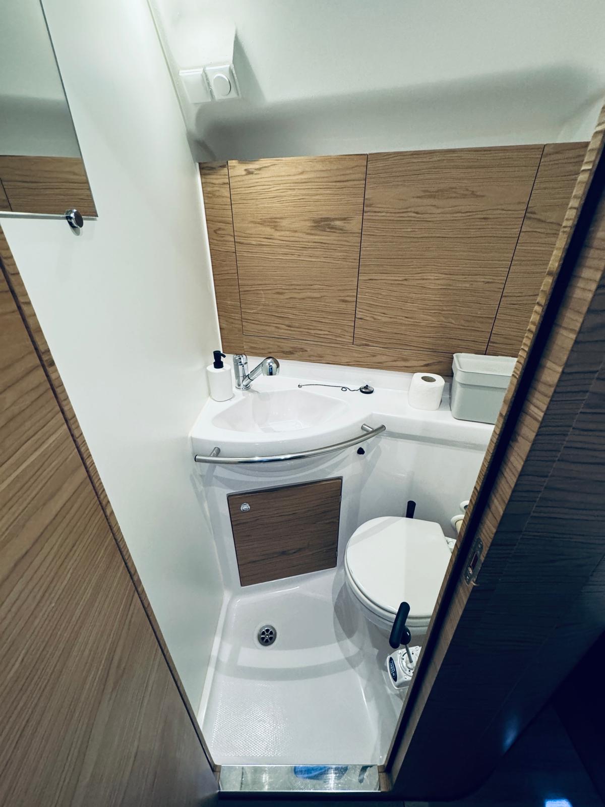 | Outside | Biminitop, Cockpitlautsprecher, Cockpittisch, elektr. Ankerwinsch, Heckdusche, Sprayhood, Teak im Cockpit |