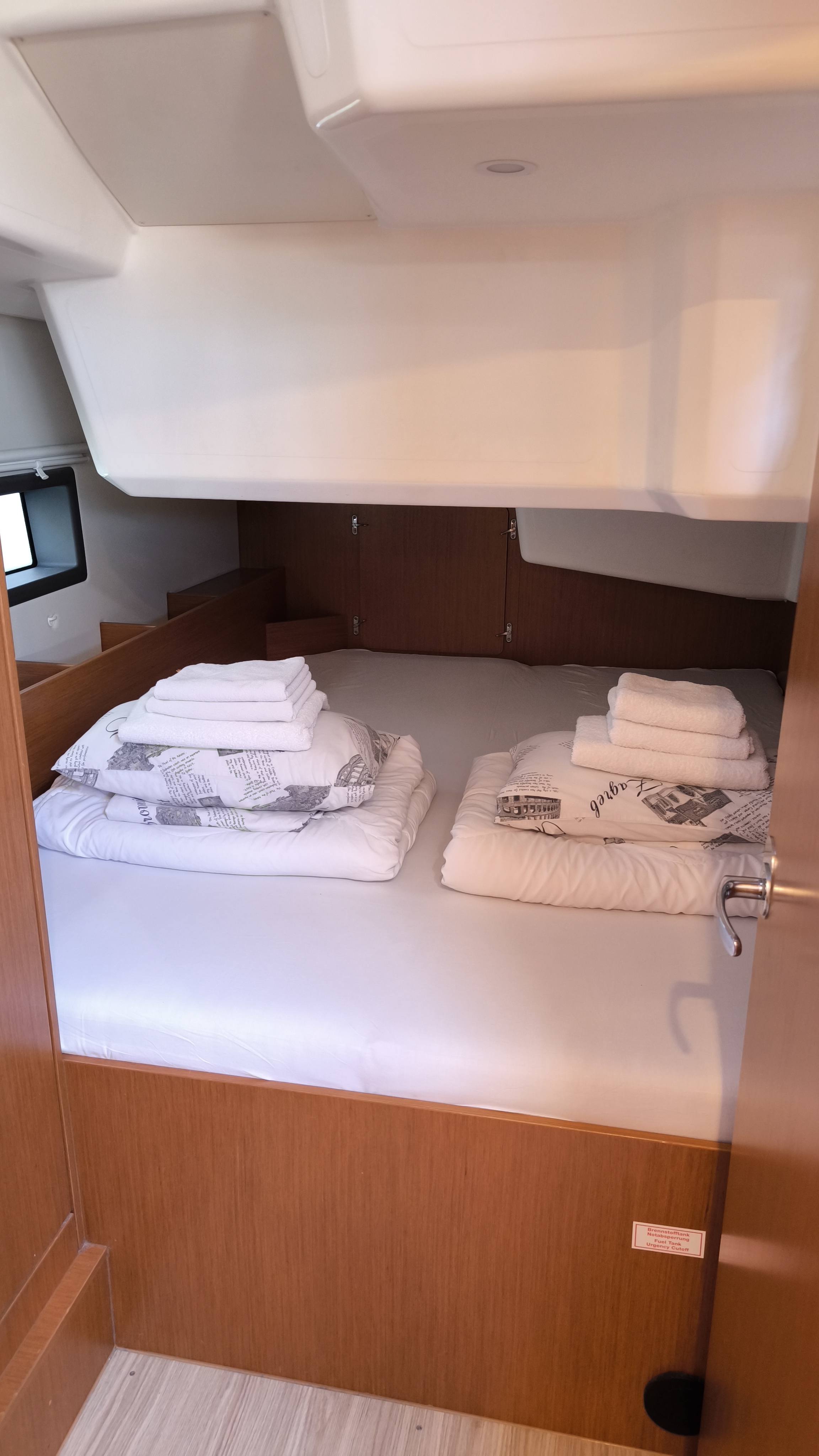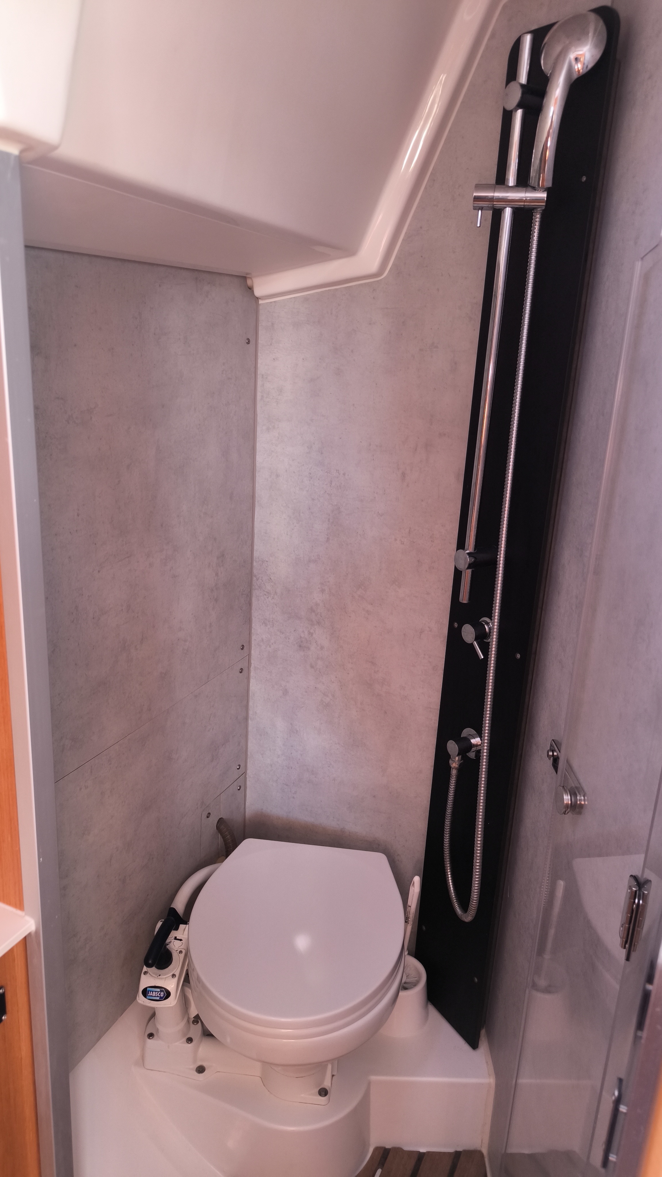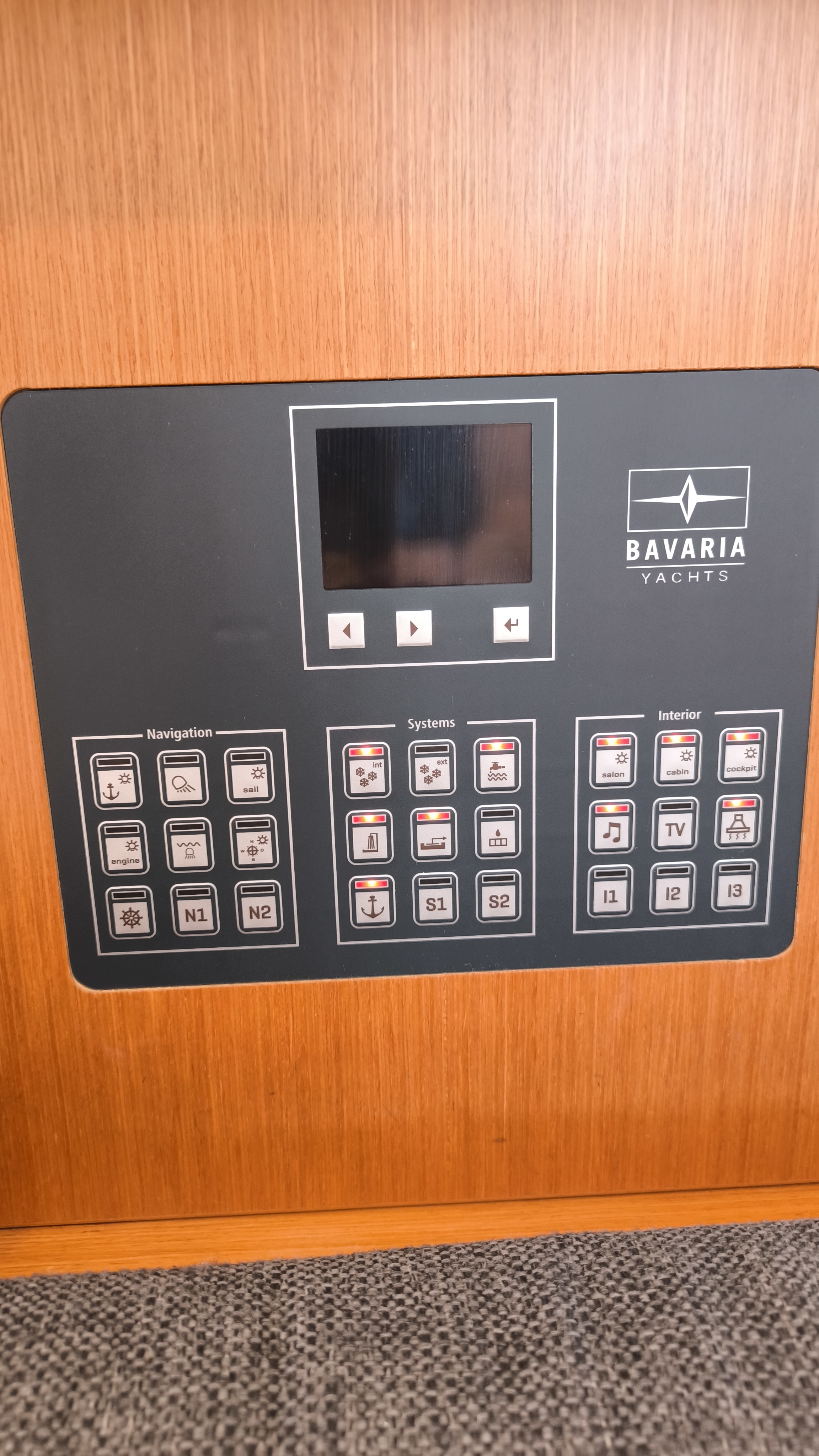 | Outside | 220 V-Landanschluss, Anker mit Kette, Badeplattform, Biminitop, Cockpitdusche, Cockpitlautsprecher, Cockpitpolster, Cockpittisch, elektr. Ankerwinsch, Fender, Festmacherleinen, Solaranlage, Sprayhood, Teak im Cockpit, Wantenschneider, Windex |