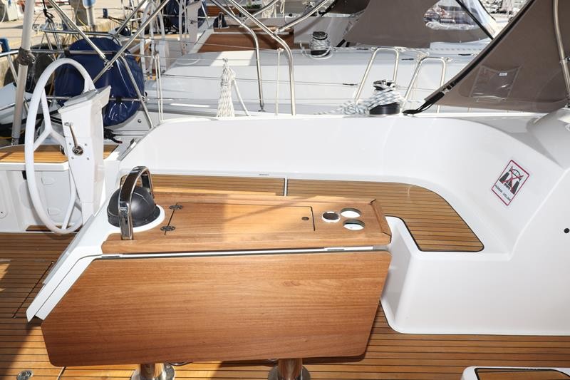 | Outside | 220 V-Landanschluss, Anker mit Kette, Badeplattform (hydr.), Biminitop, Bootshaken, Cockpitdusche, Cockpitlautsprecher, Cockpitpolster, Cockpittisch (klappbar), elektr. Ankerwinsch, Fender, Fernsteuerung für elektr. Ankerwinsch, Festmacherleinen, Seereling, Solaranlage, Sprayhood, Teak auf Badeplattform, Teak im Cockpit, Treibanker, Windex |