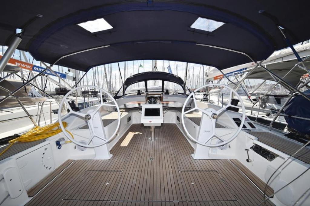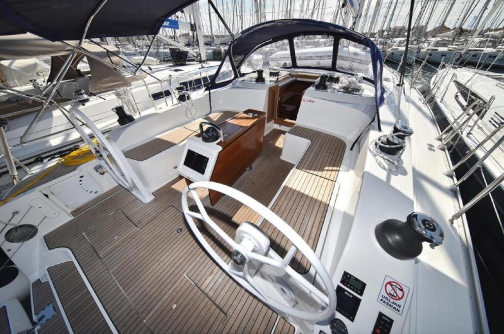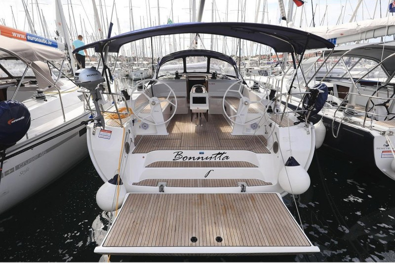 | Outside | Anker mit Kette, Biminitop, Cockpitdusche, Cockpitlautsprecher, Cockpitpolster, Cockpittisch, elektr. Ankerwinsch, Fender, Festmacherleinen, Solaranlage, Sprayhood, Treibanker, Wantenschneider, Windex |