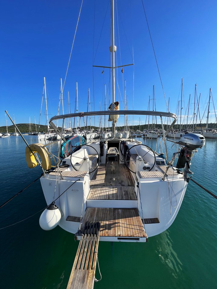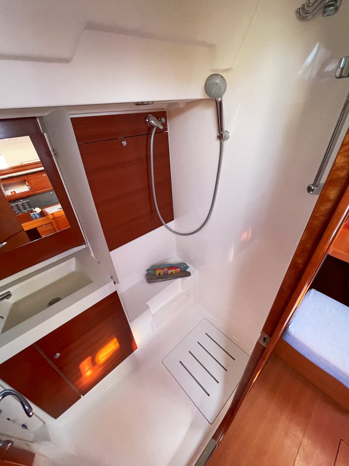 | Outside | Anker mit Kette, Biminitop, Cockpitdusche, Cockpittisch, elektr. Ankerwinsch, Fender, Festmacherleinen, Sprayhood, Teakdeck, Windex |