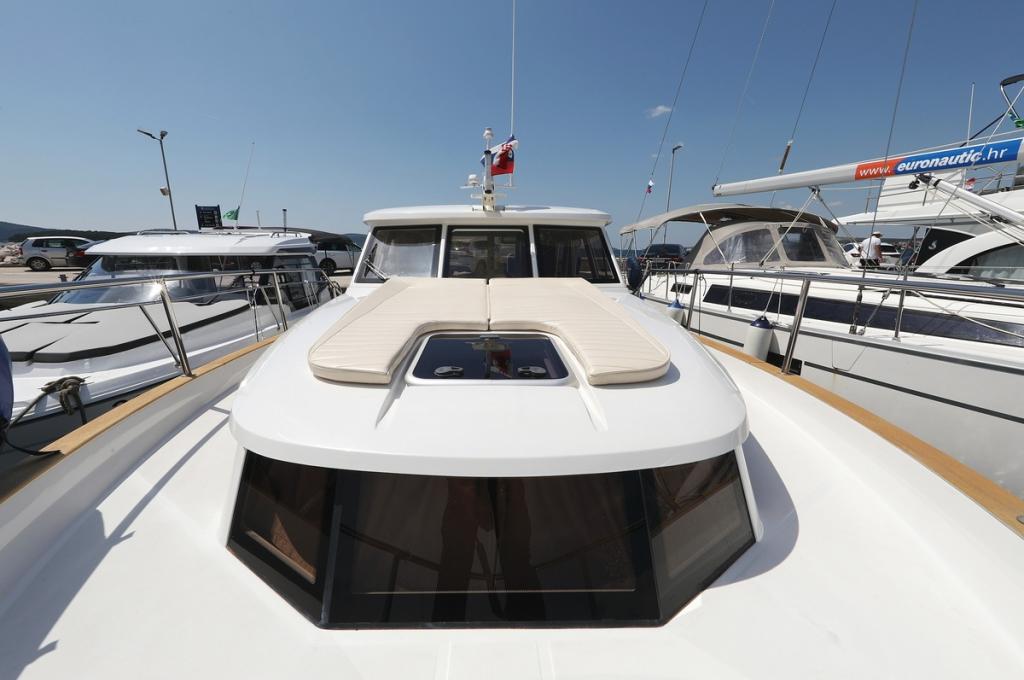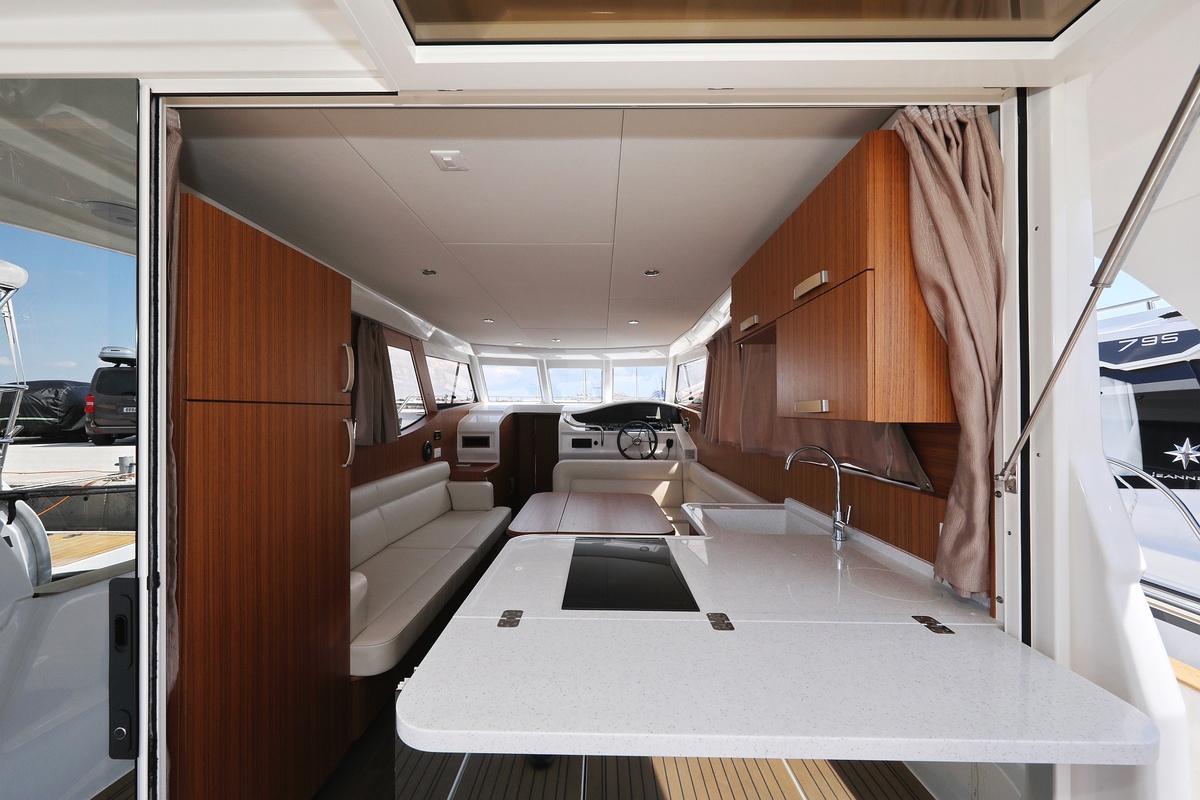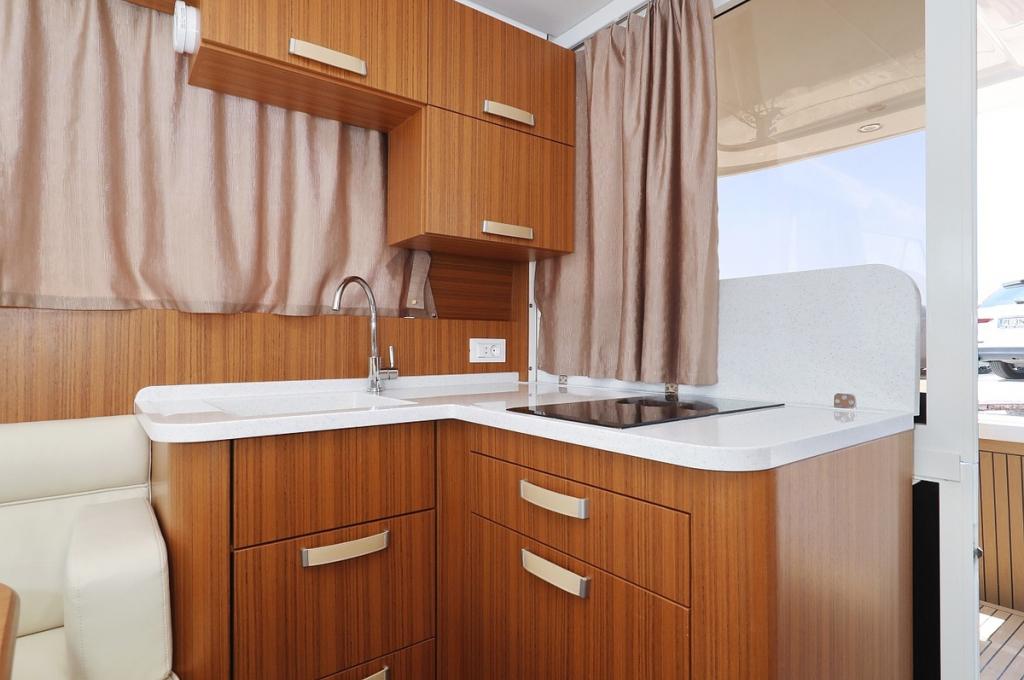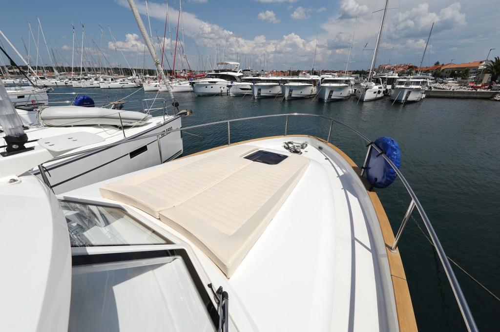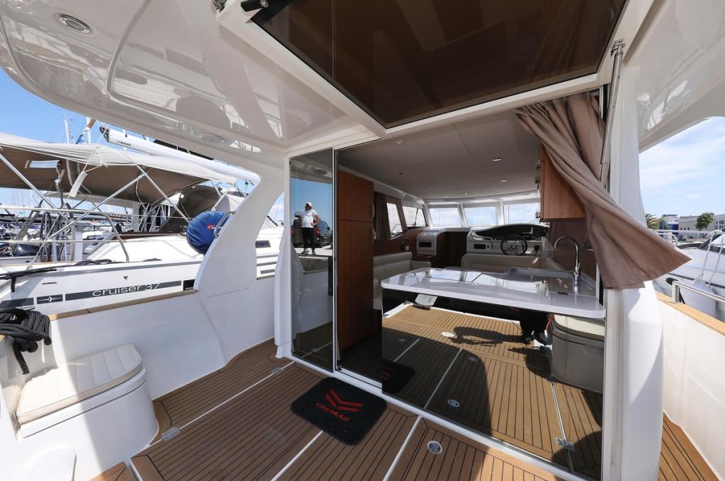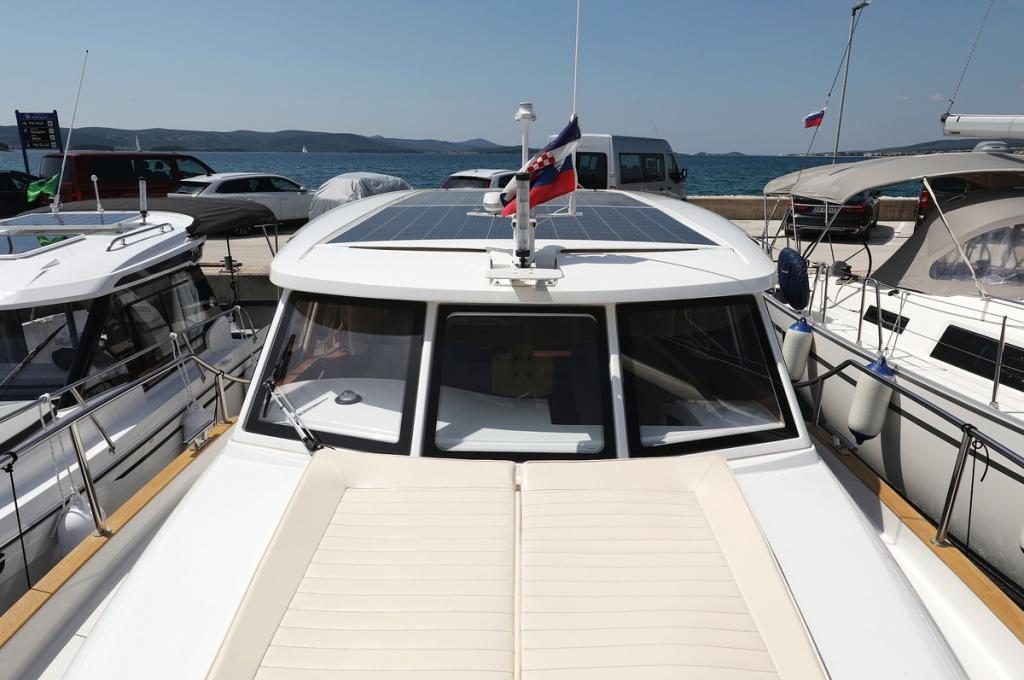 | Outside | 12 V-Anschluss, 220 V-Landanschluss, Anker mit Kette, Badeleiter, Badeplattform, Cockpitdusche, Cockpitlautsprecher, Cockpitpolster, Deckpolster, elektr. Ankerwinsch, Fender, Festmacherleinen, Solaranlage, Teak im Cockpit, Treibanker |