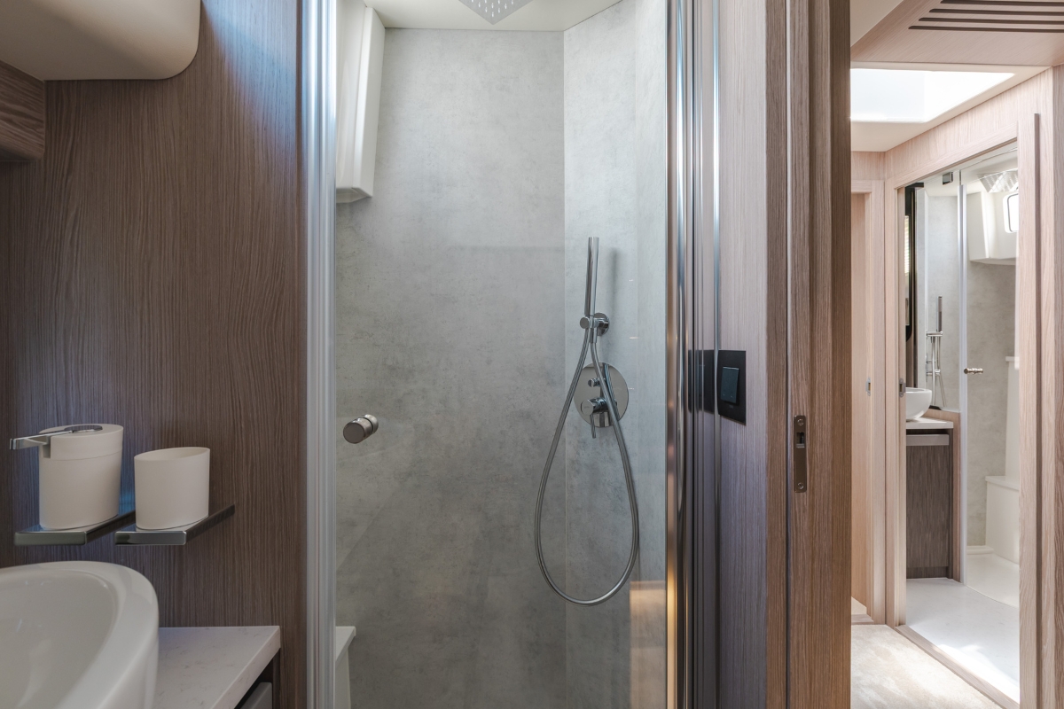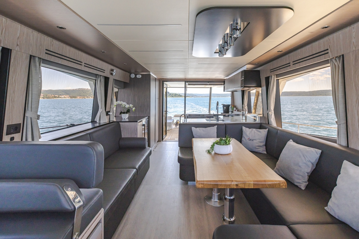 | Inside | Backofen, Eiswürfelmaschine, Espresso Maschine, FUSION Sound System, Generator, Geschirrspüler, Inverter 12V/220V, Klimaanlage, Moskitonetze, Pantryausstattung, Radio mit USB, Salontisch absenkbar, Spülbecken, TV, Waschmaschine, Watermaker, Wechselrichter, Weinkühlschrank |