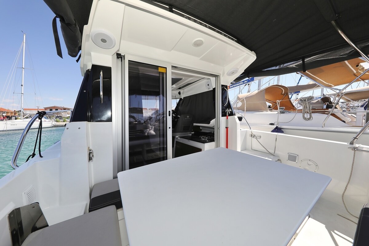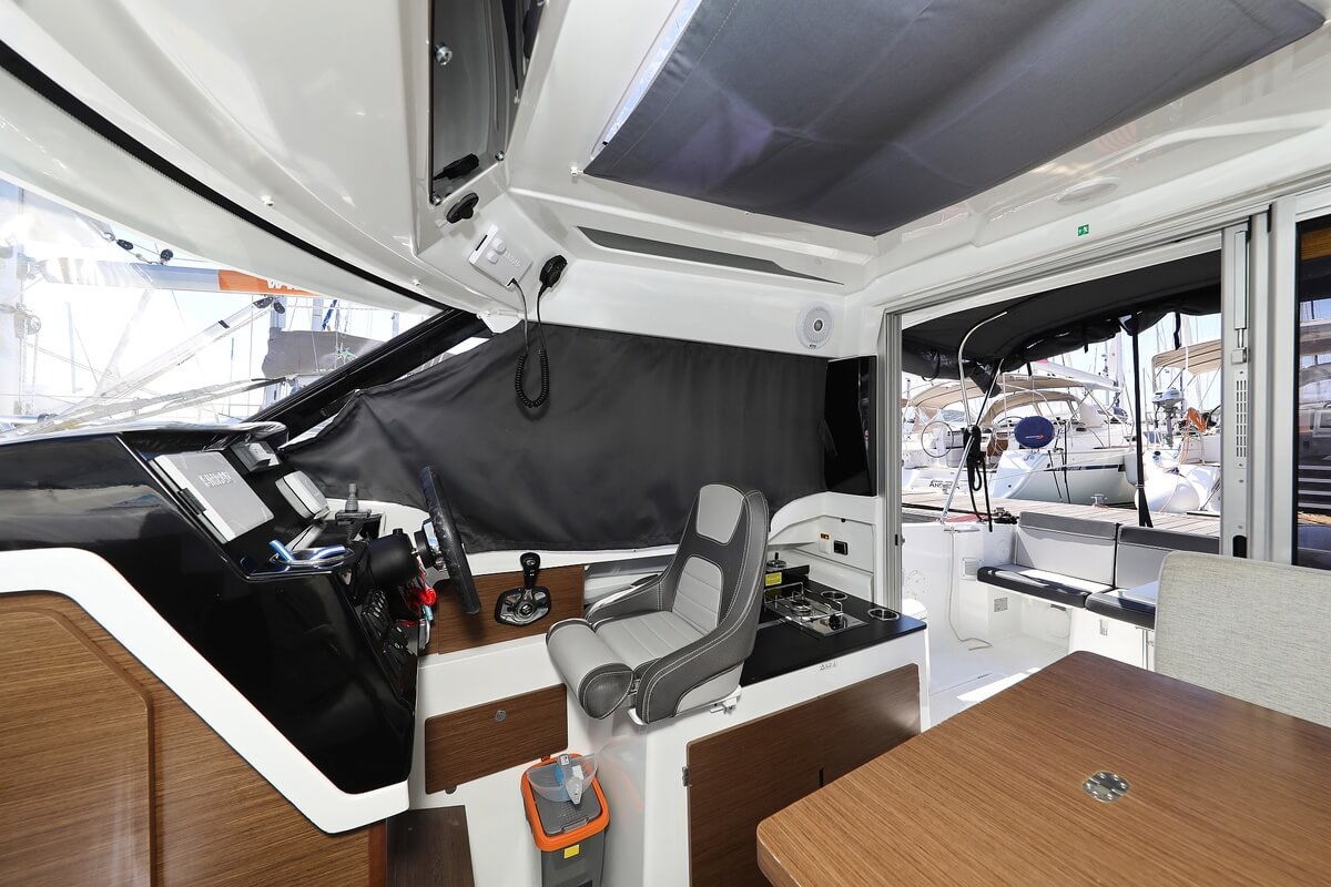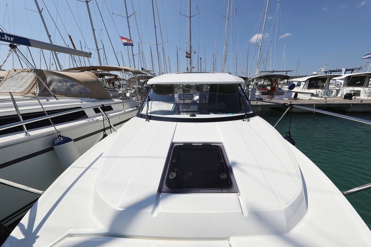 | Outside | Anker mit Kette, Badeleiter, Biminitop, Cockpitdusche, Cockpitpolster, Cockpittisch, elektr. Ankerwinsch, Fender, Festmacherleinen, Solaranlage, Wantenschneider |