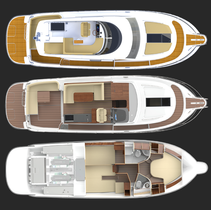 | Outside | 12 V-Anschluss, Badeleiter, Badeplattform, Bootshaken, Bugspriet, Cockpitdusche, Cockpitpolster, Cockpittisch, Teakdeck |