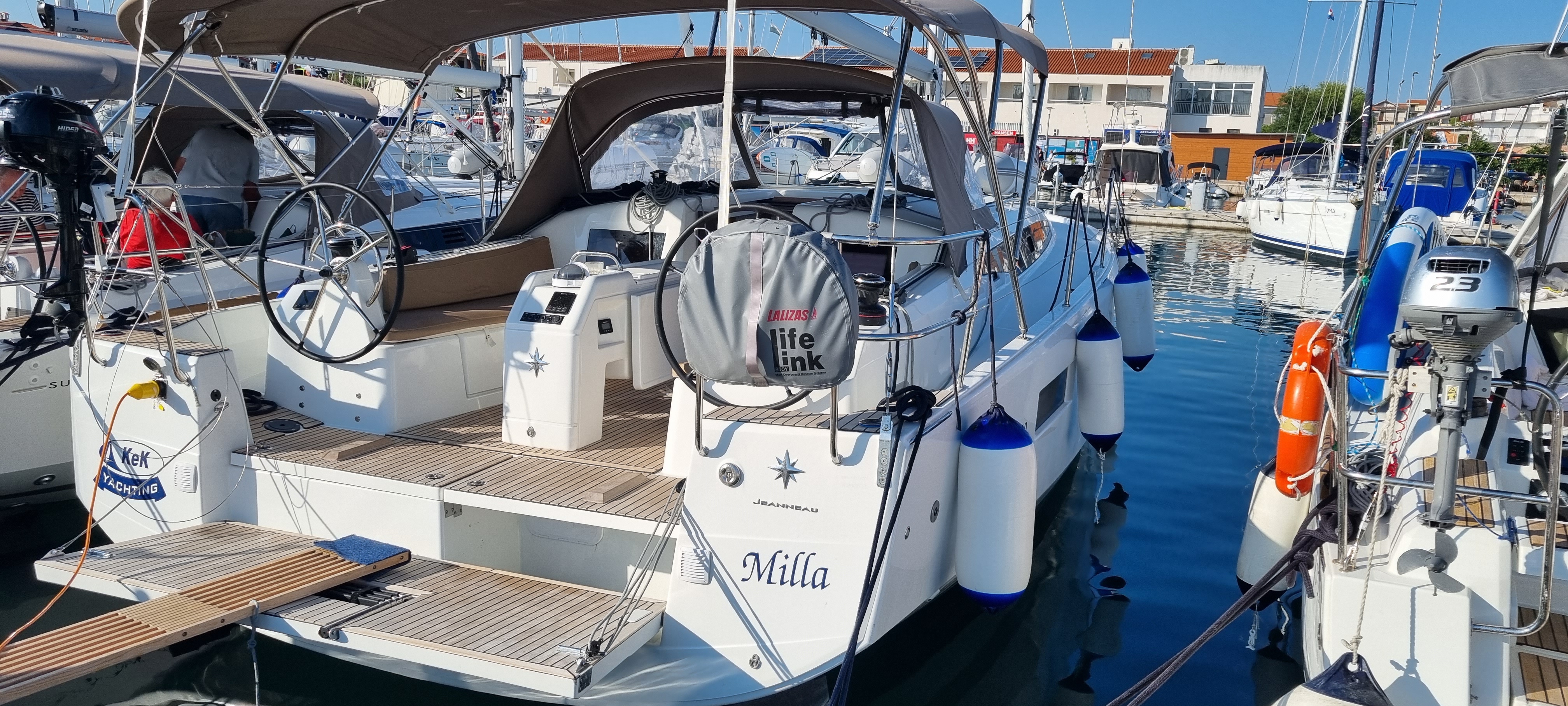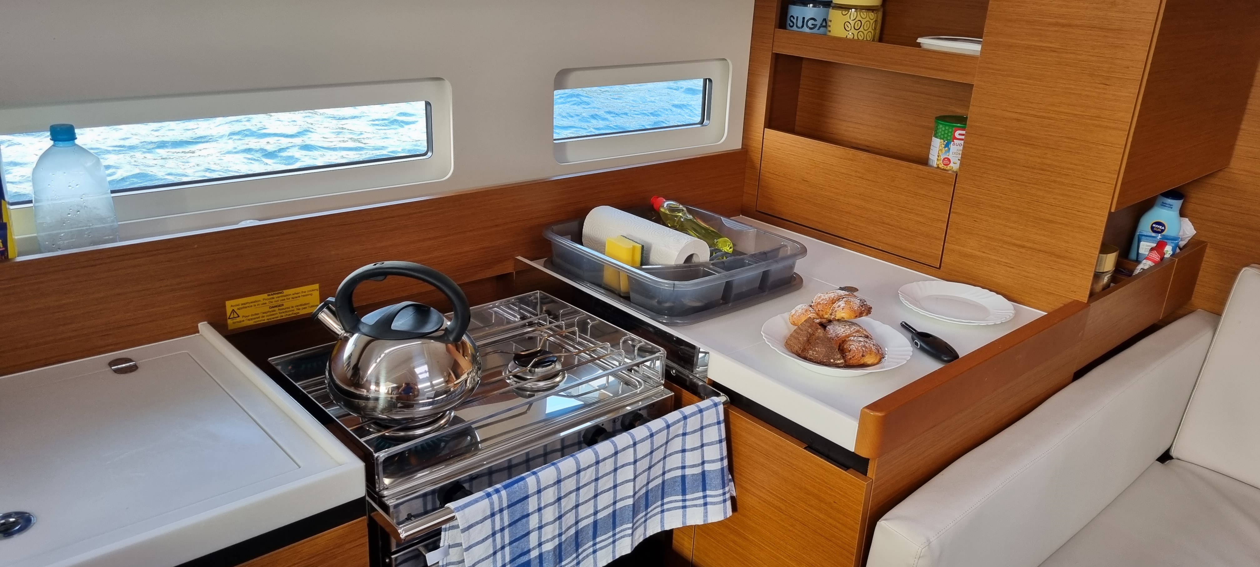 | Safety | Automatikwesten, Autopilot, Bootsmannstuhl, Bordapotheke, Bugstrahlruder, elektr. Bilgepumpe, Feuerlöscher, GMDSS, Löschdecke, Notpinne, Notsignale, Radarreflektor, Rettungskragen, UKW-Funk |
