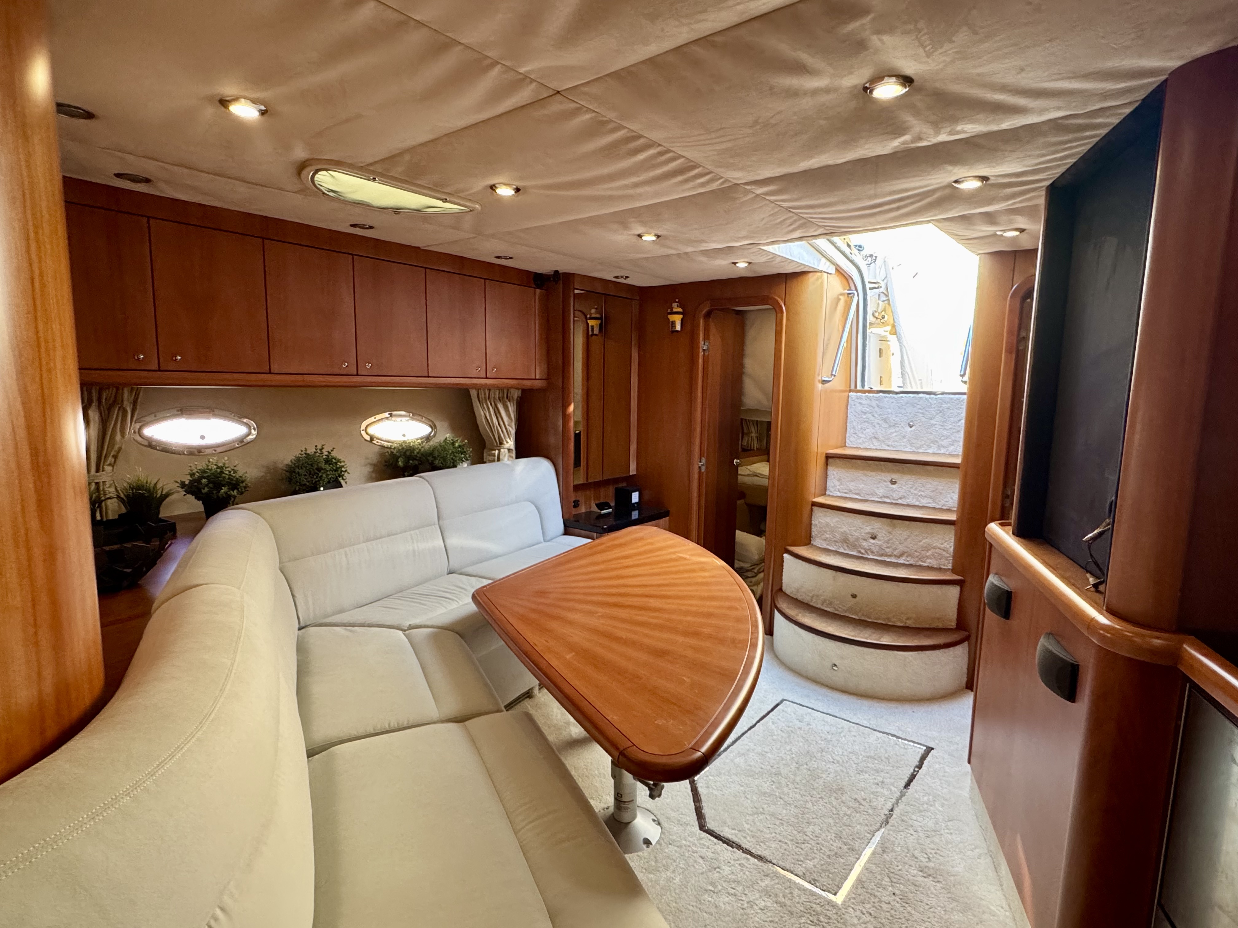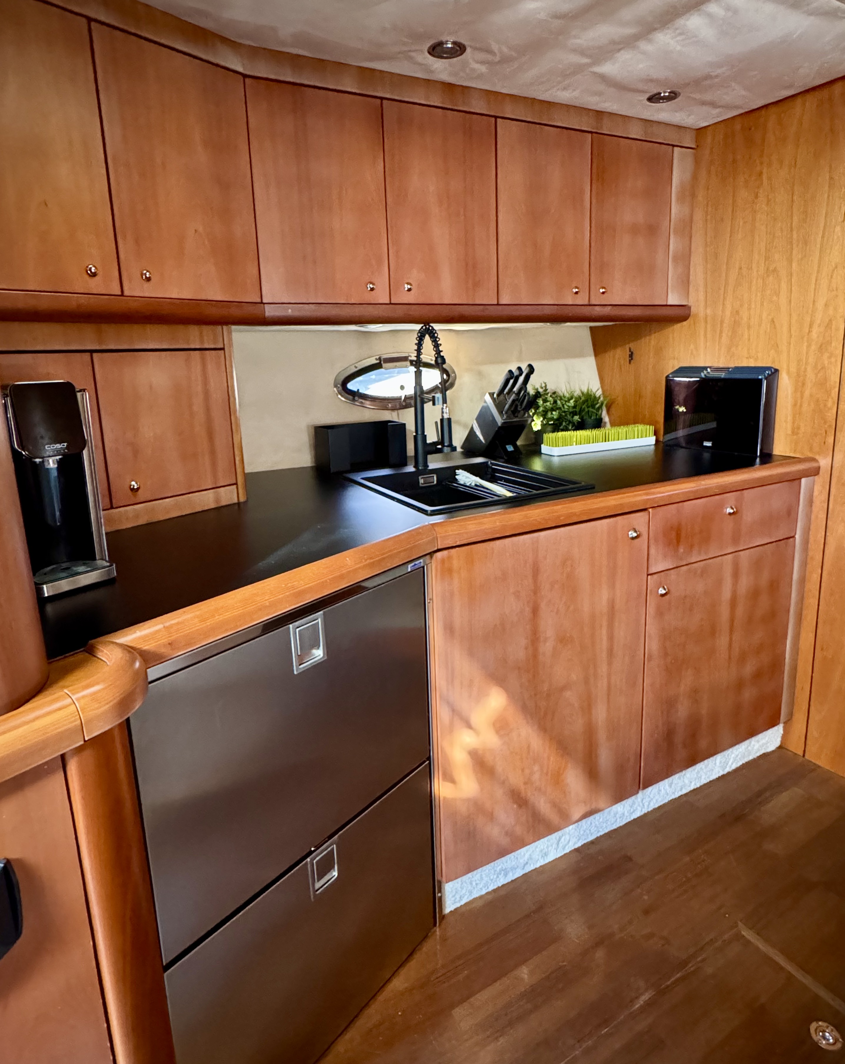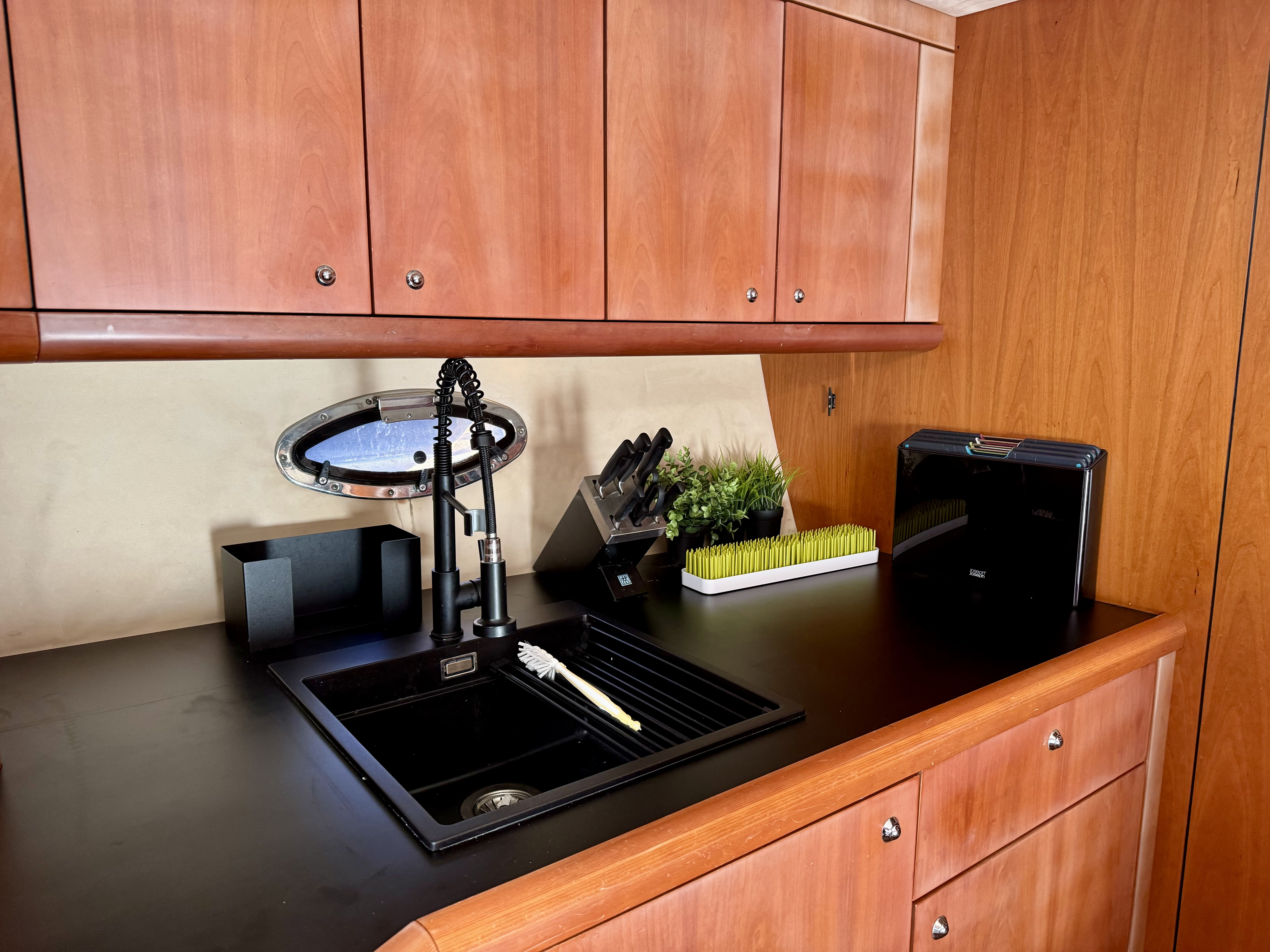 | Inside | Eiswürfelmaschine, Gasherd mit Backofen, Generator, Heizung, Kaffeemaschine, Klimaanlage (ohne Landstrombedarf), Kühlschrank mit Gefrierfach, Lautsprecher in Salon und Cockpit, Pantryausstattung, TV, Watermaker |