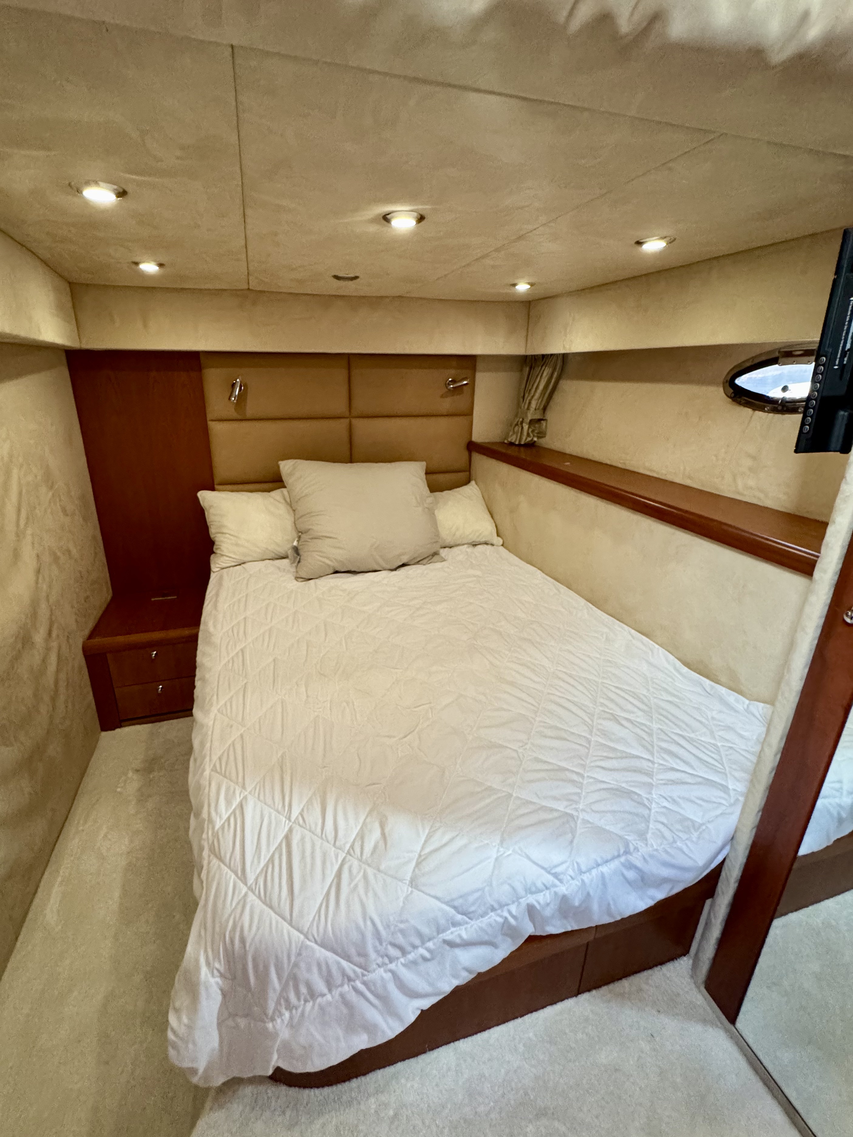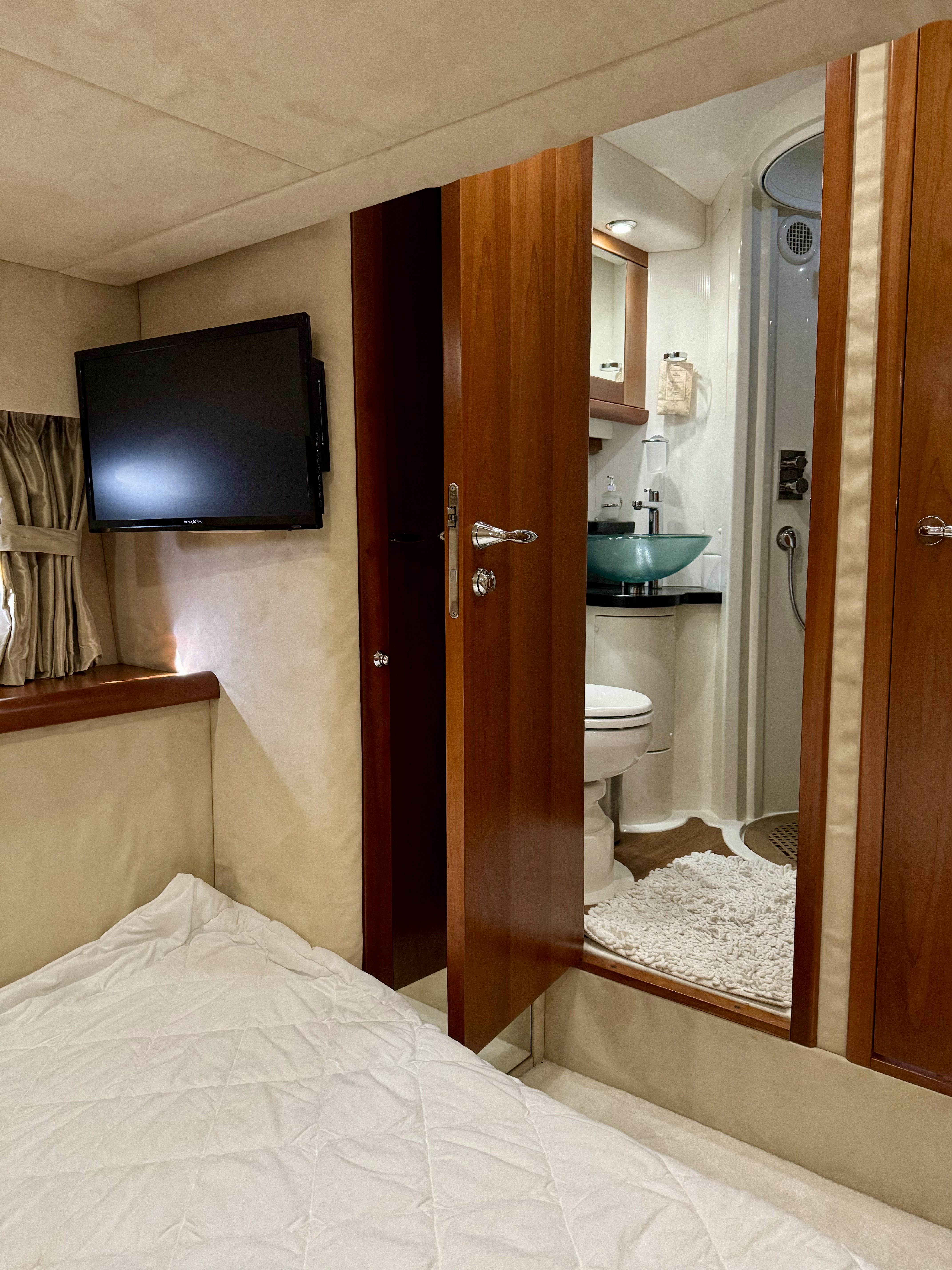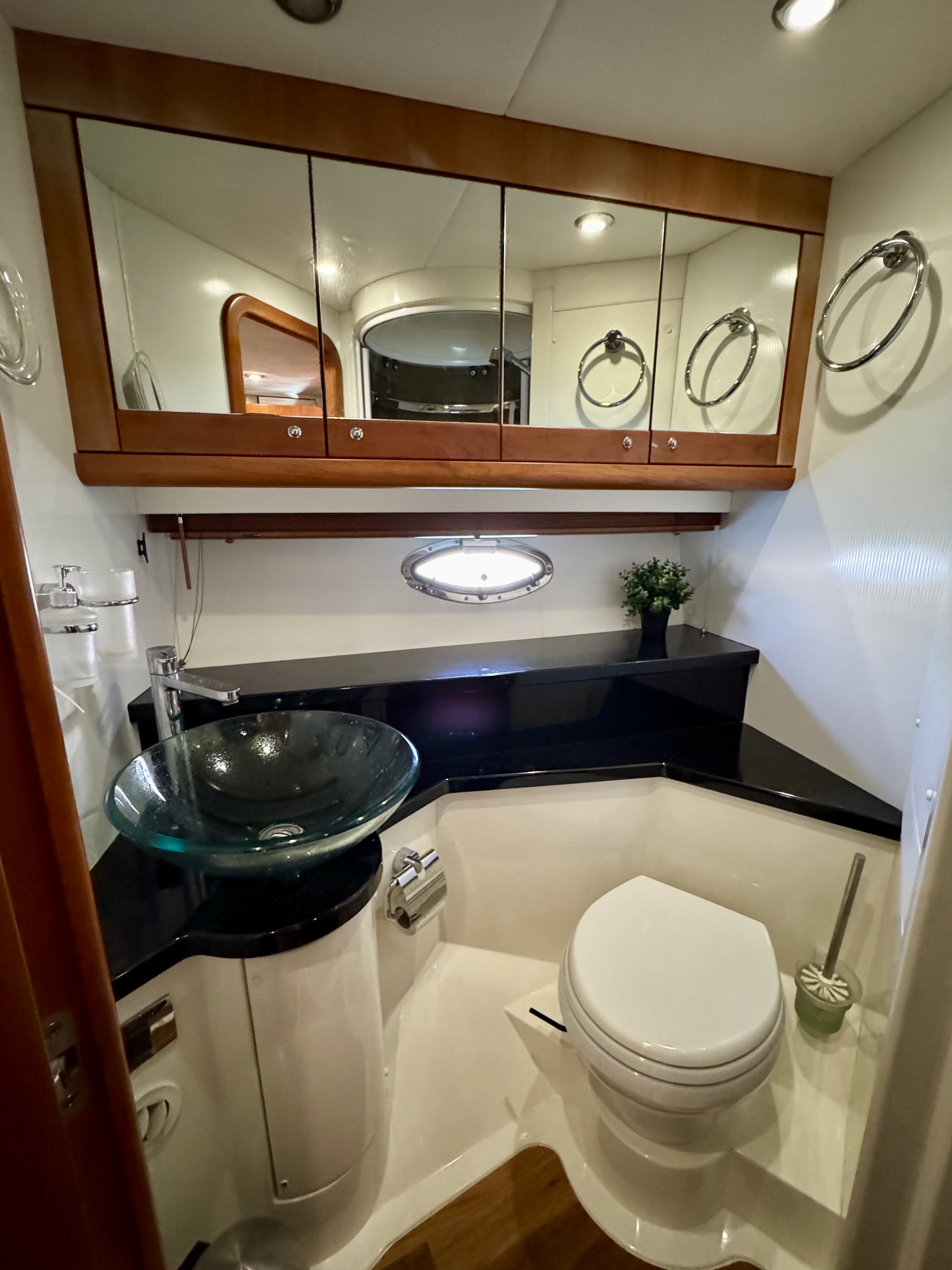| Inside | Eiswürfelmaschine, Gasherd mit Backofen, Generator, Heizung, Kaffeemaschine, Klimaanlage (ohne Landstrombedarf), Kühlschrank mit Gefrierfach, Lautsprecher in Salon und Cockpit, Pantryausstattung, TV, Watermaker |