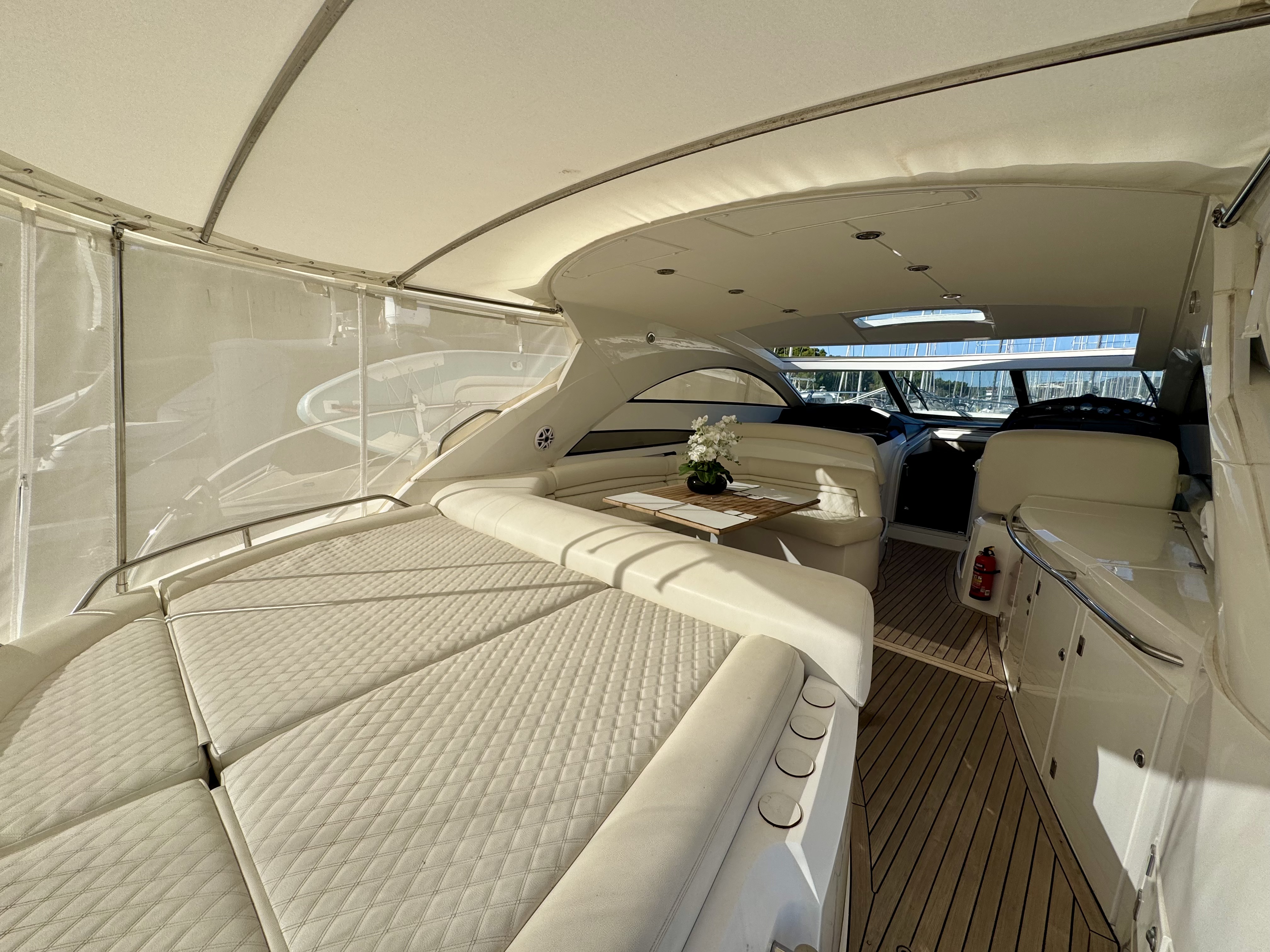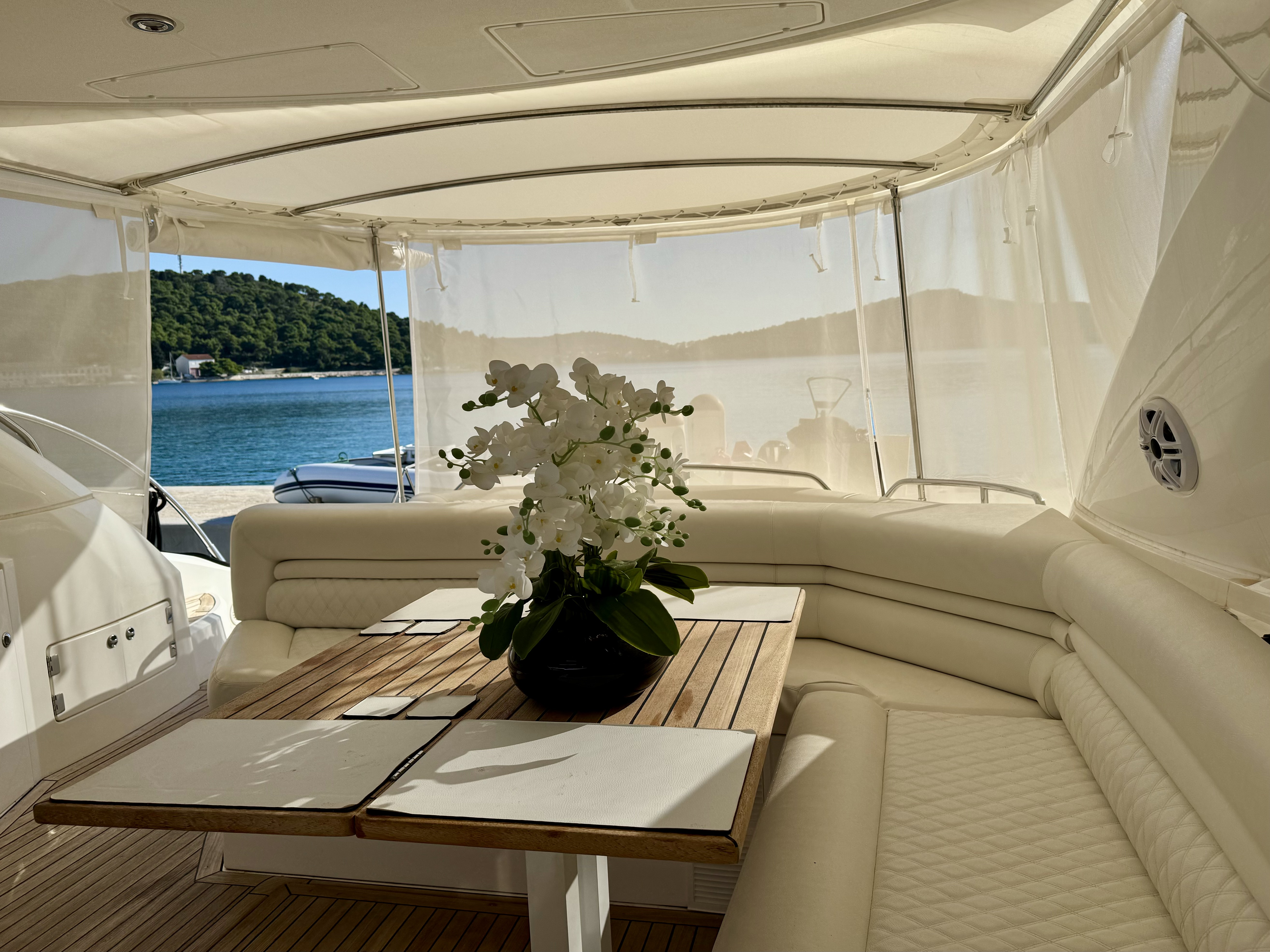 | Outside | Badeplattform, Biminitop, Cockpitdusche, Deckpolster, Teakdeck |