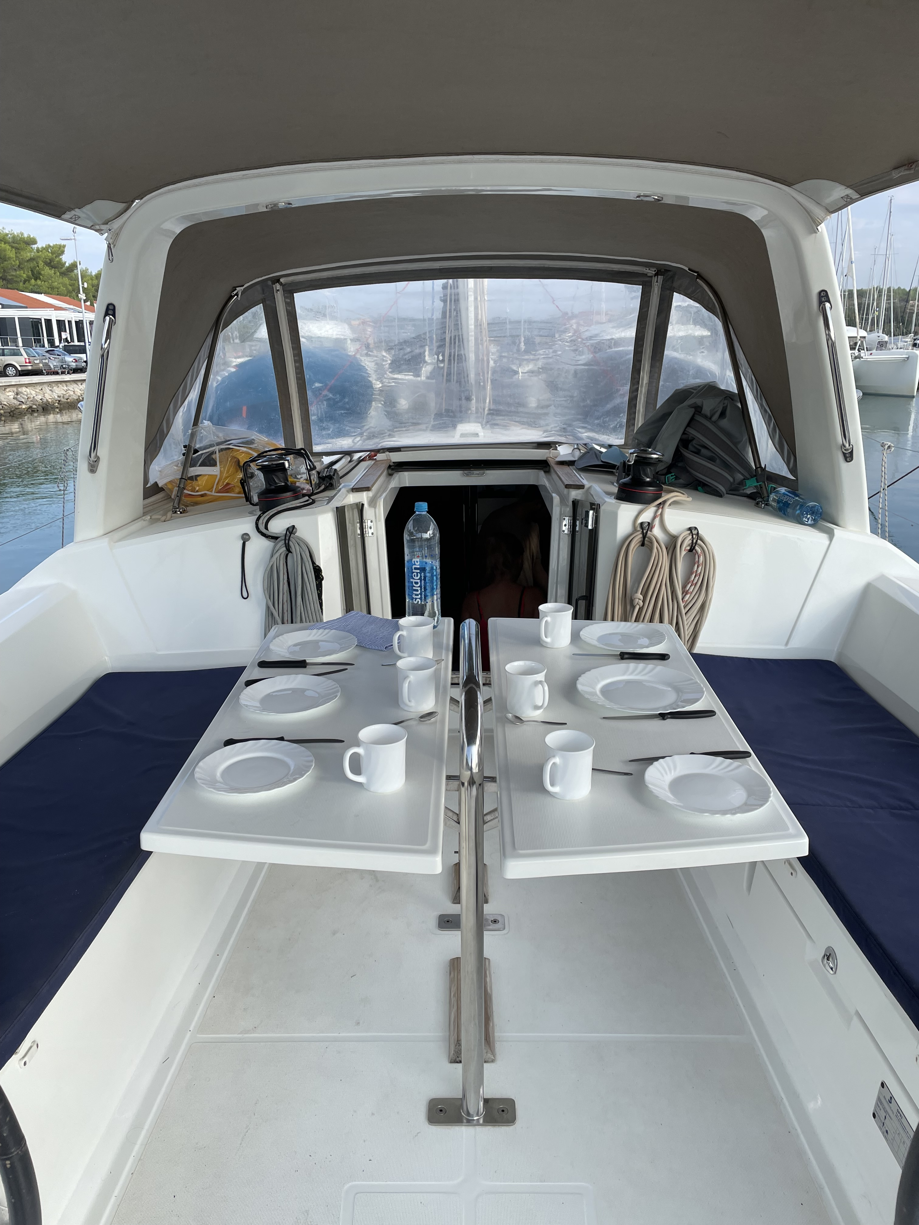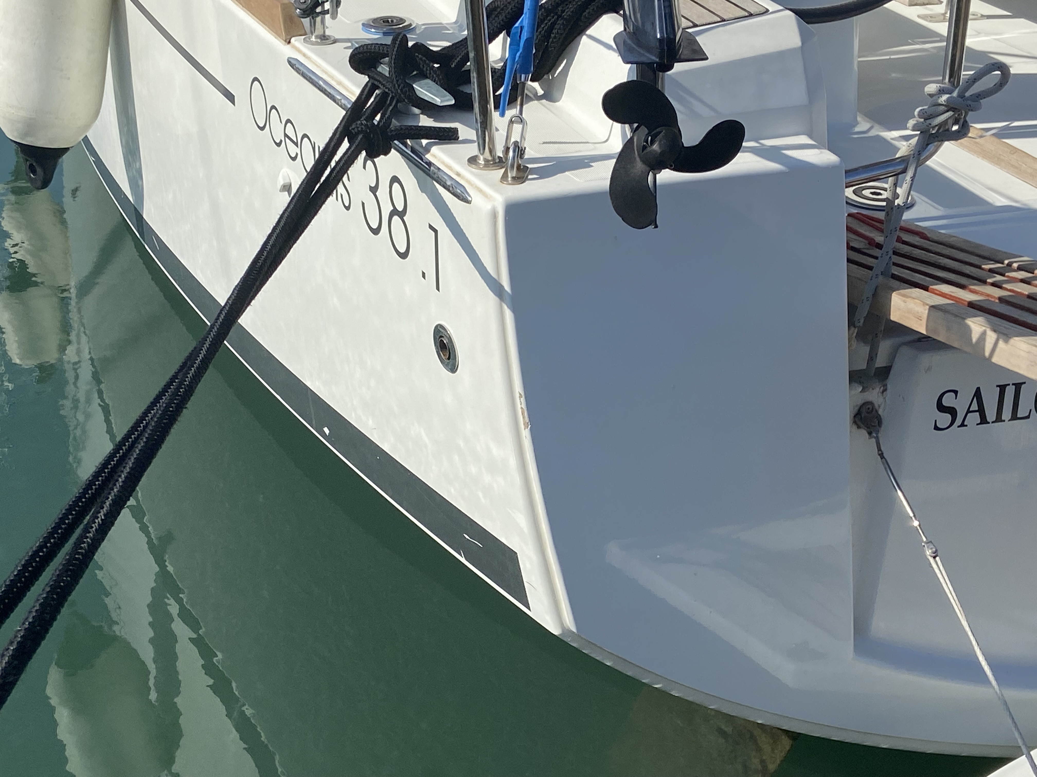 | Outside | 220 V-Landanschluss, Anker mit Kette, Biminitop, Bootshaken, Cockpitdusche warm/kalt, Cockpitlautsprecher, Cockpittisch, elektr. Ankerwinsch, Fender, Fernsteuerung für elektr. Ankerwinsch, Gangway, Kugelfender, Sprayhood |