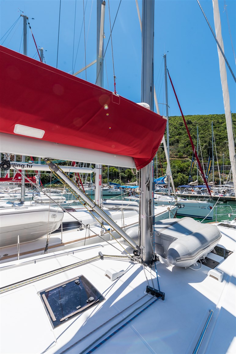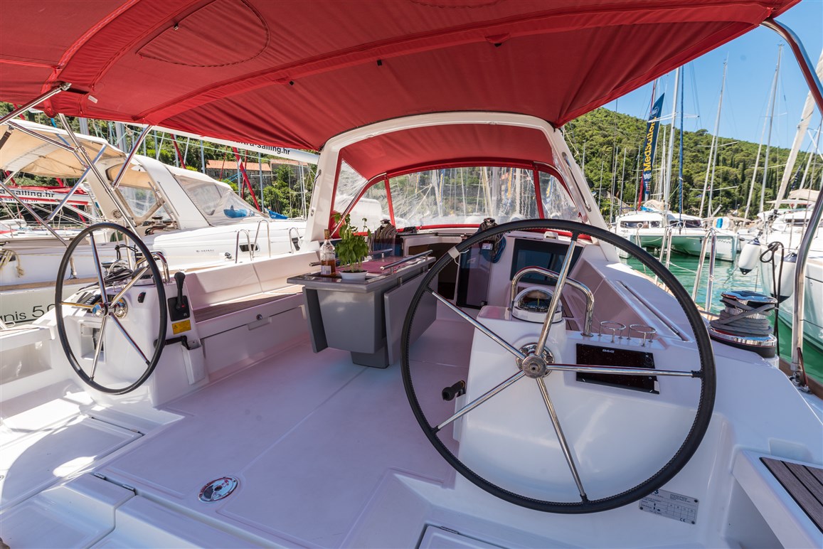 | Outside | 220 V-Landanschluss, Anker mit Kette, Biminitop, Bootshaken, Cockpitdusche, Cockpitlautsprecher, Cockpittisch, elektr. Ankerwinsch, Fender, Gangway, Solaranlage, Sprayhood |
