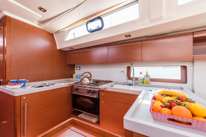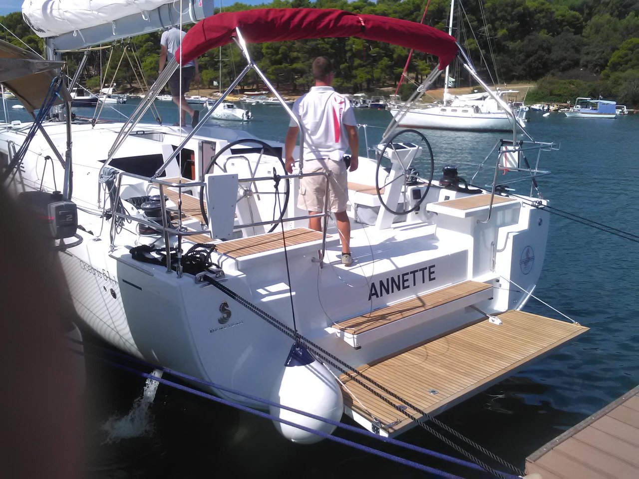 | Outside | 220 V-Landanschluss, Anker mit Kette, Ankerkettenzähler, Badeplattform, Biminitop, Bootshaken, Cockpitdusche, Cockpitkühlschrank, Cockpitlautsprecher, Cockpitpolster, Cockpittisch, elektr. Ankerwinsch, elektr. Winsch, Fender, Gangway, Kugelfender, Solaranlage, Sprayhood, Teak im Cockpit |