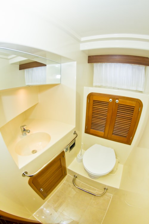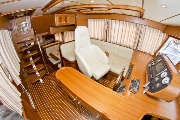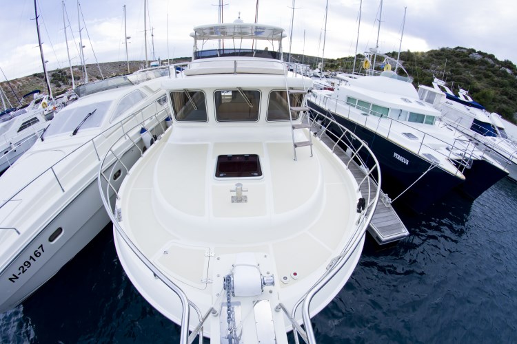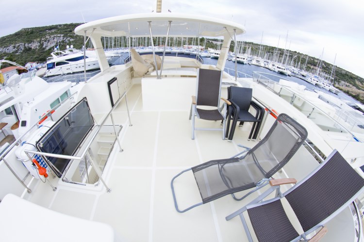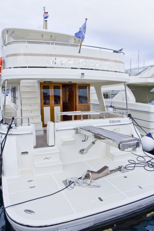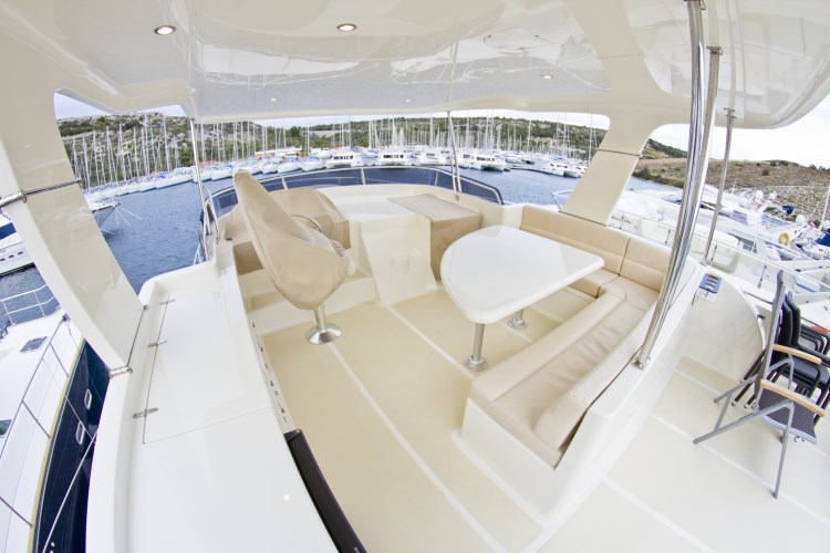 | Outside | 220 V-Landanschluss, Anker mit Kette, Badeleiter, Badeplattform, Cockpitdusche, Cockpitkühlschrank, elektr. Ankerwinsch, Fender, Festmacherleinen, Flybridge, Hardtop, Heckwinsch (hydr.), hydraul. Gangway, Solaranlage, Sonnendeck, Teak im Cockpit, Wet Bar auf Flybridge |