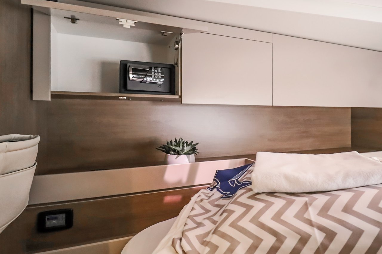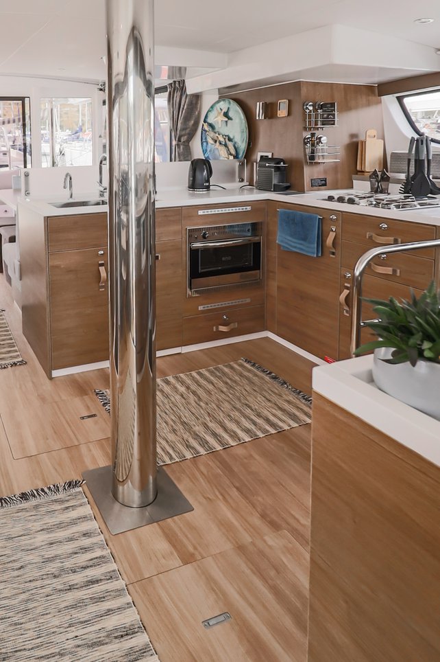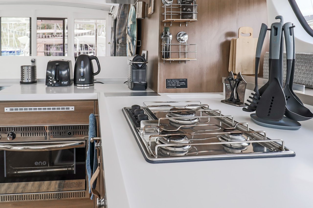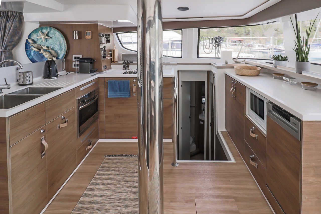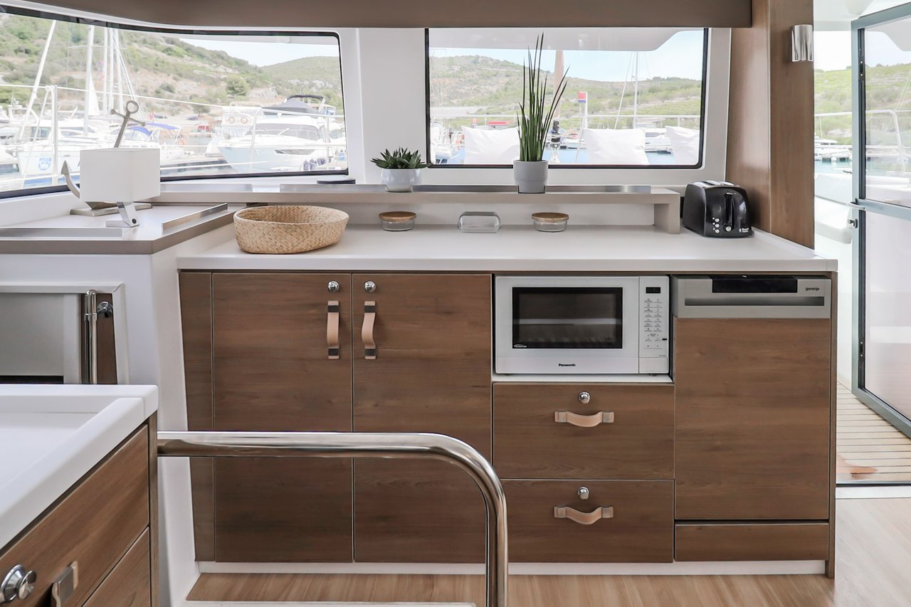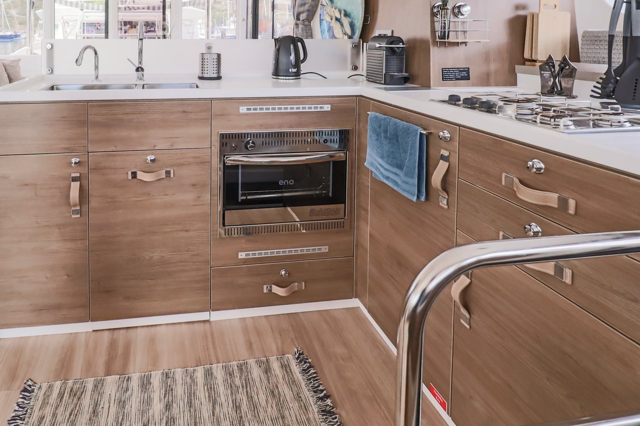 | Inside | Backofen, FUSION Sound System, Gasherd, Gefrierschrank, Generator, Geschirrspüler, Heizung, Inverter 12V/220V, Kaffeemaschine, Klimaanlage (ohne Landstrombedarf), Kühlschrank, Ladegerät, LCD Fernseher, Mikrowelle, Pantryausstattung, Safe für Wertsachen, Ventilatoren in Kabinen, Warmwasser, WC (elektr.) |