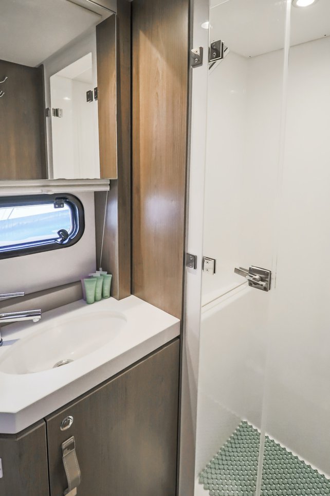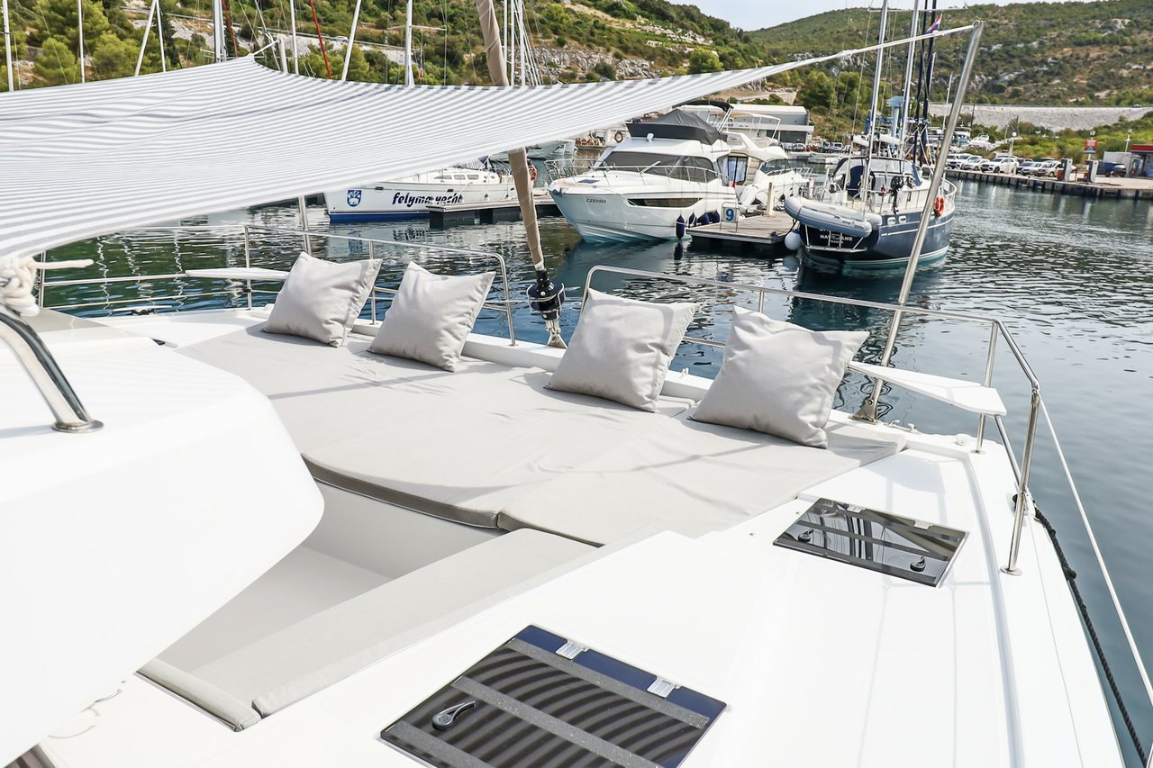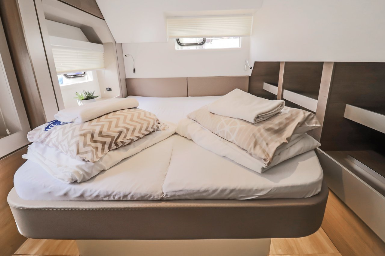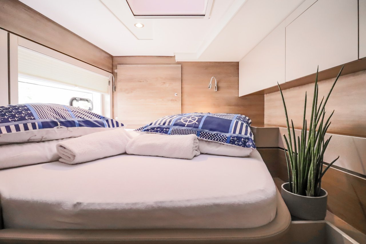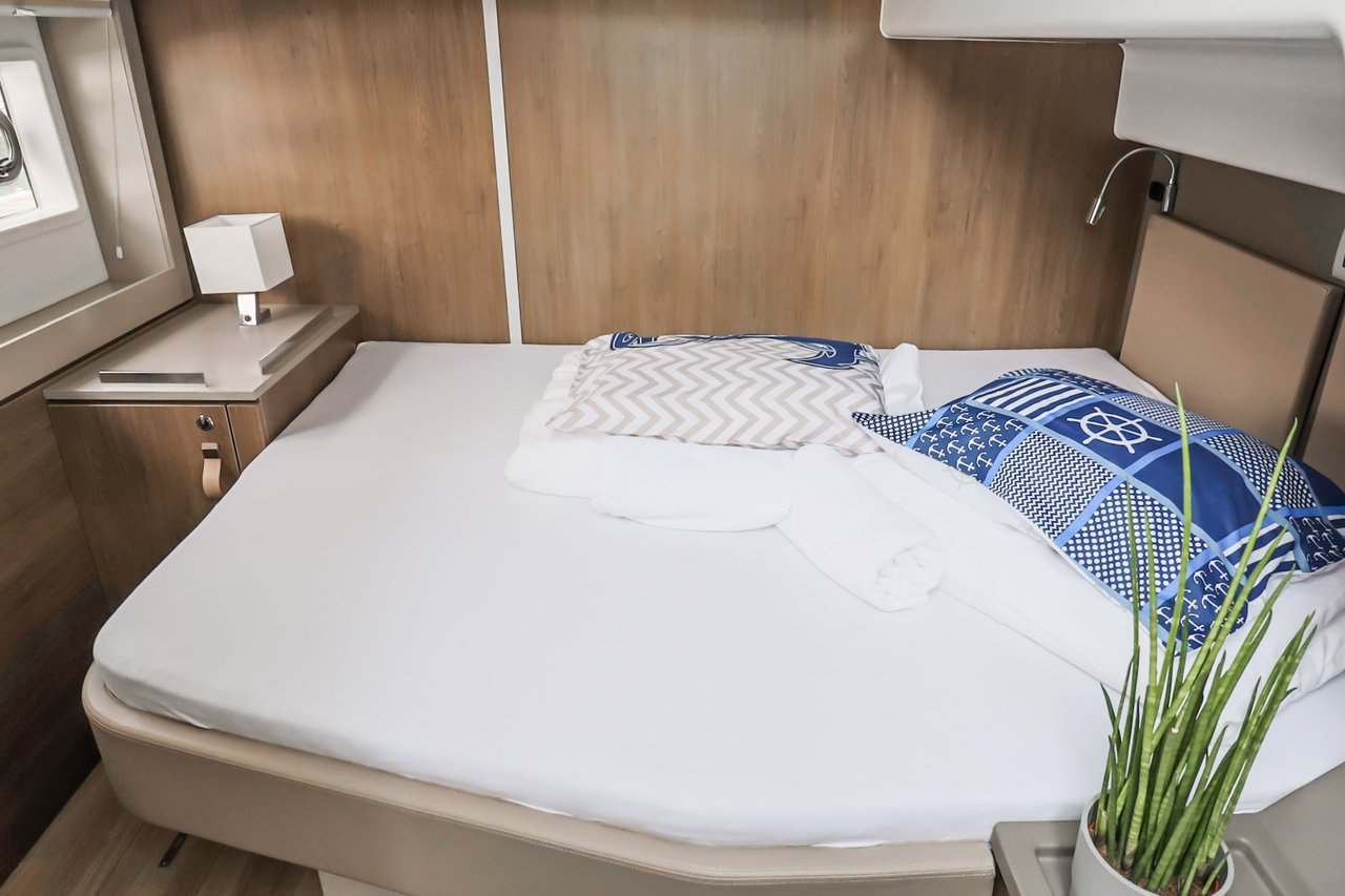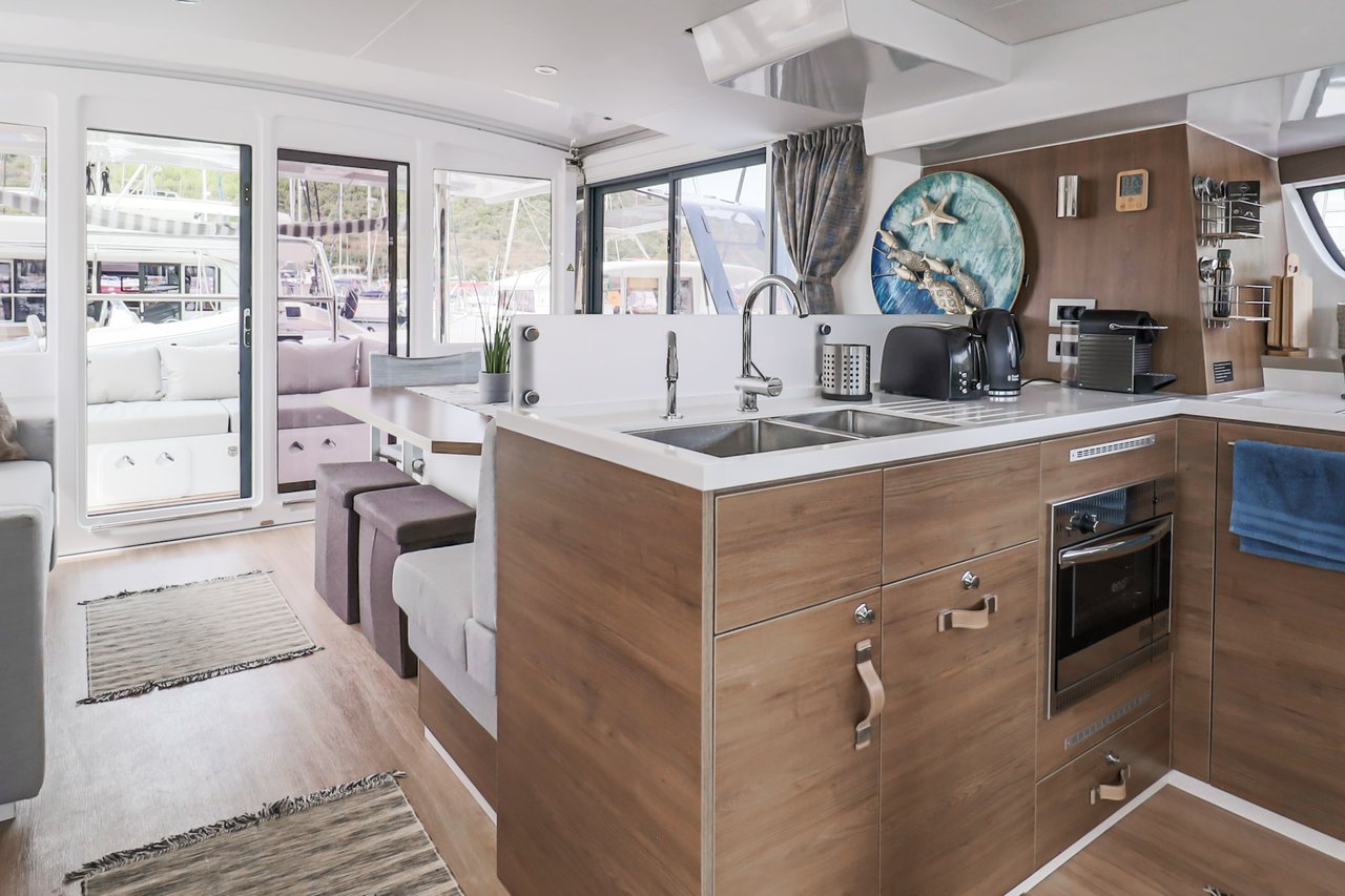 | Inside | Backofen, FUSION Sound System, Gasherd, Gefrierschrank, Generator, Geschirrspüler, Heizung, Inverter 12V/220V, Kaffeemaschine, Klimaanlage (ohne Landstrombedarf), Kühlschrank, Ladegerät, LCD Fernseher, Mikrowelle, Pantryausstattung, Safe für Wertsachen, Ventilatoren in Kabinen, Warmwasser, WC (elektr.) |