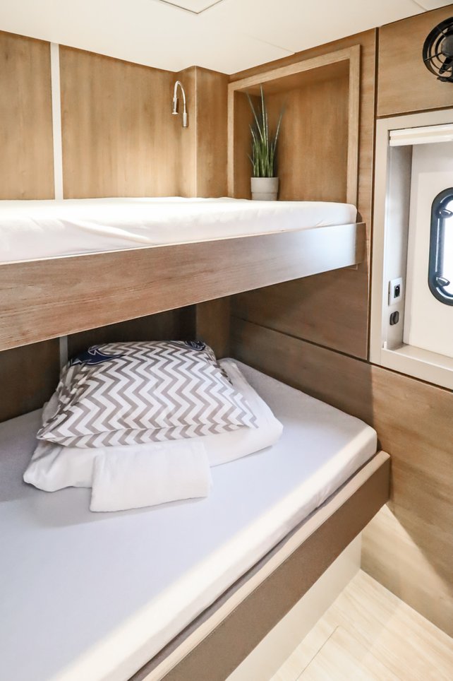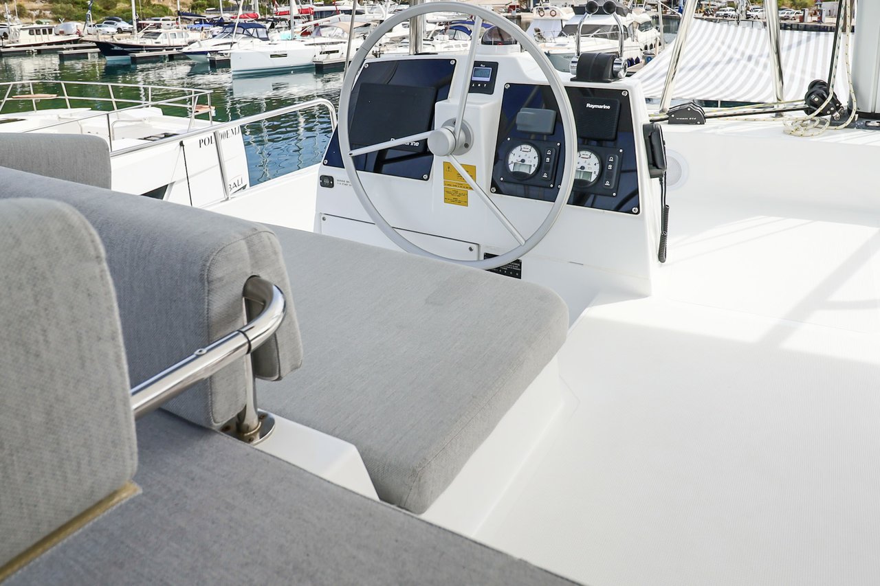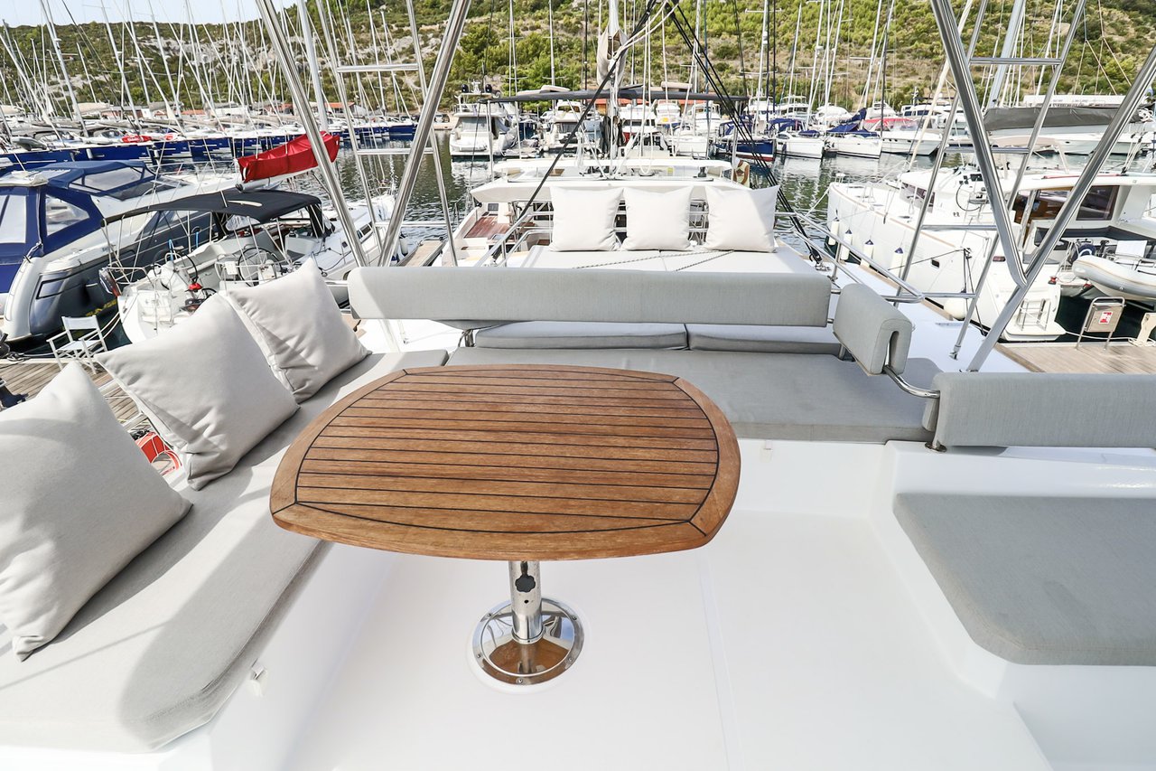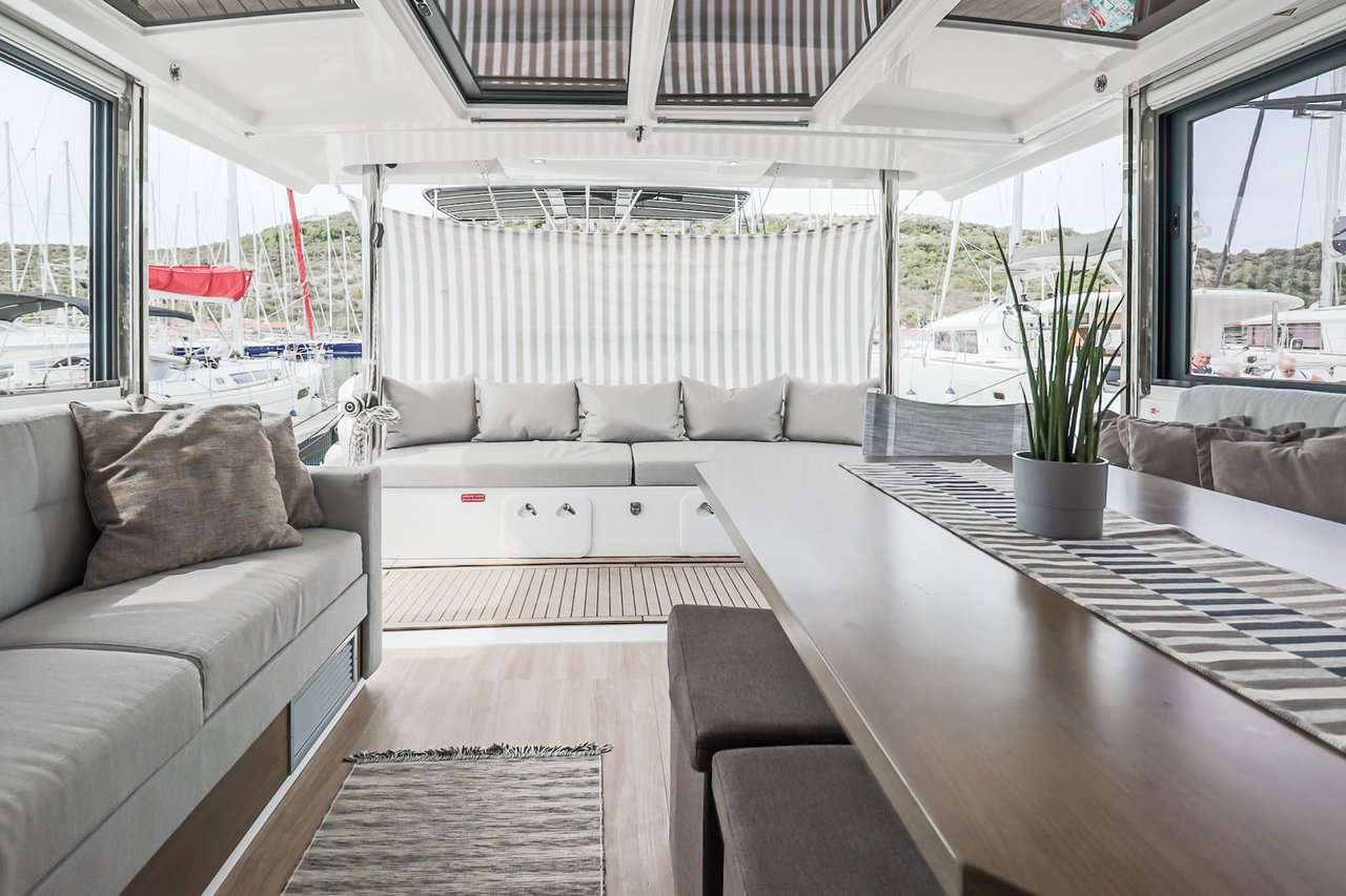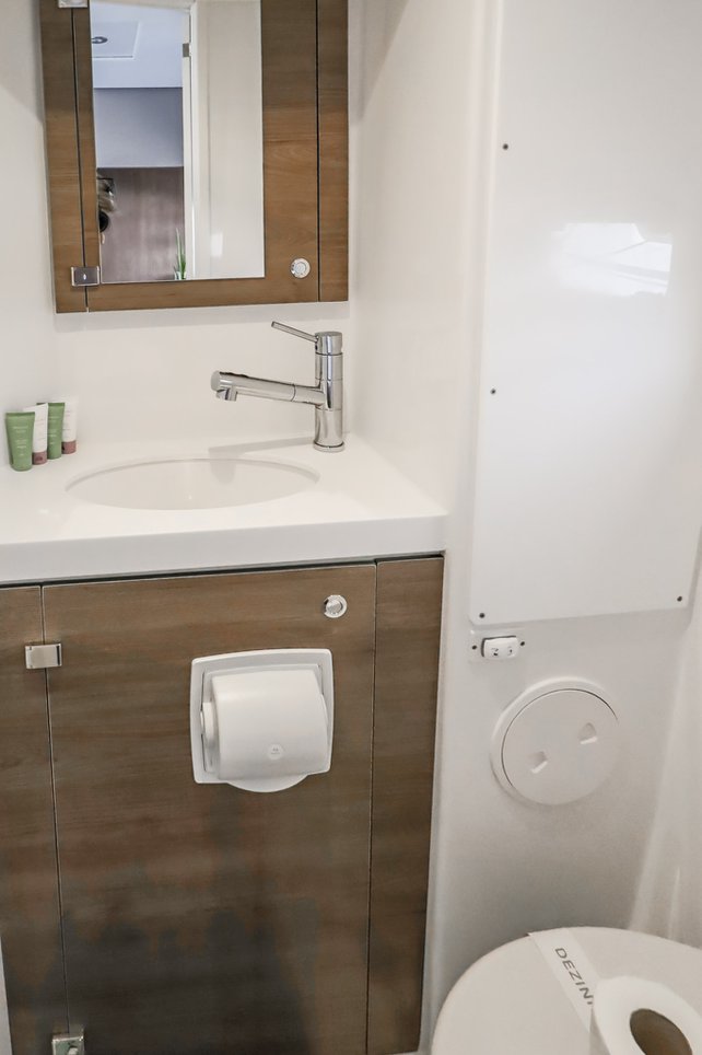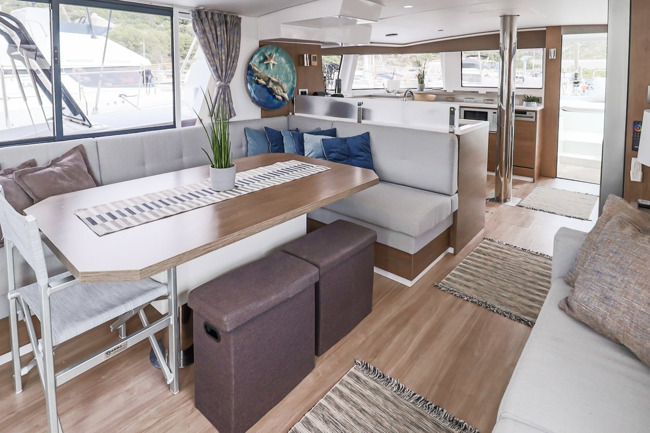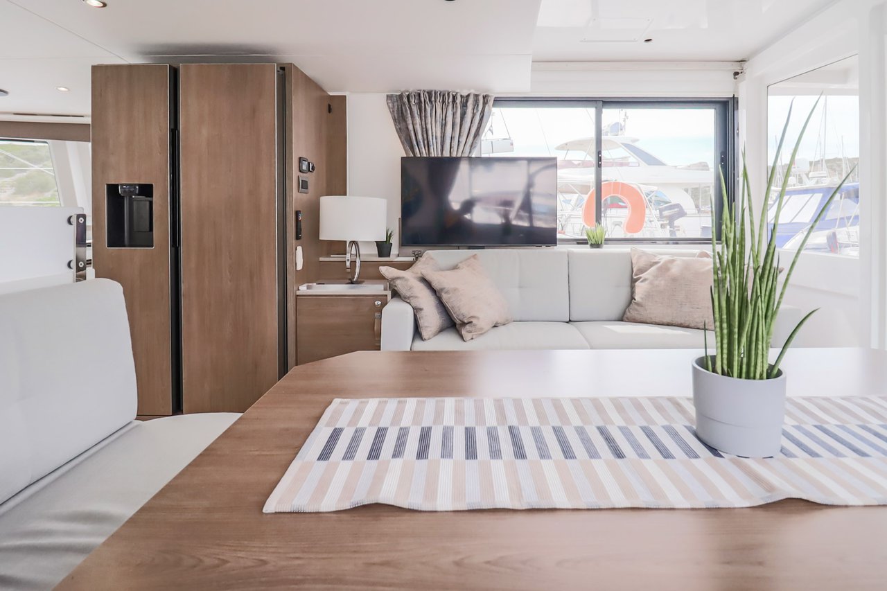 | Inside | Backofen, FUSION Sound System, Gasherd, Gefrierschrank, Generator, Geschirrspüler, Heizung, Inverter 12V/220V, Kaffeemaschine, Klimaanlage (ohne Landstrombedarf), Kühlschrank, Ladegerät, LCD Fernseher, Mikrowelle, Pantryausstattung, Safe für Wertsachen, Ventilatoren in Kabinen, Warmwasser, WC (elektr.) |