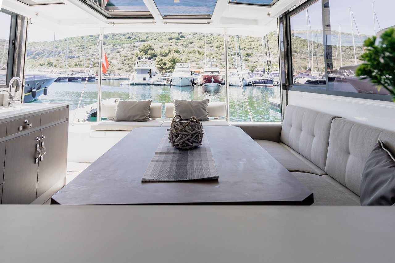 | Outside | 12 V-Anschluss, Anker mit Kette, Badeleiter, Badeplattform (hydr.), Cockpitdusche, Cockpitpolster, Cockpittisch, Deckpolster, elektr. Ankerwinsch, Grill, Hardtop, Unterwasserbeleuchtung |