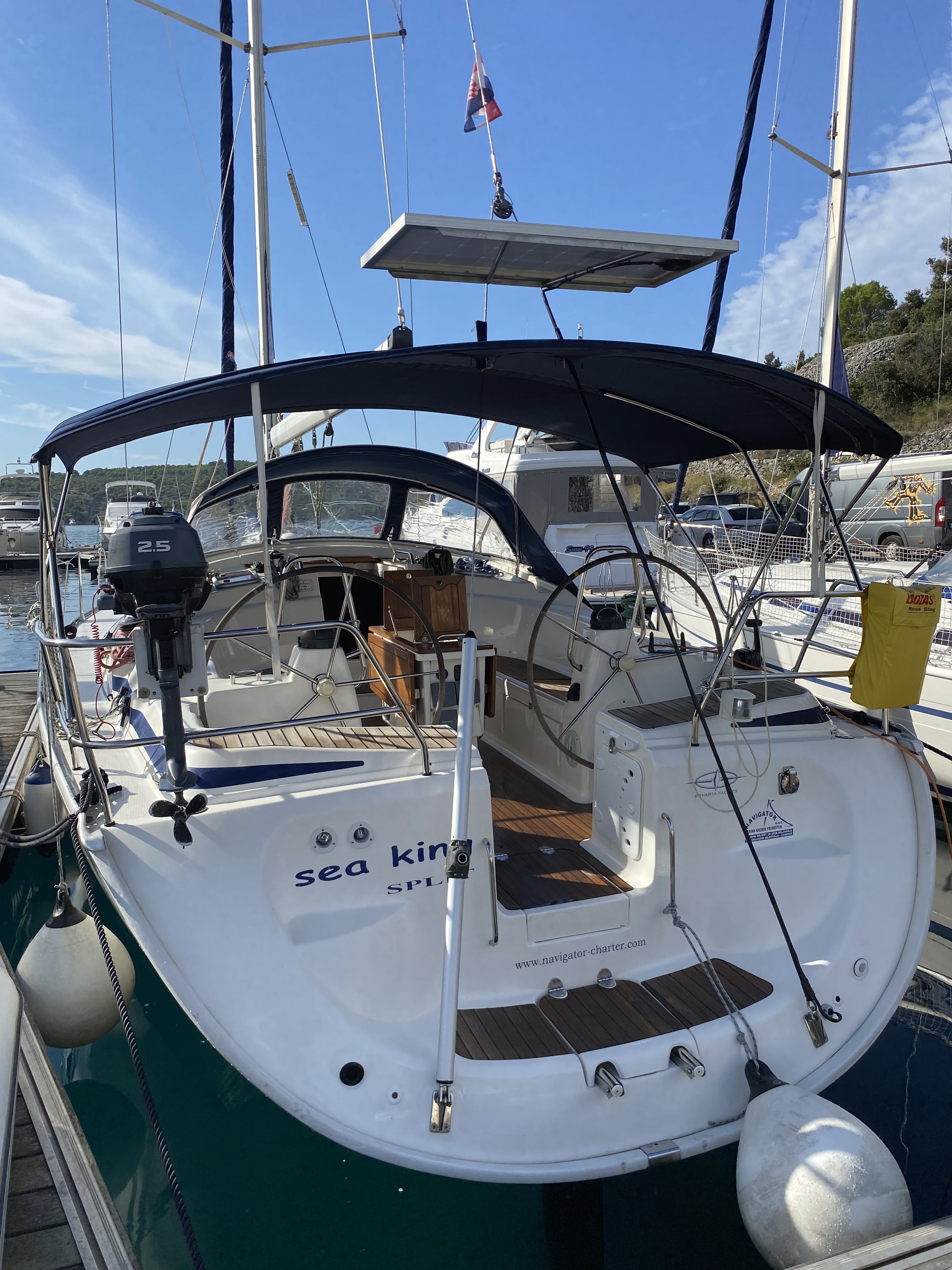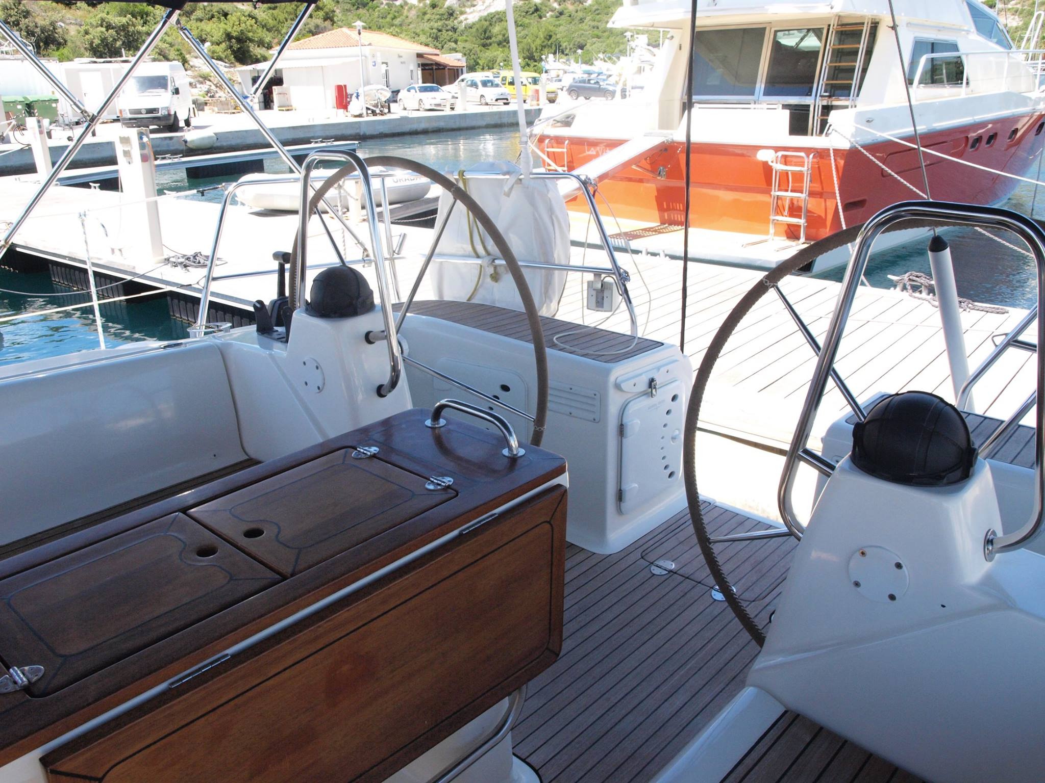 | Outside | 12 V-Anschluss, 220 V-Landanschluss, Biminitop, Cockpitdusche, Cockpitpolster, Cockpittisch, elektr. Ankerwinsch, Selbstholende Winschen, Solaranlage, Sprayhood |
