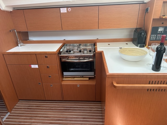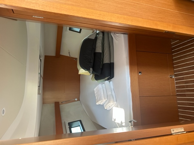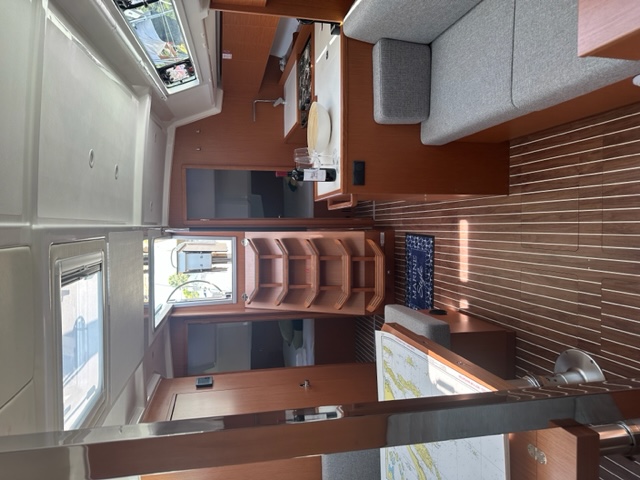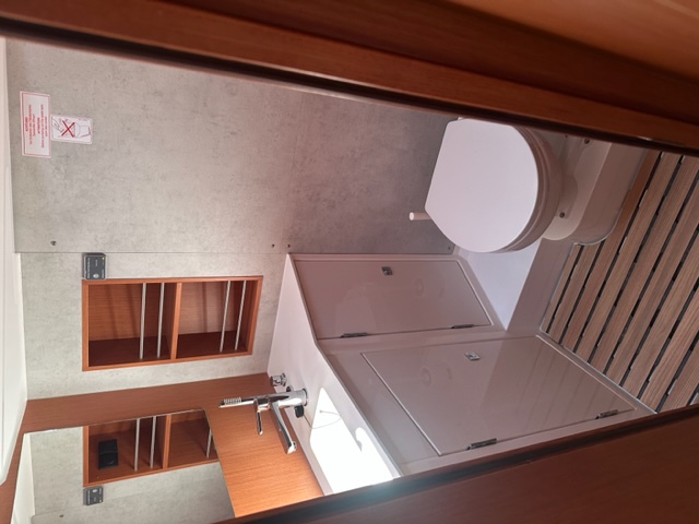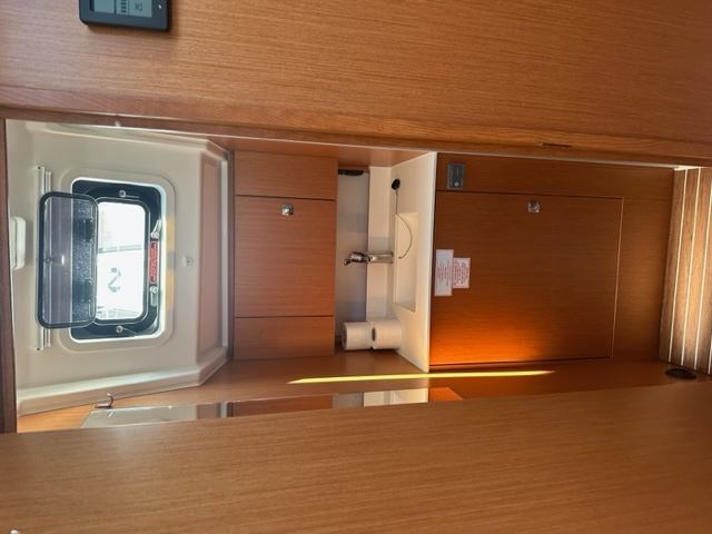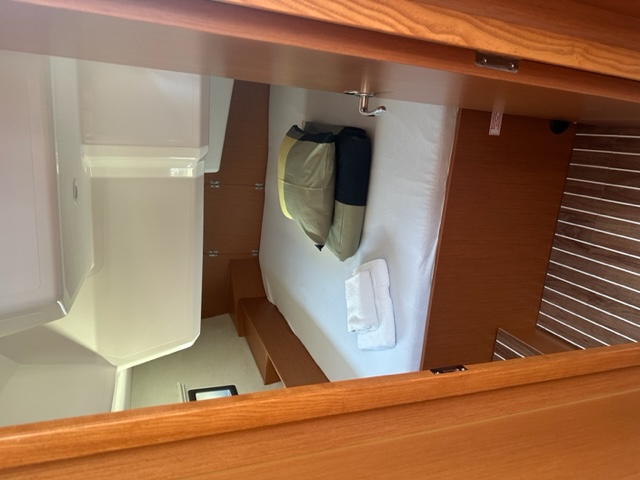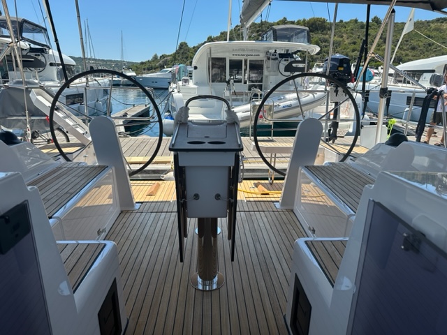| Outside | 220 V-Landanschluss, Anker mit Kette, Badeplattform, Biminitop, Bootshaken, Cockpitdusche, Cockpitlautsprecher, Cockpitpolster, Cockpittisch, elektr. Ankerwinsch, Fender, Festmacherleinen, Gangway, Solaranlage, Sprayhood, Teak im Cockpit, Wasserschlauch, Windex, Winschen |