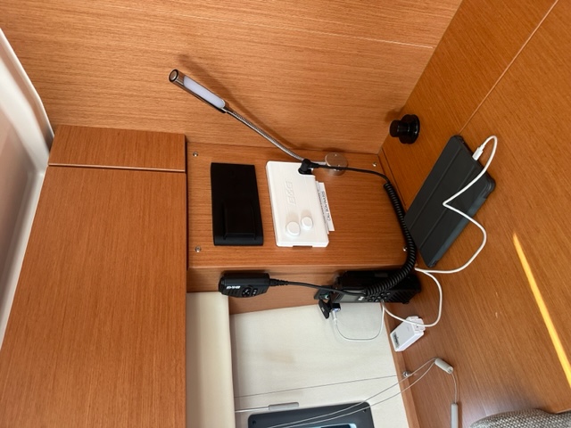 | Navigation | Barometer, Fernglas, GPS mit Kartenplotter, Handpeilkompass, Kompass, Navigationsbesteck, Seekarten, Tridata (Log, Echolot, Windm.), Windmesser |